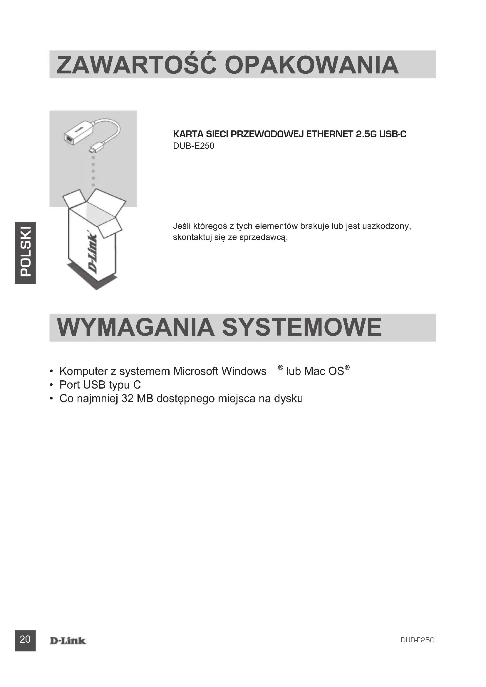 POLSKI KArtA SIECI prZEWodoWEJ EthErnEt 2.5G USB-C DUB-E250 Jeśli któregoś z tych elementów brakuje lub jest uszkodzony, skontaktuj się ze sprzedawcą. ZAWARTOŚĆ OPAKOWANIA WYMAGANIA SYSTEMOWE