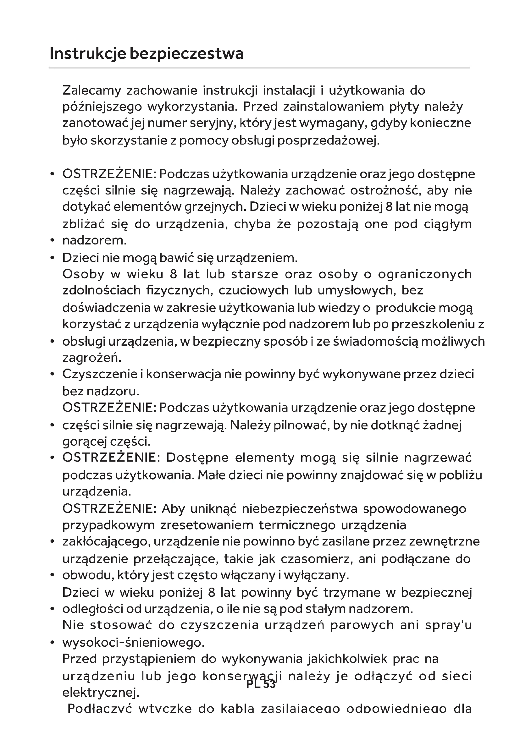 Cuando sea posible, use una tapa para cubrirPL 53 Dzieci nie mogą bawić się urządzeniem. Nie stosować do czyszczenia urządzeń parowych ani spray'u wysokoci-śnieniowego. Zalecamy zachowanie instrukcji instalacji i użytkowania do późniejszego wykorzystania. Przed zainstalowaniem płyty należy zanotować jej numer seryjny, który jest wymagany, gdyby konieczne było skorzystanie z pomocy obsługi posprzedażowej. OSTRZEŻENIE: Podczas użytkowania urządzenie oraz jego dostępne części silnie się nagrzewają. Należy zachować ostrożność, aby nie dotykać elementów grzejnych. Dzieci w wieku poniżej 8 lat nie mogą zbliżać się do urządzenia, chyba że pozostają one pod ciągłym nadzorem. Osoby w wieku 8 lat lub starsze oraz osoby o ograniczonych zdolnościach fizycznych, czuciowych lub umysłowych, bez doświadczenia w zakresie użytkowania lub wiedzy o produkcie mogą korzystać z urządzenia wyłącznie pod nadzorem lub po przeszkoleniu z obsługi urządzenia, w bezpieczny sposób i ze świadomością możliwych zagrożeń. Czyszczenie i konserwacja nie powinny być wykonywane przez dzieci bez nadzoru. OSTRZEŻENIE: Podczas użytkowania urządzenie oraz jego dostępne części silnie się nagrzewają. Należy pilnować, by nie dotknąć żadnej gorącej części. OSTRZEŻENIE: Dostępne elementy mogą się silnie nagrzewać podczas użytkowania. Małe dzieci nie powinny znajdować się w pobliżu urządzenia. OSTRZEŻENIE: Aby uniknąć niebezpieczeństwa spowodowanego przypadkowym zresetowaniem termicznego urządzenia zakłócającego, urządzenie nie powinno być zasilane przez zewnętrzne urządzenie przełączające, takie jak czasomierz, ani podłączane do obwodu, który jest często włączany i wyłączany. Dzieci w wieku poniżej 8 lat powinny być trzymane w bezpiecznej odległości od urządzenia, o ile nie są pod stałym nadzorem. Przed przystąpieniem do wykonywania jakichkolwiek prac na urządzeniu lub jego konserwacji należy je odłączyć od sieci elektrycznej. Podłączyć wtyczkę do kabla zasilającego odpowiedniego dla Instrukcje bezpieczestwa