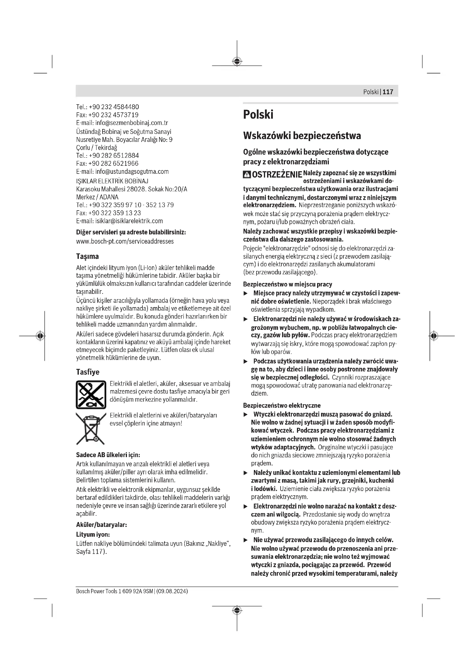 Karasoku Mahallesi 28028. Sokak No:20/A Merkez / ADANA Tel.: +903223599710 -3521379 Fax: +903223591323 E-mail: isiklar@isiklarelektrik.com Diğer servisleri şu adreste bulabilirsiniz: www.bosch-pt.com/serviceaddresses Taşıma Alet içindeki lityum iyon (Li-Ion) aküler tehlikeli madde taşıma yönetmeliği hükümlerine tabidir. Akuler başka bir yukumluluk olmaksızın kullanıcı tarafından caddeler uzerinde taşınabilir. Üçüncü kişiler aracılığıyla yollamada (örneğin hava yolu veya nakliye şirketi ile yollamada) ambalaj ve etiketlemeye ait özel hükümlere uyulmalıdır. Bu konuda gönderi hazırlanırken bir tehlikeli madde uzmanından yardım alınmalıdır. Aküleri sadece gövdeleri hasarsız durumda gönderin. Açık kontakların üzerini kapatınız ve aküyü ambalaj içinde hareket etmeyecek biçimde paketleyiniz. Lutfen olası ek ulusal yönetmelik hukumlerine de uyun. Tasfiye Elektrikli el aletleri, aküler, aksesuar ve ambalaj malzemesi çevre dostu tasfiye amacıyla bir geri dönüşüm merkezine yollanmalıdır. Elektrikli el aletlerini ve aküleri/bataryaları evsel çöplerin içine atmayın! Sadece AB ülkeleri için: Artık kullanılmayan ve arızalı elektrikli el aletleri veya kullanılmış aküler/piller ayrı olarak imha edilmelidir. Belirtilen toplama sistemlerini kullanın. Atık elektrikli ve elektronik ekipmanlar, uygunsuz şekilde bertaraf edildikleri takdirde, olası tehlikeli maddelerin varlığı nedeniyle çevre ve insan sağlığı üzerinde zararlı etkilere yol açabilir. Aküler/bataryalar: Lityum iyon: Lütfen nakliye bölümündeki talimata uyun (Bakınız „Nakliye“, Sayfa117). Polski Wskazówki bezpieczeństwa Ogólne wskazówki bezpieczeństwa dotyczące pracy z elektronarzędziami OSTRZEŻENIE Należy zapoznać się ze wszystkimi ostrzeżeniami i wskazówkami do- tyczącymi bezpieczeństwa użytkowania oraz ilustracjami i danymi technicznymi, dostarczonymi wraz z niniejszym elektronarzędziem. Nieprzestrzeganie poniższych wskazó- wek może stać się przyczyną porażenia prądem elektrycz- nym, pożaru i/lub poważnych obrażeń ciała. Należy zachować wszystkie przepisy i wskazówki bezpie- czeństwa dla dalszego zastosowania. Pojęcie "elektronarzędzie" odnosi się do elektronarzędzi za- silanych energią elektryczną z sieci (z przewodem zasilają- cym) i do elektronarzędzi zasilanych akumulatorami (bezprzewodu zasilającego). Bezpieczeństwo w miejscu pracy u Miejsce pracy należy utrzymywać w czystości i zapew- nić dobre oświetlenie. Nieporządek i brak właściwego oświetlenia sprzyjają wypadkom. u Elektronarzędzi nie należy używać w środowiskach za- grożonym wybuchem, np. w pobliżu łatwopalnych cie- czy, gazów lub pyłów. Podczas pracy elektronarzędziem wytwarzają się iskry, które mogą spowodować zapłon py- łów lub oparów. u Podczas użytkowania urządzenia należy zwrócić uwa- gę na to, aby dzieci i inne osoby postronne znajdowały się w bezpiecznej odległości. Czynniki rozpraszające mogą spowodować utratę panowania nad elektronarzę- dziem. Bezpieczeństwo elektryczne u Wtyczki elektronarzędzi muszą pasować do gniazd. Nie wolno w żadnej sytuacji i w żaden sposób modyfi- kować wtyczek. Podczas pracy elektronarzędziami z uziemieniem ochronnym nie wolno stosować żadnych wtyków adaptacyjnych. Oryginalne wtyczki i pasujące do nich gniazda sieciowe zmniejszają ryzyko porażenia prądem. u Należy unikać kontaktu z uziemionymi elementami lub zwartymi z masą, takimi jak rury, grzejniki, kuchenki ilodówki. Uziemienie ciała zwiększa ryzyko porażenia prądem elektrycznym. u Elektronarzędzi nie wolno narażać na kontakt z desz- czem ani wilgocią. Przedostanie się wody do wnętrza obudowy zwiększa ryzyko porażenia prądem elektrycz- nym. u Nie używać przewodu zasilającego do innych celów. Nie wolno używać przewodu do przenoszenia ani prze- suwania elektronarzędzia; nie wolno też wyjmować wtyczki z gniazda, pociągając za przewód. Przewód należy chronić przed wysokimi temperaturami, należy Bosch Power Tools 1 609 92A 9SM | (09.08.2024)118 | Polski go trzymać zdala od oleju, ostrych krawędzi i rucho- mych części urządzenia. Uszkodzone lub splątane prze- wody zwiększają ryzyko porażenia prądem elektrycznym. u Używając elektronarzędzia na świeżym powietrzu, na- leży upewnić się, że przedłużacz jest przeznaczony do pracy na zewnątrz. Użycie przedłużacza przeznaczone- go do pracy na zewnątrz zmniejsza ryzyko porażenia prą- dem elektrycznym. u Jeżeli nie ma innej możliwości, niż użycie elektrona- rzędzia w wilgotnym otoczeniu, należy podłączyć je do źródła zasilania wyposażonego w wyłącznik ochronny różnicowoprądowy. Zastosowanie wyłącznika ochron- nego różnicowoprądowego zmniejsza ryzyko porażenia prądem elektrycznym. Bezpieczeństwo osób u Podczas pracy z elektronarzędziem należy zachować czujność, każdą czynność wykonywać ostrożnie i z rozwagą. Nie przystępować do pracy elektronarzę- dziem w stanie zmęczenia lub będąc pod wpływem narkotyków, alkoholu lub leków. Chwila nieuwagi pod- czas pracy może grozić bardzo poważnymi obrażeniami ciała. u Stosować środki ochrony osobistej. Należy zawsze nosić okulary ochronne. Środki ochrony osobistej, np. maska przeciwpyłowa, antypoślizgowe obuwie, kask ochronny czy ochraniacze na uszy, w określonych warun- kach pracy obniżają ryzyko obrażeń ciała. u Należy unikać niezamierzonego uruchomienia narzę- dzia. Przed podłączeniem elektronarzędzia do źródła zasilania i/lub podłączeniem akumulatora, podniesie- niem albo transportem urządzenia, należy upewnić się, że włącznik elektronarzędzia znajduje się w pozy- cji wyłączonej. Przenoszenie elektronarzędzia z palcem opartym na włączniku/wyłączniku lub włożenie do gniaz- da sieciowego wtyczki włączonego narzędzia, może stać się przyczyną wypad