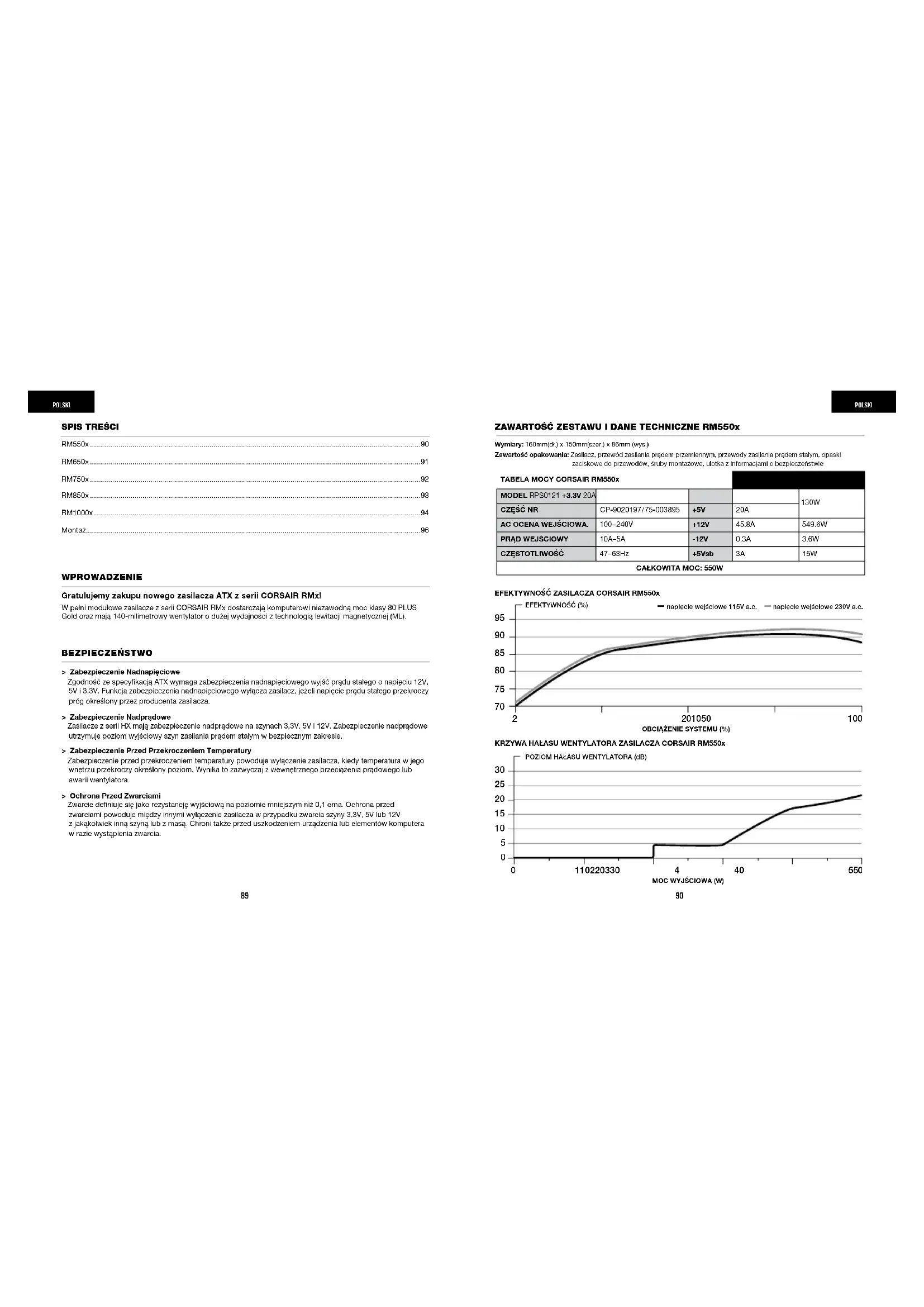 EFEKTYWNOŚĆ ZASILACZA CORSAIR RM1000xEFEKTYWNOŚĆ ZASILACZA CORSAIR RM850x Wymiary: 180mm(dł.) x 150mm(szer.) x 86mm (wys.) Zawartość opakowania: Zasilacz, przewód zasilania prądem przemiennym, przewody zasilania prądem stałym, opaski zaciskowe do przewodów, śruby montażowe, ulotka z informacjami o bezpieczeństwie Wymiary: 160mm(dł.) x 150mm(szer.) x 86mm (wys.) Zawartość opakowania: Zasilacz, przewód zasilania prądem przemiennym, przewody zasilania prądem stałym, opaski zaciskowe do przewodów, śruby montażowe, ulotka z informacjami o bezpieczeństwie ZAWARTOŚĆ ZESTAWU I DANE TECHNICZNE RM1000x napięcie wejściowe 115V a.c. napięcie wejściowe 230V a.c.napięcie wejściowe 115V a.c. napięcie wejściowe 230V a.c.95 96 POLSKIPOLSKI MONTAŻ NOWEGO ZASILACZA Z SERII RMx Krok 1: Demontaż dotychczasowego zasilacza OSTRZEŻENIE! W celu zapewnienia prawidłowego działania należy używać tylko przewodów zasilania prądem stałym (DC) znajdujących się w komplecie z nowym zasilaczem, chyba że stare przewody są oryginalnym produktem CORSAIR tego samego typu. Przed użyciem dotychczasowych przewodów należy się upewnić, czy są tego samego typu. W przypadku składania nowego komputera należy przejść do kroku 2: