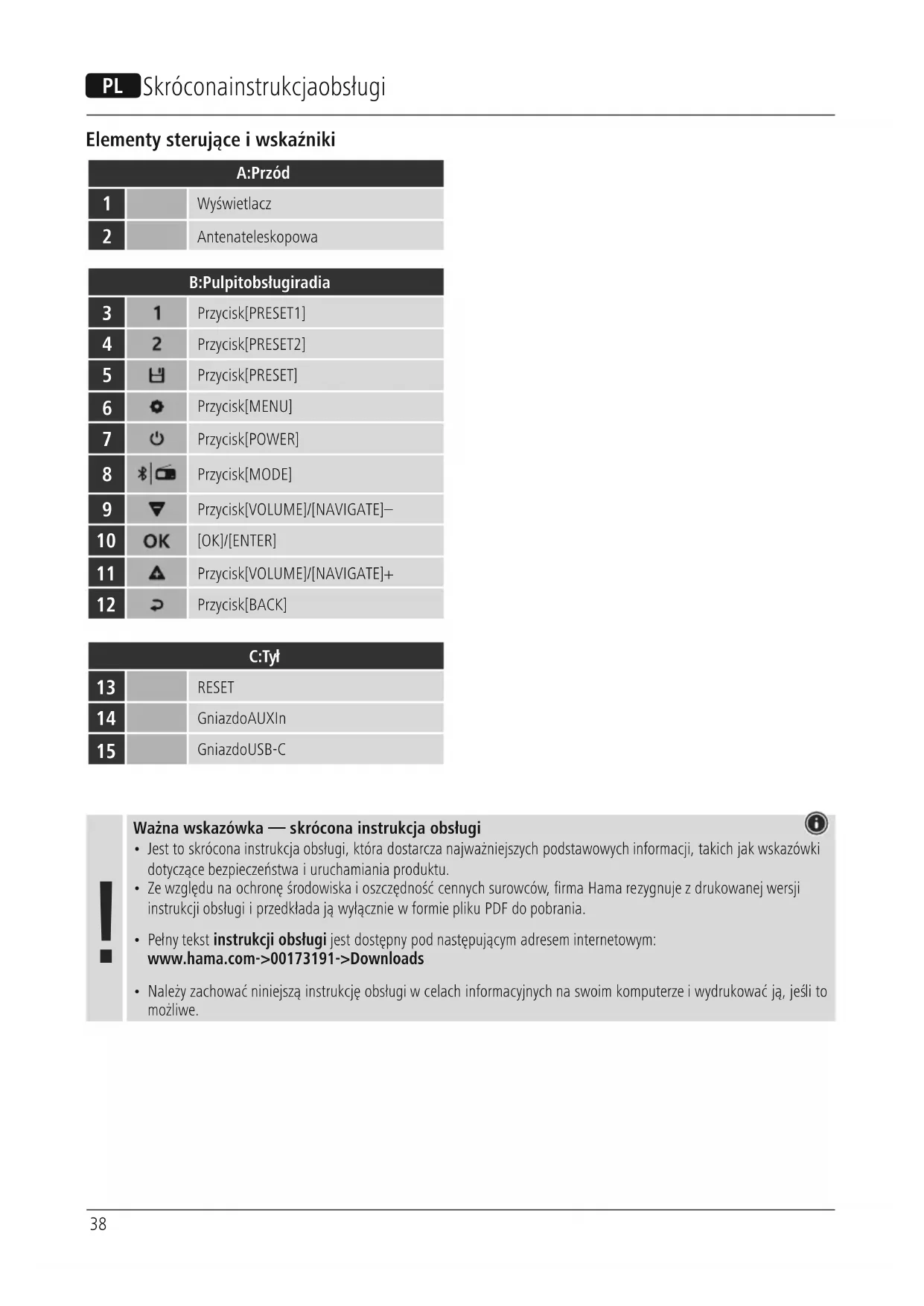- Pełny tekst instrukcji obsługi jest dostępny pod następującym adresem internetowym: www.hama.com -> 00173191 -> Downloads