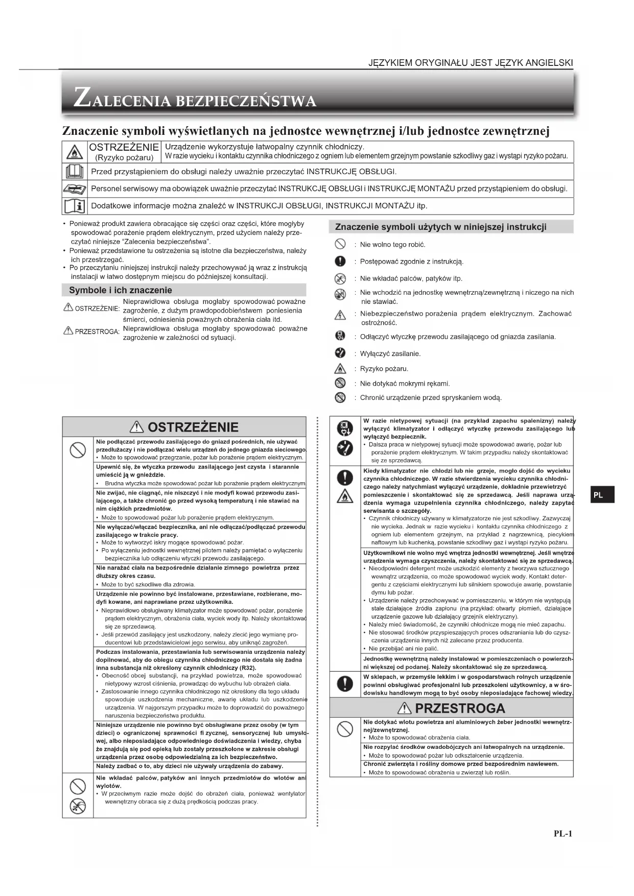 OSTRZEŻENIE Nie podłączać przewodu zasilającego do gniazd pośrednich, nie używać przedłużaczy i nie podłączać wielu urządzeń do jednego gniazda sieciowego.• Może to spowodować przegrzanie, pożar lub porażenie prądem elektrycznym.Upewnić się, że wtyczka przewodu zasilającego jest czysta i starannie umieścić ją w gnieździe. Brudna wtyczka może spowodować pożar lub porażenie prądem elektrycznym.Nie zwijać, nie ciągnąć, nie niszczyć i nie modyfi kować przewodu zasi-lającego, a także chronić go przed wysoką temperaturą i nie stawiać na nim ciężkich przedmiotów.• Może to spowodować pożar lub porażenie prądem elektrycznym.Nie wyłączać/włączać bezpiecznika, ani nie odłączać/podłączać przewodu zasilającego w trakcie pracy.• Może to wytworzyć iskry mogące spowodować pożar.• Po wyłączeniu jednostki wewnętrznej pilotem należy pamiętać o wyłączeniu bezpiecznika lub odłączeniu wtyczki przewodu zasilającego. Nie narażać ciała na bezpośrednie działanie zimnego powietrza przez dłuższy okres czasu.• Może to być szkodliwe dla zdrowia.Urządzenie nie powinno być instalowane, przestawiane, rozbierane, mo-dyfi kowane, ani naprawiane przez użytkownika.• Nieprawidłowo obsługiwany klimatyzator może spowodować pożar, porażenie prądem elektrycznym, obrażenia ciała, wyciek wody itp. Należy skontaktować się ze sprzedawcą.• Jeśli przewód zasilający jest uszkodzony, należy zlecić jego wymianę pro-ducentowi lub przedstawicielowi jego serwisu, aby uniknąć zagrożeń.Podczas instalowania, przestawiania lub serwisowania urządzenia należy dopilnować, aby do obiegu czynnika chłodniczego nie dostała się żadna inna substancja niż określony czynnik chłodniczy (R32).• Obecność obcej substancji, na przykład powietrza, może spowodować nietypowy wzrost ciśnienia, prowadząc do wybuchu lub obrażeń ciała.• Zastosowanie innego czynnika chłodniczego niż określony dla tego układu spowoduje uszkodzenia mechaniczne, awarię układu lub uszkodzenie urządzenia. W najgorszym przypadku może to doprowadzić do poważnego naruszenia bezpieczeństwa produktu.Niniejsze urządzenie nie powinno być obsługiwane przez osoby (w tym dzieci) o ograniczonej sprawności fi zycznej, sensorycznej lub umysło-wej, albo nieposiadające odpowiedniego doświadczenia i wiedzy, chyba że znajdują się pod opieką lub zostały przeszkolone w zakresie obsługi urządzenia przez osobę odpowiedzialną za ich bezpieczeństwo.Należy zadbać o to, aby dzieci nie używały urządzenia do zabawy. Nie wkładać palców, patyków ani innych przedmiotów do wlotów ani wylotów.• W przeciwnym razie może dojść do obrażeń ciała, ponieważ wentylator wewnętrzny obraca się z dużą prędkością podczas pracy. W razie nietypowej sytuacji (na przykład zapachu spalenizny) należy wyłączyć klimatyzator i odłączyć wtyczkę przewodu zasilającego lub wyłączyć bezpiecznik.• Dalsza praca w nietypowej sytuacji może spowodować awarię, pożar lub porażenie prądem elektrycznym. W takim przypadku należy skontaktować się ze sprzedawcą. Kiedy klimatyzator nie chłodzi lub nie grzeje, mogło dojść do wycieku czynnika chłodniczego. W razie stwierdzenia wycieku czynnika chłodni-czego należy natychmiast wyłączyć urządzenie, dokładnie przewietrzyć pomieszczenie i skontaktować się ze sprzedawcą. Jeśli naprawa urzą-dzenia wymaga uzupełnienia czynnika chłodniczego, należy zapytać serwisanta o szczegóły.• Czynnik chłodniczy używany w klimatyzatorze nie jest szkodliwy. Zazwyczaj nie wycieka. Jednak w razie wycieku i kontaktu czynnika chłodniczego z ogniem lub elementem grzejnym, na przykład z nagrzewnicą, piecykiem naftowym lub kuchenką, powstanie szkodliwy gaz i wystąpi ryzyko pożaru.Użytkownikowi nie wolno myć wnętrza jednostki wewnętrznej. Jeśli wnętrze urządzenia wymaga czyszczenia, należy skontaktować się ze sprzedawcą.• Nieodpowiedni detergent może uszkodzić elementy z tworzywa sztucznego wewnątrz urządzenia, co może spowodować wyciek wody. Kontakt deter-gentu z częściami elektrycznymi lub silnikiem spowoduje awarię, powstanie dymu lub pożar.• Urządzenie należy przechowywać w pomieszczeniu, w którym nie występują stale działające źródła zapłonu (na przykład: otwarty płomień, działające urządzenie gazowe lub działający grzejnik elektryczny).• Należy mieć świadomość, że czynniki chłodnicze mogą nie mieć zapachu.• Nie stosować środków przyspieszających proces odszraniania lub do czysz-czenia urządzenia innych niż zalecane przez producenta. • Nie przebijać ani nie palić.Jednostkę wewnętrzną należy instalować w pomieszczeniach o powierzch-ni większej od podanej. Należy skontaktować się ze sprzedawcą.W sklepach, w przemyśle lekkim i w gospodarstwach rolnych urządzenie powinni obsługiwać profesjonalni lub przeszkoleni użytkownicy, a w śro-dowisku handlowym mogą to być osoby nieposiadające fachowej wiedzy. PRZESTROGA Nie dotykać wlotu powietrza ani aluminiowych żeber jednostki wewnętrz-nej/zewnętrznej.• Może to spowodować obrażenia ciała.Nie rozpylać środków owadobójczych ani łatwopalnych na urządzenie.• Może to spowodować pożar lub odkształcenie urządzenia.Chronić zwierzęta i rośliny domowe przed bezpośrednim nawiewem.• Może to spowodować obrażenia u zwierząt lub roślin. Znaczenie symboli wyświetlanych na jednostce wewnętrznej i/lub jednostce zewnętrznej OSTRZEŻENIE (Ryzyko pożaru)Urządzenie wykorzystuje łatwopalny czynnik chłodniczy. W razie wycieku i kontaktu czynnika chłodniczego z ogniem lub elementem grzejnym powstanie szkodliwy gaz i wystąpi ryzyko pożaru. Przed przystąpieniem do obsługi należy uważnie przeczytać INSTRUKCJĘ OBSŁUGI. Personel serwisowy ma obowiązek uważnie przeczytać INSTRUKCJĘ OBSŁUGI i INSTRUKCJĘ MONTAŻU przed przy