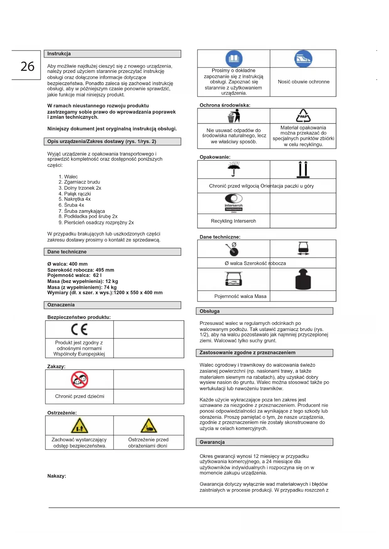 W przypadku brakujących lub uszkodzonych części zakresu dostawy prosimy o kontakt ze sprzedawcą. Dane techniczne Ø walca: 400 mm Szerokość robocza: 495 mm Pojemność walca: 62 l Masa (bez wypełnienia): 12 kg Masa (z wypełnieniem): 74 kg Wymiary (dł. x szer. x wys.):1200 x 550 x 400 mm Oznaczenia Bezpieczeństwo produktu: Produkt jest zgodny z odnośnymi normami Wspólnoty Europejskiej Zakazy: Chronić przed dziećmi Ostrzeżenie: Zachować wystarczający odstęp bezpieczeństwa. Ostrzeżenie przed obrażeniami dłoni Nakazy: Prosimy o dokładne zapoznanie się z instrukcją obsługi. Zapoznać się starannie z użytkowaniem urządzenia. Nosić obuwie ochronne Ochrona środowiska: Nie usuwać odpadów do środowiska naturalnego, lecz we właściwy sposób. Materiał opakowania można przekazać do specjalnych punktów zbiórki w celu recyklingu. Opakowanie: Chronić przed wilgocią Orientacja paczki u góry Recykling Interseroh Dane techniczne: Ø walca Szerokość robocza Pojemność walca Masa Obsługa Przesuwać walec w regularnych odcinkach po walcowanym podłożu. Tak ustawić zgarniacz brudu (rys. 1/2), aby na walcu pozostawało jak najmniej przyczepionej ziemi. Walcować tylko suchy grunt. Zastosowanie zgodne z przeznaczeniem Walec ogrodowy i trawnikowy do walcowania świeżo zasianej powierzchni (np. nasionami trawy, a także materiałem siewnym na rabatach), aby uzyskać dobry wysiew nasion do gruntu. Walec można stosować także po wertukulacji lub nawożeniu trawników. Każde użycie wykraczające poza ten zakres jest uznawane za niezgodne z przeznaczeniem. Producent nie ponosi odpowiedzialności za wynikające z tego szkody lub obrażenia. Proszę pamiętać o tym, że nasze urządzenia, zgodnie z przeznaczeniem nie zostały skonstruowane do użycia w celach komercyjnych. Gwarancja Okres gwarancji wynosi 12 miesięcy w przypadku użytkowania komercyjnego, a 24 miesiące dla użytkowników indywidualnych i rozpoczyna się on w momencie zakupu urządzenia. Gwarancja dotyczy wyłącznie wad materiałowych i błędów zaistniałych w procesie produkcji. W przypadku roszczeń z27 powodu wady towaru należy, zgodnie z warunkami gwarancji, przedstawić dowód zakupu z datą sprzedaży. Gwarancja nie obejmuje niewłaściwego używania, np.: przeciążenia urządzenia, zastosowania z użyciem siły zewnętrznej, uszkodzeń na skutek działania czynników zewnętrznych lub przez ciała obce, nieprzestrzegania instrukcji obsługi i montażu oraz zwykłego zużycia. Postępowanie w nagłym przypadku W przypadku obrażeń udzielić pierwszej pomocy w niezbędnym zakresie i możliwie jak najszybciej wezwać fachową pomoc lekarską. Zabezpieczyć poszkodowanego przed dalszymi obrażeniami i unieruchomić go. Zgodnie z normą DIN 13164 w miejscu pracy powinna być zawsze pod ręką apteczka, jeśli ewentualnie dojdzie do wypadku. Materiał wyjęty z apteczki należy natychmiast uzupełnić. W przypadku wezwania pomocy należy podać następujące informacje: