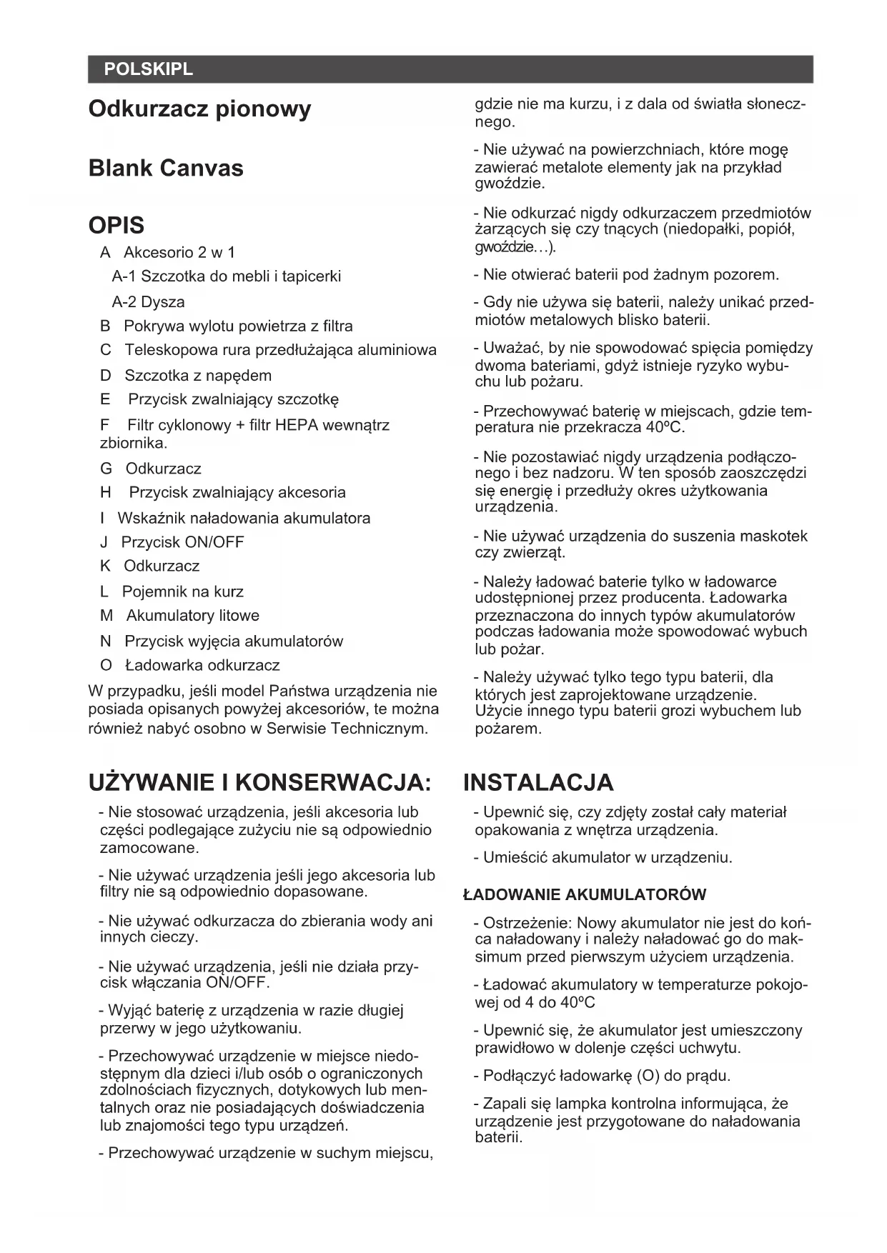 - Doplňky (například ltry, atd) pro váš model přístroje je k dostání od distributorů a v autori- zovaných obchodech. - Vždy používejte originální náhradní příslušen- ství, určené speciálně pro váš model spotře- biče. - Toto příslušenství je dostupné ve specializova- ných obchodech. JAK VYJMOUT BATERIE Z PŘÍSTROJE: - UPOZORNĚNÍ: Je důležité, aby baterie byly před jejich vyjmutím z přístroje zcela vybité. - UPOZORNĚNÍ: Přístroj je nutné odpojit od elektrického přívodu při vyjmutí baterie. - Při vyjímání baterií, po skončení životnosti přístroje, postupujte následovně: - Stisknutím tlačítka vyjměte baterii z těla vysa- vače. (Fig. 8)POLSKI PL Odkurzacz pionowy Blank Canvas OPIS A Akcesorio 2 w 1 A-1 Szczotka do mebli i tapicerki A-2 Dysza B Pokrywa wylotu powietrza z ltra C Teleskopowa rura przedłużająca aluminiowa D Szczotka z napędem E Przycisk zwalniający szczotkę F Filtr cyklonowy + ltr HEPA wewnątrz zbiornika. G Odkurzacz H Przycisk zwalniający akcesoria I Wskaźnik naładowania akumulatora J Przycisk ON/OFF K Odkurzacz L Pojemnik na kurz M Akumulatory litowe N Przycisk wyjęcia akumulatorów O Ładowarka odkurzacz W przypadku, jeśli model Państwa urządzenia nie posiada opisanych powyżej akcesoriów, te można również nabyć osobno w Serwisie Technicznym. UŻYWANIE I KONSERWACJA: - Nie stosować urządzenia, jeśli akcesoria lub części podlegające zużyciu nie są odpowiednio zamocowane. - Nie używać urządzenia jeśli jego akcesoria lub ltry nie są odpowiednio dopasowane. - Nie używać odkurzacza do zbierania wody ani innych cieczy. - Nie używać urządzenia, jeśli nie działa przy- cisk włączania ON/OFF. - Wyjąć baterię z urządzenia w razie długiej przerwy w jego użytkowaniu. - Przechowywać urządzenie w miejsce niedo- stępnym dla dzieci i/lub osób o ograniczonych zdolnościach zycznych, dotykowych lub men- talnych oraz nie posiadających doświadczenia lub znajomości tego typu urządzeń. - Przechowywać urządzenie w suchym miejscu, gdzie nie ma kurzu, i z dala od światła słonecz- nego. - Nie używać na powierzchniach, które mogę zawierać metalote elementy jak na przykład gwoździe. - Nie odkurzać nigdy odkurzaczem przedmiotów żarzących się czy tnących (niedopałki, popiół, gwoździe…). - Nie otwierać baterii pod żadnym pozorem. - Gdy nie używa się baterii, należy unikać przed- miotów metalowych blisko baterii. - Uważać, by nie spowodować spięcia pomiędzy dwoma bateriami, gdyż istnieje ryzyko wybu- chu lub pożaru. - Przechowywać baterię w miejscach, gdzie tem- peratura nie przekracza 40ºC. - Nie pozostawiać nigdy urządzenia podłączo- nego i bez nadzoru. W ten sposób zaoszczędzi się energię i przedłuży okres użytkowania urządzenia. - Nie używać urządzenia do suszenia maskotek czy zwierząt. - Należy ładować baterie tylko w ładowarce udostępnionej przez producenta. Ładowarka przeznaczona do innych typów akumulatorów podczas ładowania może spowodować wybuch lub pożar. - Należy używać tylko tego typu baterii, dla których jest zaprojektowane urządzenie. Użycie innego typu baterii grozi wybuchem lub pożarem. INSTALACJA - Upewnić się, czy zdjęty został cały materiał opakowania z wnętrza urządzenia. - Umieścić akumulator w urządzeniu.