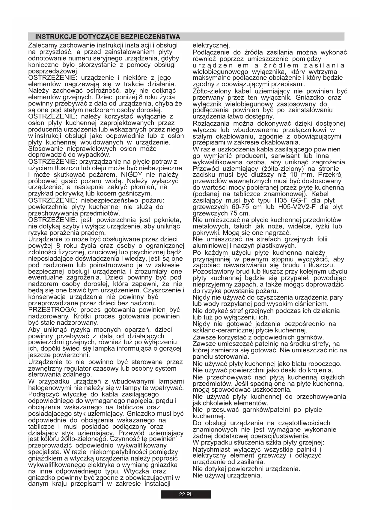 INSTALACJA URZĄDZENIA DOMOWEGO MOŻE BYĆ SKOMPLIKOWANĄ OPERACJĄ, KTÓRA JEŻELI NIE BĘDZIE WYKONANA PRAWIDŁOWO, MOŻE POWAŻNIE ZAGROZIĆ BEZPIECZEŃSTWU UŻYTKOWNIKA. DLATEGO TEŻ, ZADANIE TO POWINNO BYĆ WYKONANE PRZEZ OSOBĘ O ODPOWIEDNICH KWALIFIKACJACH ORAZ ZGODNIE Z OBOWIĄZUJĄCYMI PRZEPISAMI. W PRZYPADKU ZIGNOROWANIA NINIEJSZEGO ZALECENIA I WYKONANIA INSTALACJI PRZEZ OSOBĘ BEZ ODPOWIEDNICH KWALIFIKACJI, PRODUCENT NIE PONOSI ŻADNEJ ODPOWIEDZIALNOŚCI ZA JAKIEKOLWIEK USTERKI TECHNICZNE, BEZ WZGLĘDU NA TO, CZY SPOWODUJĄ ONE SZKODY W MIENIU, CZY TEŻ USZKODZENIA CIAŁA U LUDZI. Sprawdzić na tabliczce znamionowej dane dotyczące podłączenia do sieci elektrycznej oraz upewnić się, że kabel zasilający jest typu 3x0.75 mm² H05 GG-F dla płyt grzewczych 60-75 cm lub H05-V2V2- F dla płyt grzewczych 75 cm.
