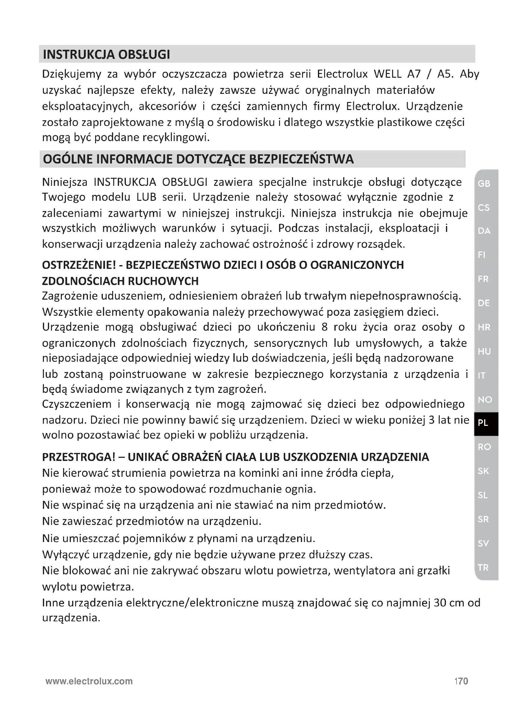 Dziękujemy za wybór oczyszczacza powietrza serii Electrolux WELL A7 / A5. Aby uzyskać najlepsze efekty, należy zawsze używać oryginalnych materiałów eksploatacyjnych, akcesoriów i części zamiennych firmy Electrolux. Urządzenie zostało zaprojektowane z myślą o środowisku i dlatego wszystkie plastikowe części mogą być poddane recyklingowi. OGÓLNE INFORMACJE DOTYCZĄCE BEZPIECZEŃSTWA