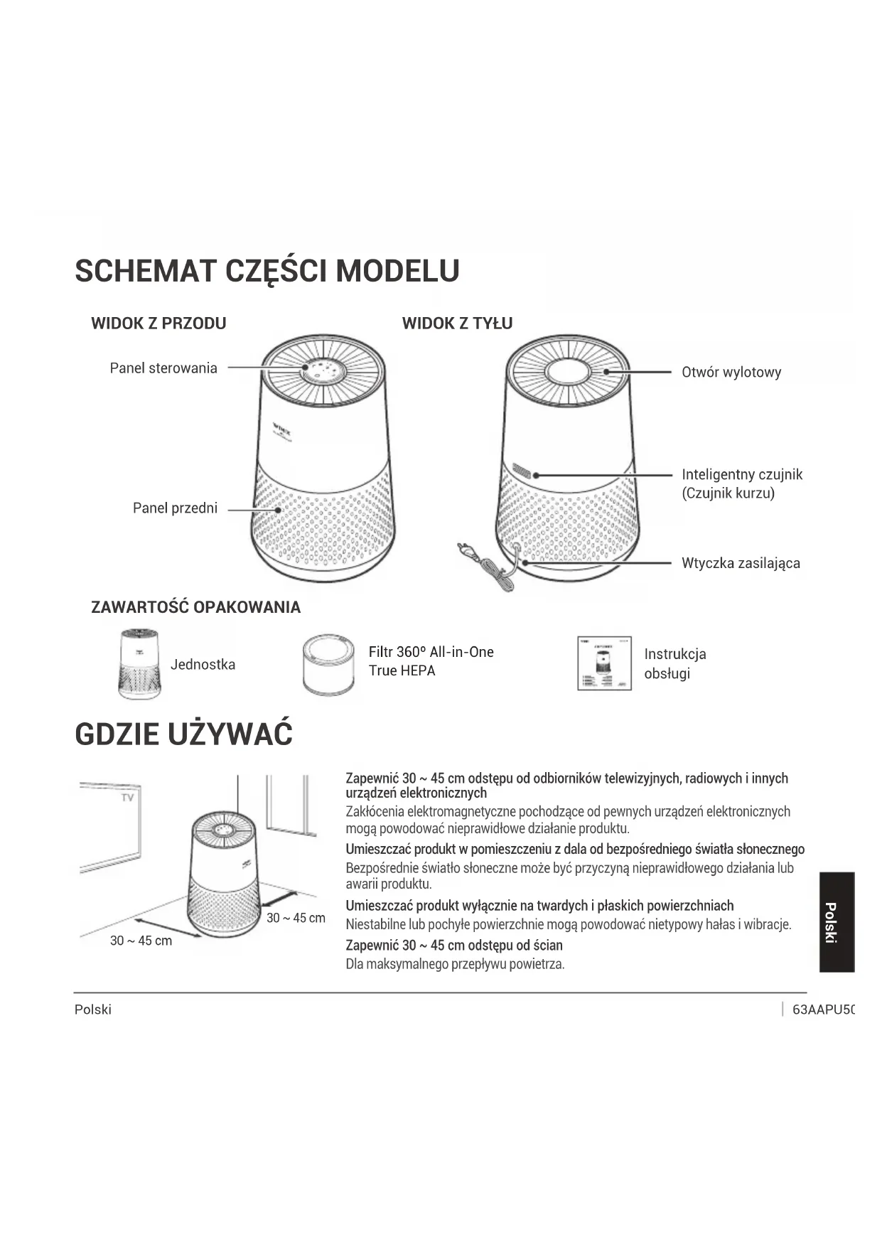 Jednostka Filtr 360º All-in-One True HEPA Instrukcja obsługi 30 ~ 45 cm 30 ~ 45 cm PolskiPolski Polski 64 AAPU500-JLE