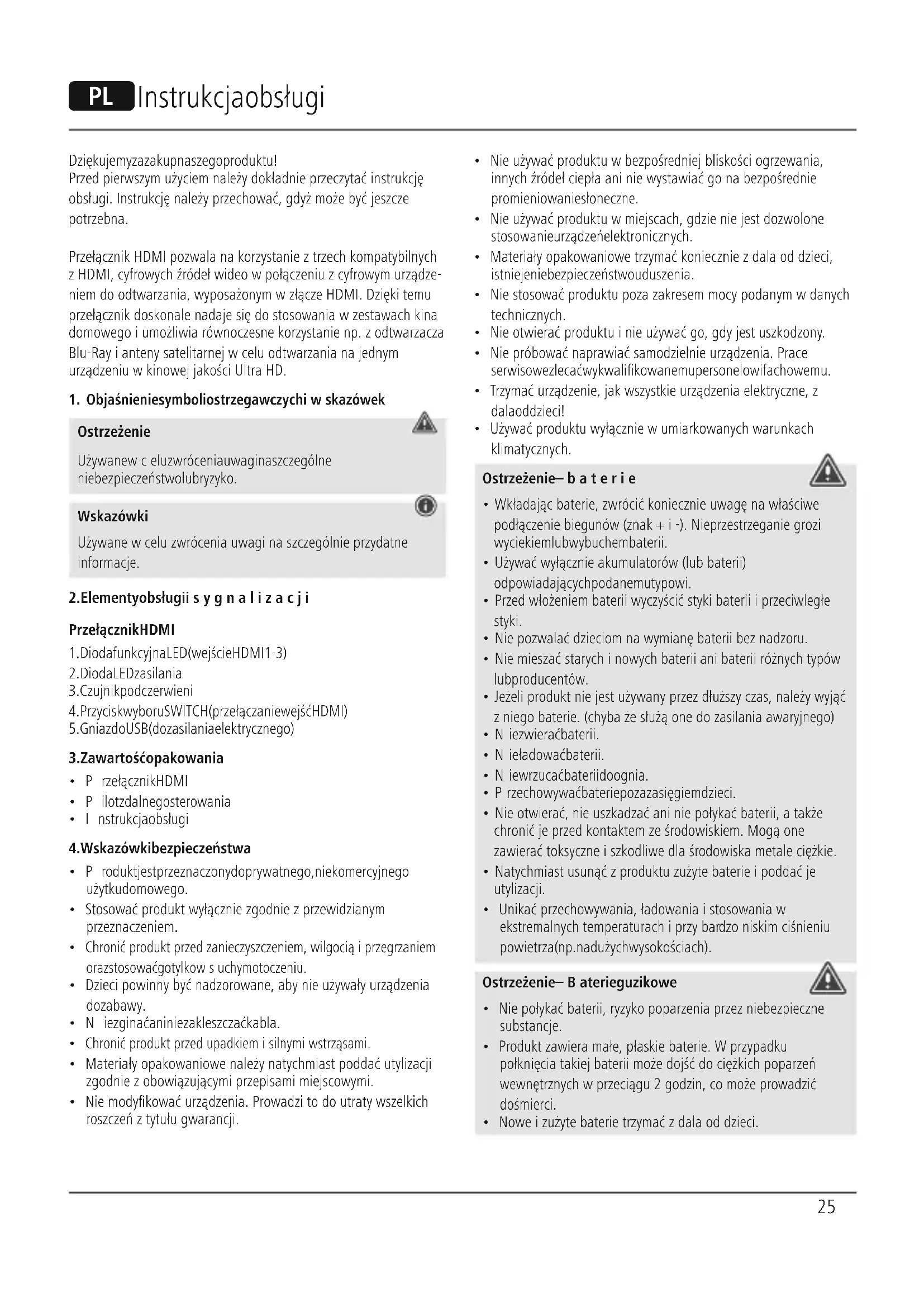 - Używać produktu wyłącznie wumiarkowanych warunkach klimatycznych. Ostrzeżenie –baterie