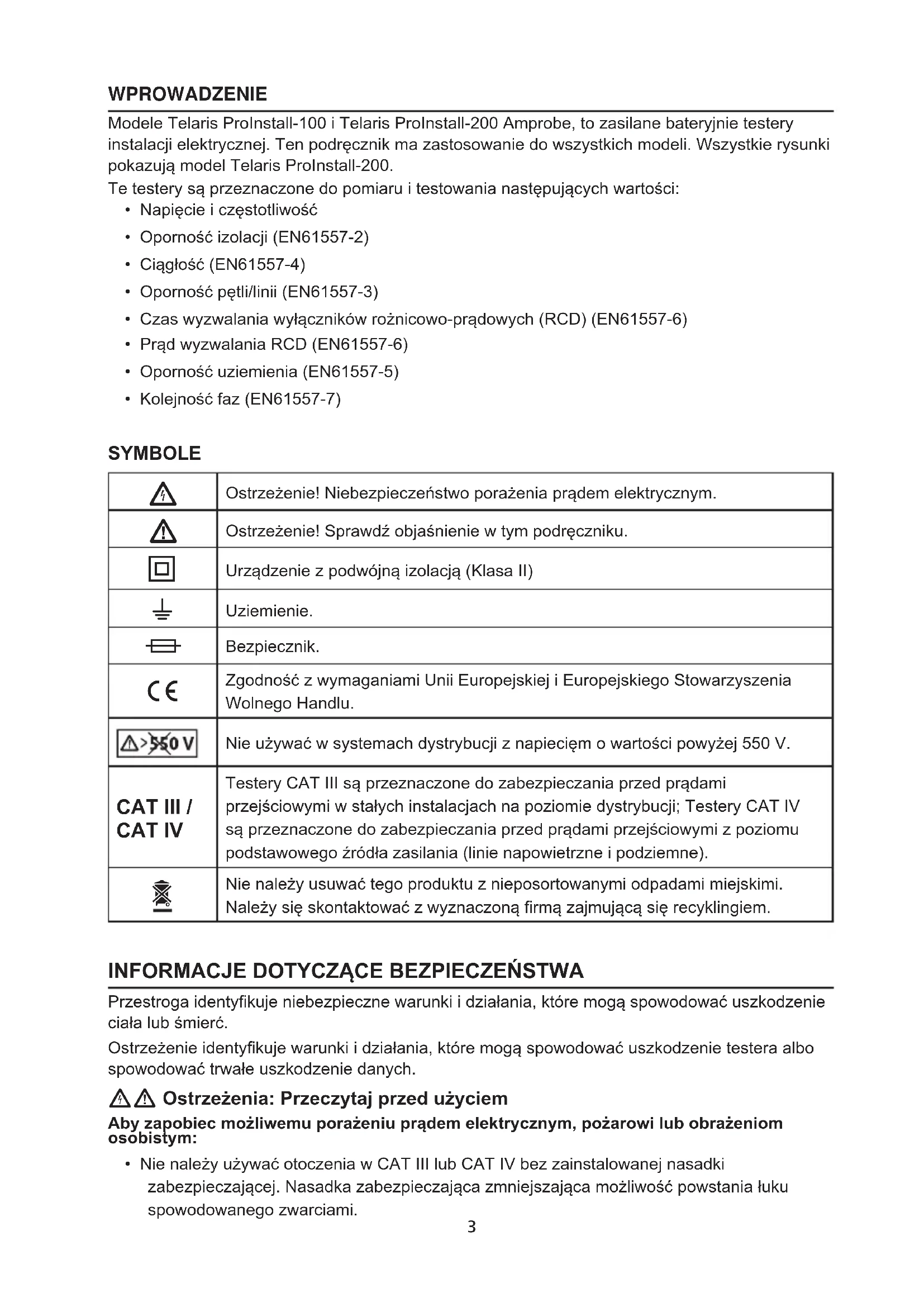 WPROWADZENIEModele Telaris ProInstall-100 i Telaris ProInstall-200 Amprobe, to zasilane bateryjnie testery instalacji elektrycznej. Ten podręcznik ma zastosowanie do wszystkich modeli. Wszystkie rysunki pokazują model Telaris ProInstall-200.Te testery są przeznaczone do pomiaru i testowania następujących wartości:• Napięcie i częstotliwość• Oporność izolacji (EN61557-2)• Ciągłość (EN61557-4)• Oporność pętli/linii (EN61557-3)• Czas wyzwalania wyłączników rożnicowo-prądowych (RCD) (EN61557-6)• Prąd wyzwalania RCD (EN61557-6)• Oporność uziemienia (EN61557-5)• Kolejność faz (EN61557-7)SYMBOLE Ostrzeżenie! Niebezpieczeństwo porażenia prądem elektrycznym. Ostrzeżenie! Sprawdź objaśnienie w tym podręczniku. Urządzenie z podwójną izolacją (Klasa II) Uziemienie. Bezpiecznik. Zgodność z wymaganiami Unii Europejskiej i Europejskiego Stowarzyszenia Wolnego Handlu.Nie używać w systemach dystrybucji z napiecięm o wartości powyżej 550 V.CAT III / CAT IVTestery CAT III są przeznaczone do zabezpieczania przed prądami przejściowymi w stałych instalacjach na poziomie dystrybucji; Testery CAT IV są przeznaczone do zabezpieczania przed prądami przejściowymi z poziomu podstawowego źródła zasilania (linie napowietrzne i podziemne). Nie należy usuwać tego produktu z nieposortowanymi odpadami miejskimi. Należy się skontaktować z wyznaczoną rmą zajmującą się recyklingiem.