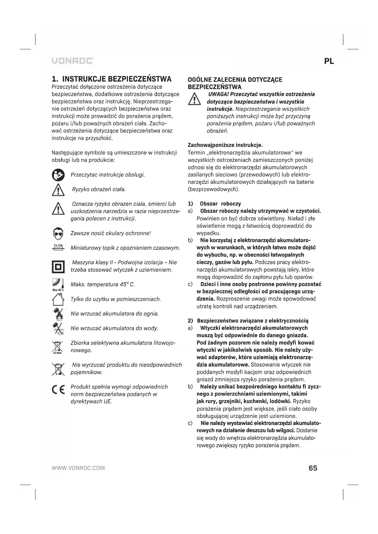 a) Nie otwierać akumulatora. Ryzyko zwarcia. b) Chronić akumulator przed gorącem, np. Dłu- gotrwałym silnym nasłonecznieniem, ogniem, wodą i wilgocią. Ryzyko wybuchu. c) W razie uszkodzenia i błędnego użytkowania akumulatora, może dojść do emisji oparow. Przewietrzyć miejsce emisji i uzyskać pomoc lekarską w razie dolegliwości. Opary mogą powodować podrażnienie układu oddechowego. d) Używać akumulatora wyłącznie w połączeniu z produktem marki Vonroc. Takie postępowanie chroni akumulator przed niebezpiecznym prze- ciążeniem. e) Akumulator może zostać uszkodzony przez ostro zakończone przedmioty, jak gwoździe lub wkrętaki, albo przez uderzenie z zewnątrz. Może dojść do wewnętrznego zwarcia i akumu- lator może zacząć się palić, dymić, wybuchnąć lub przegrzać się.