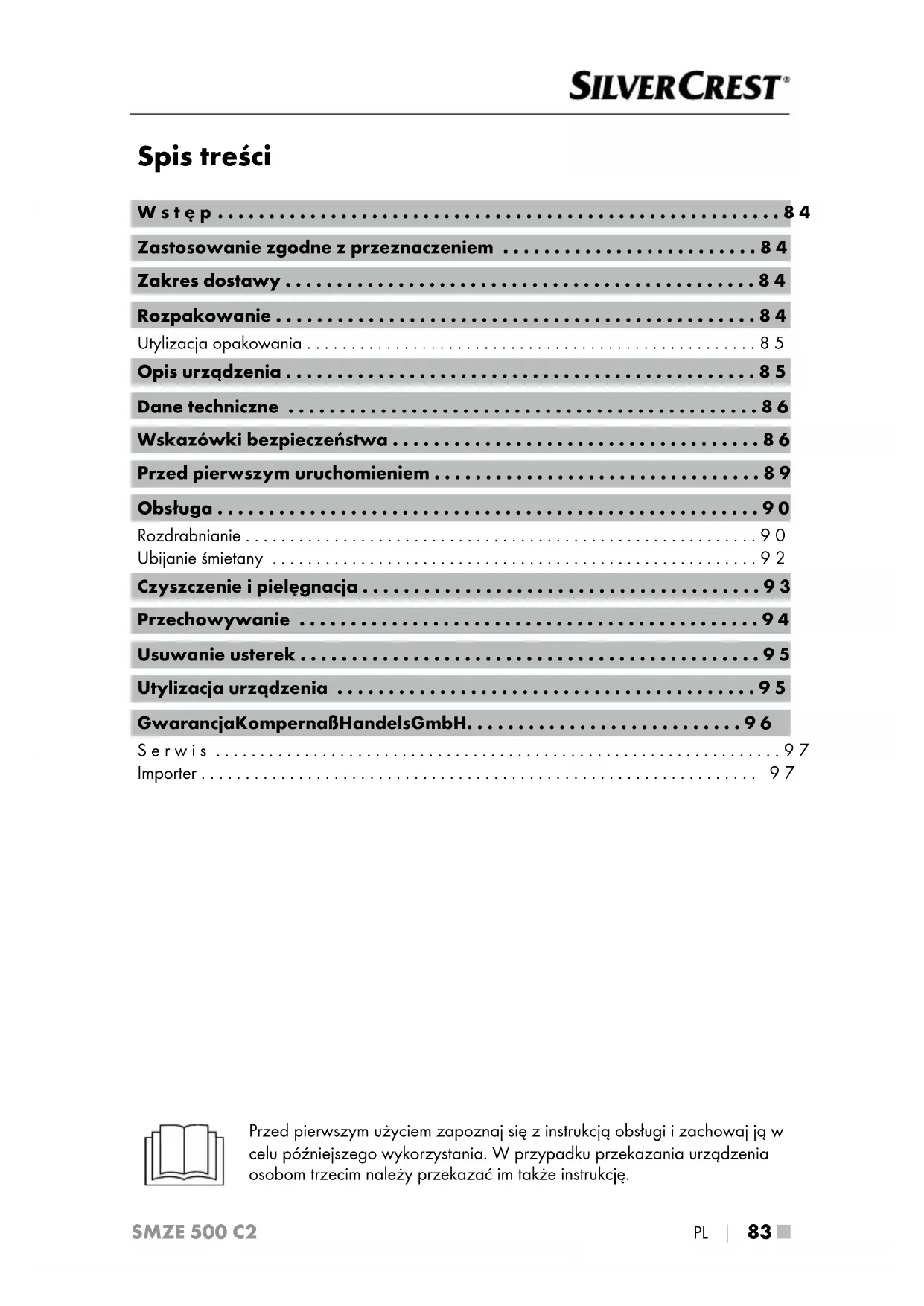 - Importer Przed pierwszym użyciem zapoznaj się z instrukcją obsługi i zachowaj ją w celu późniejszego wykorzystania. W przypadku przekazania urządzenia osobom trzecim należy przekazać im także instrukcję.■ 84 │ PL SMZE 500 C2 Wstęp Gratulujemy zakupu nowego urządzenia! Jest to nowoczesny i wartościowy produkt. Instrukcja obsługi jest częścią składową produktu. Zawiera ona ważne informacje na temat bezpieczeństwa, użytkowania i utylizacji. Przed rozpoczęciem użytkowania produktu należy zapoznać się ze wszystkimi wskazówkami dotyczącymi obsługi i bezpieczeń- stwa. Produkt należy użytkować wyłącznie zgodnie z zamieszczonym tu opisem oraz w podanym zakresie zastosowań. W przypadku przekazania urządzenia osobie trzeciej należy dołączyć do niego również całą dokumentację. Zastosowanie zgodne zprzeznaczeniem Niniejsze urządzenie służy wyłącznie do rozdrabniania w małych ilościach produktów spożywczych, albo do ubijania śmietany i emulgowania płynów. Urządzenie to przeznaczone jest wyłącznie do stosowania w gospodarstwie domowym. Należy przestrzegać wszystkich informacji, znajdujących się w niniej- szej instrukcji obsługi, a w szczególności wskazówek bezpieczeństwa. Każde inne użycie jest uważane za niezgodne z przeznaczeniem i może spowodować szkody materialne lub nawet uszkodzenia ciała. Producent urządzenia nie ponosi odpowiedzialności za szkody spowodowane użytkowaniem w sposób niezgodny z jego przeznaczeniem. Zakres dostawy Urządzenie dostarczane jest standardowo z następującymi elementami: ▯ Blok silnika ▯ Pokrywka ▯ Misa ▯ Uchwyt noża z nożem ▯ Tarcza do emulgowania ▯ Pierścień antypoślizgowy ▯ Instrukcja obsługi Rozpakowanie p. 97
