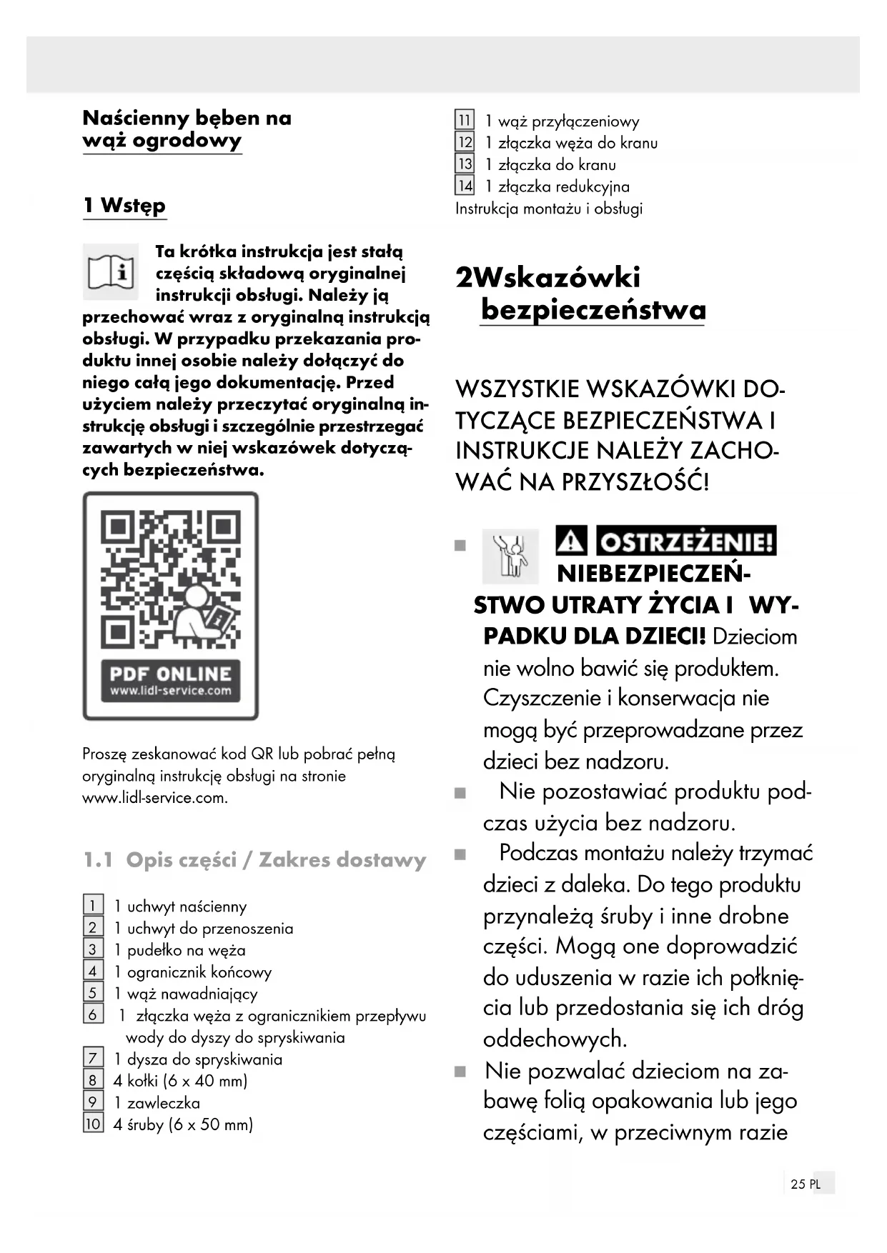 tegen de muur om ruimte te besparen (zie afb. B).25 PL Naścienny bęben na wąż ogrodowy 1 Wstęp Ta krótka instrukcja jest stałą częścią składową oryginalnej instrukcji obsługi. Należy ją przechować wraz z oryginalną instrukcją obsługi. W przypadku przekazania pro- duktu innej osobie należy dołączyć do niego całą jego dokumentację. Przed użyciem należy przeczytać oryginalną in- strukcję obsługi i szczególnie przestrzegać zawartych w niej wskazówek dotyczą- cych bezpieczeństwa. Proszę zeskanować kod QR lub pobrać pełną oryginalną instrukcję obsługi na stronie www.lidl-service.com.