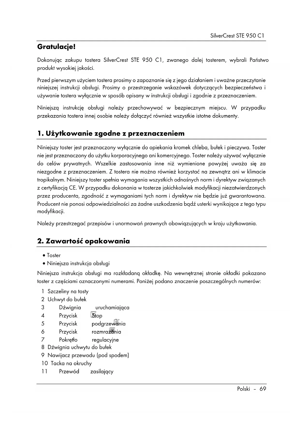 - Niniejsza instrukcja obsługi Niniejsza instrukcja obsługi ma rozkładaną okładkę. Na wewnętrznej stronie okładki pokazano toster z częściami oznaczonymi numerami. Poniżej podano znaczenie poszczególnych numerów: 1 Szczeliny na tosty 2 Uchwyt do bułek 3 Dźwignia uruchamiająca 4 Przycisk Stop 5 Przycisk podgrzewania 6 Przycisk rozmrażania 7 Pokrętło regulacyjne 8 Dźwignia uchwytu do bułek 9 Nawijacz przewodu (pod spodem) 10 Tacka na okruchy 11 Przewód zasilającySilverCrest STE 950 C1 70 – Polski
