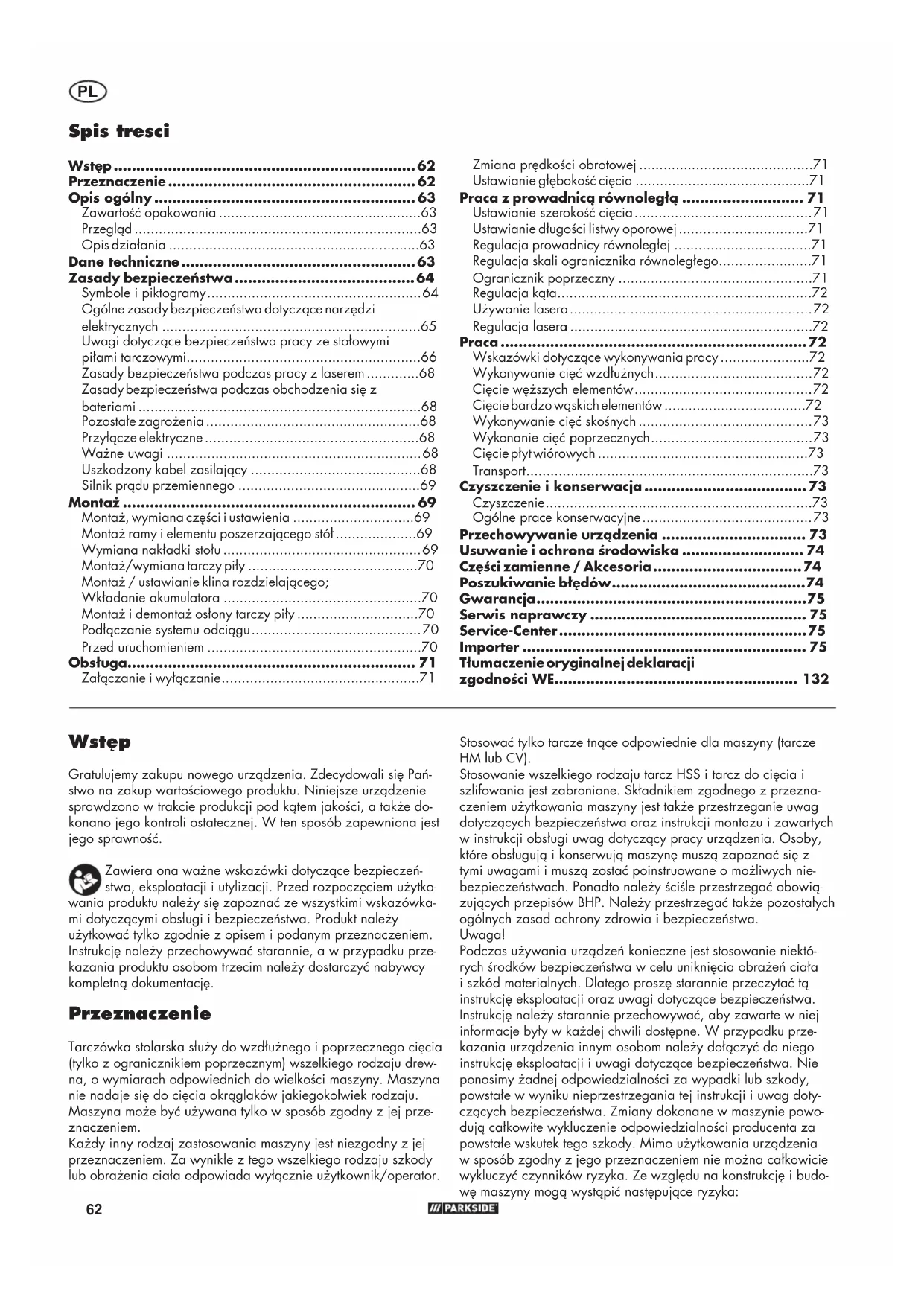 - Importer Wstęp Gratulujemy zakupu nowego urządzenia. Zdecydowali się Pań- stwo na zakup wartościowego produktu. Niniejsze urządzenie sprawdzono w trakcie produkcji pod kątem jakości, a także do- konano jego kontroli ostatecznej. W ten sposób zapewniona jest jego sprawność. Zawiera ona ważne wskazówki dotyczące bezpieczeń- stwa, eksploatacji i utylizacji. Przed rozpoczęciem użytko- wania produktu należy się zapoznać ze wszystkimi wskazówka- mi dotyczącymi obsługi i bezpieczeństwa. Produkt należy użytkować tylko zgodnie z opisem i podanym przeznaczeniem. Instrukcję należy przechowywać starannie, a w przypadku prze- kazania produktu osobom trzecim należy dostarczyć nabywcy kompletną dokumentację. Przeznaczenie Tarczówka stolarska służy do wzdłużnego i poprzecznego cięcia (tylko z ogranicznikiem poprzecznym) wszelkiego rodzaju drew- na, o wymiarach odpowiednich do wielkości maszyny. Maszyna nie nadaje się do cięcia okrąglaków jakiegokolwiek rodzaju. Maszyna może być używana tylko w sposób zgodny z jej prze- znaczeniem. Każdy inny rodzaj zastosowania maszyny jest niezgodny z jej przeznaczeniem. Za wynikłe z tego wszelkiego rodzaju szkody lub obrażenia ciała odpowiada wyłącznie użytkownik/operator.PL p. 75