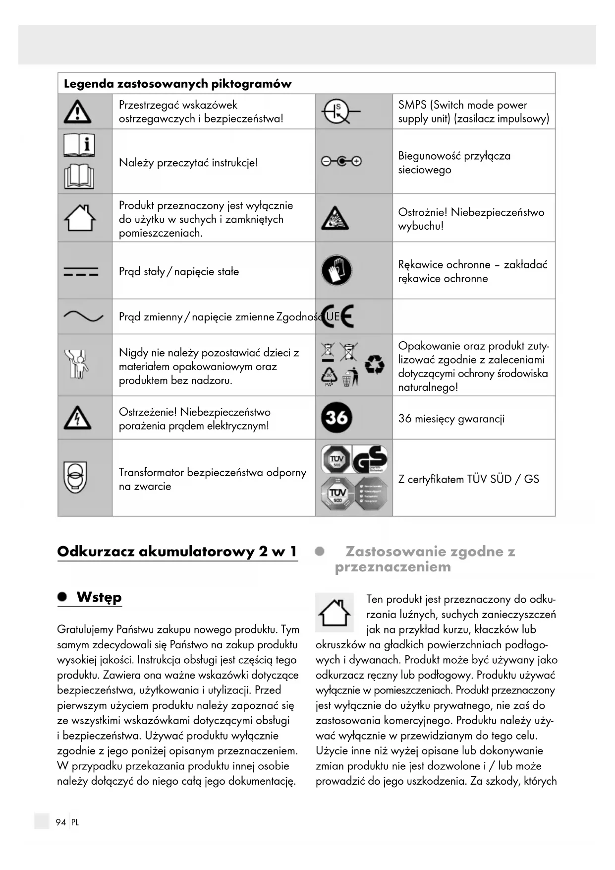 PAP Opakowanie oraz produkt zuty- lizować zgodnie z zaleceniami dotyczącymi ochrony środowiska naturalnego! Ostrzeżenie! Niebezpieczeństwo porażenia prądem elektrycznym! 36 miesięcy gwarancji Transformator bezpieczeństwa odporny na zwarcie Z certyfikatem TÜV SÜD / GS Odkurzacz akumulatorowy 2 w 1 Wstęp Gratulujemy Państwu zakupu nowego produktu. Tym samym zdecydowali się Państwo na zakup produktu wysokiej jakości. Instrukcja obsługi jest częścią tego produktu. Zawiera ona ważne wskazówki dotyczące bezpieczeństwa, użytkowania iutylizacji. Przed pierwszym użyciem produktu należy zapoznać się ze wszystkimi wskazówkami dotyczącymi obsługi ibezpieczeństwa. Używać produktu wyłącznie zgodnie zjego poniżej opisanym przeznaczeniem. Wprzypadku przekazania produktu innej osobie należy dołączyć do niego całą jego dokumentację. Zastosowanie zgodne z przeznaczeniem Ten produkt jest przeznaczony do odku- rzania luźnych, suchych zanieczyszczeń jak na przykład kurzu, kłaczków lub okruszków na gładkich powierzchniach podłogo- wych i dywanach. Produkt może być używany jako odkurzacz ręczny lub podłogowy. Produktu używać wyłącznie w pomieszczeniach. Produkt przeznaczony jest wyłącznie do użytku prywatnego, nie zaś do zastosowania komercyjnego. Produktu należy uży- wać wyłącznie w przewidzianym do tego celu. Użycie inne niż wyżej opisane lub dokonywanie zmian produktu nie jest dozwolone i / lub może prowadzić do jego uszkodzenia. Za szkody, których95 PL przyczyną jest użytkowanie sprzeczne z przezna- czeniem, producent nie przejmuje żadnej odpowie- dzialności. Opis części