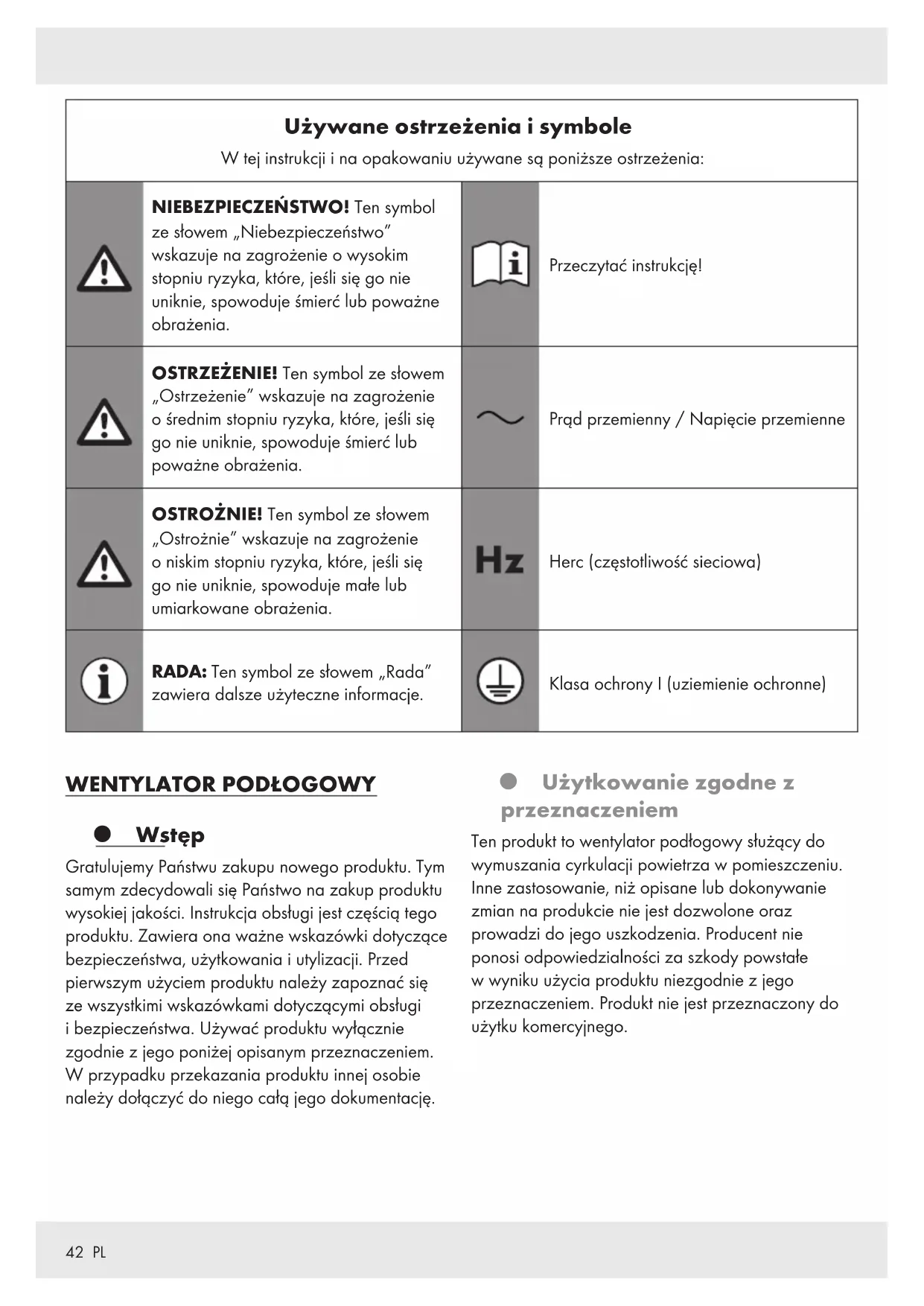 Wstęp Gratulujemy Państwu zakupu nowego produktu. Tym samym zdecydowali się Państwo na zakup produktu wysokiej jakości. Instrukcja obsługi jest częścią tego produktu. Zawiera ona ważne wskazówki dotyczące bezpieczeństwa, użytkowania i utylizacji. Przed pierwszym użyciem produktu należy zapoznać się ze wszystkimi wskazówkami dotyczącymi obsługi i bezpieczeństwa. Używać produktu wyłącznie zgodnie z jego poniżej opisanym przeznaczeniem. W przypadku przekazania produktu innej osobie należy dołączyć do niego całą jego dokumentację. Użytkowanie zgodne z przeznaczeniem Ten produkt to wentylator podłogowy służący do wymuszania cyrkulacji powietrza w pomieszczeniu. Inne zastosowanie, niż opisane lub dokonywanie zmian na produkcie nie jest dozwolone oraz prowadzi do jego uszkodzenia. Producent nie ponosi odpowiedzialności za szkody powstałe w wyniku użycia produktu niezgodnie z jego przeznaczeniem. Produkt nie jest przeznaczony do użytku komercyjnego.43 PL Zakres dostawy Po rozpakowaniu produktu należy sprawdzić, czy dostawa jest kompletna i czy wszystkie części są w dobrym stanie. Przed użyciem usunąć wszystkie materiały pakunkowe. 1 Wentylator podłogowy 1 Instrukcja obsługi Opis części