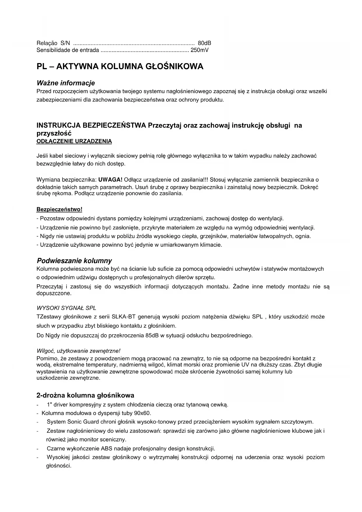 TZestawy głośnikowe z serii SLKA-BT generują wysoki poziom natężenia dźwięku SPL , który uszkodzić może słuch w przypadku zbyt bliskiego kontaktu z głośnikiem. Do Nigdy nie dopuszczaj do przekroczenia 85dB w sytuacji odsłuchu bezpośredniego. Wilgoć, użytkowanie zewnętrzne! Pomimo, że zestawy z powodzeniem mogą pracować na zewnątrz, to nie są odporne na bezpośredni kontakt z wodą, ekstremalne temperatury, nadmierną wilgoć, klimat morski oraz promienie UV na dłuższy czas. Zbyt długie wystawienia na użytkowanie zewnętrzne spowodować może skrócenie żywotności samej kolumny lub uszkodzenie zewnętrzne. 2-drożna kolumna głośnikowa - 1" driver kompresyjny z system chłodzenia cieczą oraz tytanową cewką. - Kolumna modułowa o dyspersji tuby 90x60. - System Sonic Guard chroni głośnik wysoko-tonowy przed przeciążeniem wysokim sygnałem szczytowym. - Zestaw nagłośnieniowy do wielu zastosowań: sprawdzi się zarówno jako główne nagłośnieniowe klubowe jak i również jako monitor sceniczny. - Czarne wykończenie ABS nadaje profesjonalny design konstrukcji. - Wysokiej jakości zestaw głośnikowy o wytrzymałej konstrukcji odpornej na uderzenia oraz wysoki poziom głośności.- Wysokiej jakości metalowy grill zabezpieczający głośnik basowy - Ergonomiczny kształt i uchwyt w połączeniu z dobrze wypoziomowaną konstrukcja ułatwia transport - Równoległe gniazdo głośnikowe (external speaker output - SPEAKON) - Punkty do podwieszania znajdują się na zestawie głośnikowym (w zestaw nie znajdują się elementy mocujące) - Gniazdo statywu kolumnowego 35 mm z zabezpieczeniem Panel wejść/wyjść Gniazdo SPEAKON znajdujące się na tylnym panelu jest połączone równolegle z kolumną (master box). Oznacza to, że sygnał pochodzący z odtwarzacza mp3, wejść liniowych, USB oraz Bluetooth będzie przechodził do podłączonej kolumny (slave box). Wzmacniacz NL4/NL2 Terminal +