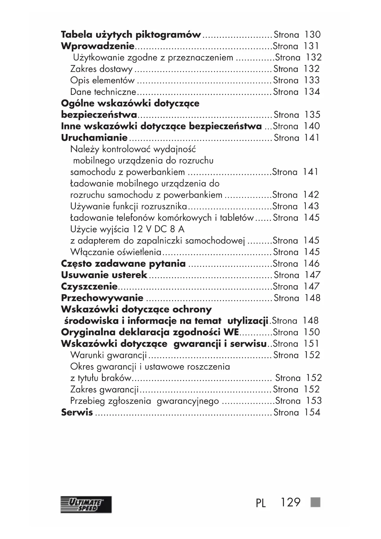 Tabela użytych piktogramów ......................... Strona 130 Wprowadzenie.................................................Strona 131 Użytkowanie zgodne zprzeznaczeniem ..............Strona 132 Zakres dostawy .................................................Strona 132 Opis elementów ................................................Strona 133 Dane techniczne ................................................Strona 134 Ogólne wskazówki dotyczące bezpieczeństwa ................................................Strona 135 Inne wskazówki dotyczące bezpieczeństwa ... Strona 140 Uruchamianie ................................................... Strona 141 Należy kontrolować wydajność mobilnego urządzenia do rozruchu samochodu z powerbankiem ..............................Strona 141 Ładowanie mobilnego urządzenia do rozruchu samochodu z powerbankiem .................Strona 142 Używanie funkcji rozrusznika ..............................Strona 143 Ładowanie telefonów komórkowych itabletów ...... Strona 145 Użycie wyjścia 12 V DC 8 A z adapterem do zapalniczki samochodowej .........Strona 145 Włączanie oświetlenia .......................................Strona 145 Często zadawane pytania ..............................Strona 146 Usuwanie usterek ............................................ Strona 147 Czyszczenie.......................................................Strona 147 Przechowywanie .............................................Strona 148 Wskazówki dotyczące ochrony środowiska iinformacje na temat utylizacji ...Strona 148 Oryginalna deklaracja zgodności WE............Strona 150 Wskazówki dotyczące gwarancji iserwisu ...Strona 151 Warunki gwarancji ............................................ Strona 152 Okres gwarancji iustawowe roszczenia ztytułu braków.................................................. Strona 152 Zakres gwarancji ...............................................Strona 152 Przebieg zgłoszenia gwarancyjnego ...................Strona 153 Serwis ...............................................................Strona 154130