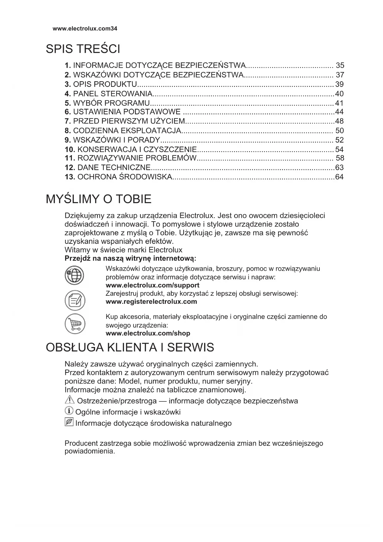 Dziękujemy za zakup urządzenia Electrolux. Jest ono owocem dziesięcioleci doświadczeń i innowacji. To pomysłowe i stylowe urządzenie zostało zaprojektowane z myślą o Tobie. Użytkując je, zawsze ma się pewność uzyskania wspaniałych efektów. Witamy w świecie marki Electrolux Przejdź na naszą witrynę internetową: Wskazówki dotyczące użytkowania, broszury, pomoc w rozwiązywaniu problemów oraz informacje dotyczące serwisu i napraw: www.electrolux.com/support Zarejestruj produkt, aby korzystać z lepszej obsługi serwisowej: www.registerelectrolux.com Kup akcesoria, materiały eksploatacyjne i oryginalne części zamienne do swojego urządzenia: www.electrolux.com/shop