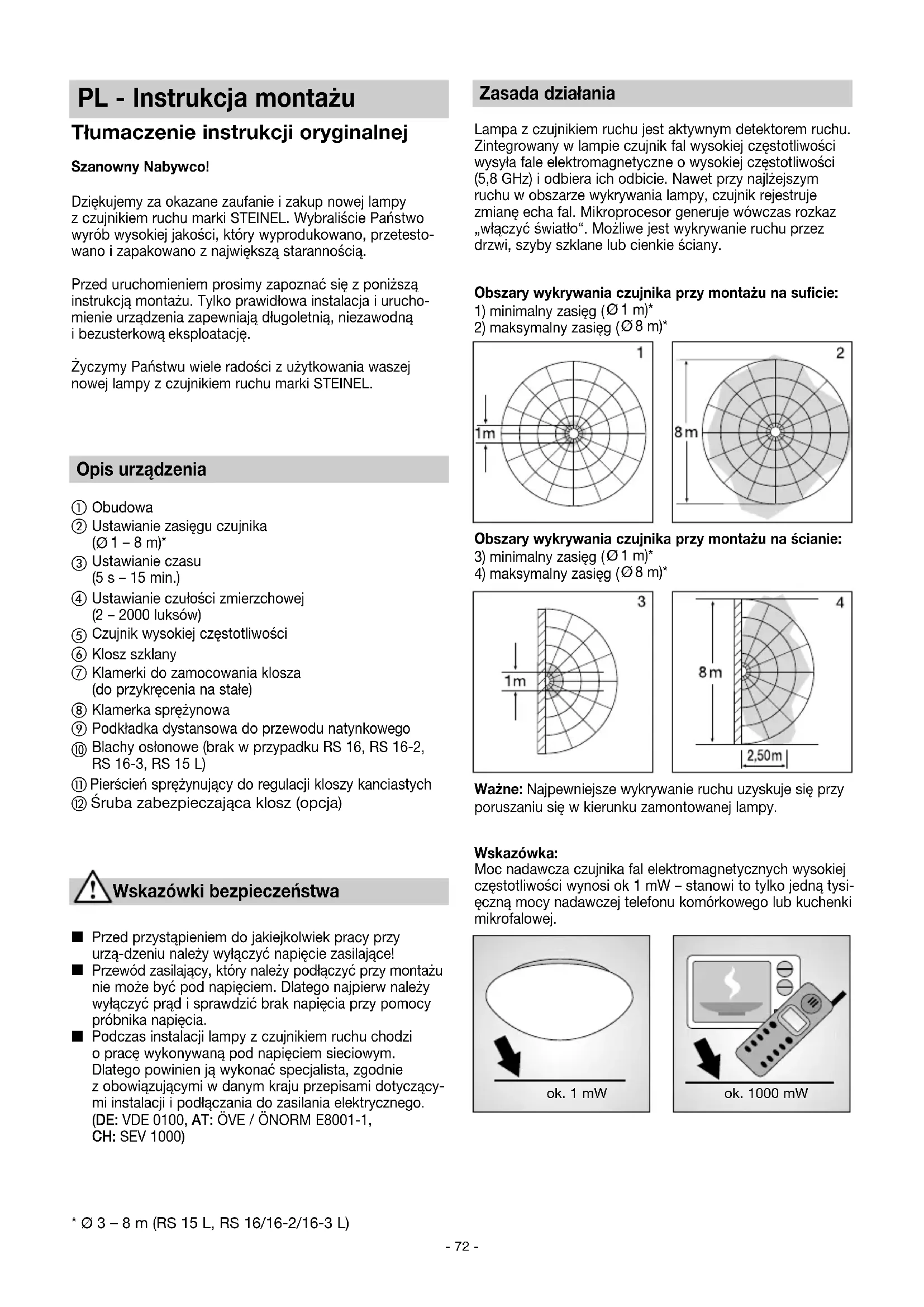 ZÁRUKA ROKY VÝROBCU Serie RS_110077119_BDAL Serie RS_24spr_neu.qxp 09.11.21 12:42 Seite 72PL - Instrukcja montażu Szanowny Nabywco! Dziękujemy za okazane zaufanie i zakup nowej lampy z czujnikiem ruchu marki STEINEL. Wybraliście Państwo wyrób wysokiej jakości, który wyprodukowano, przetesto- wano i zapakowano z największą starannością. Przed uruchomieniem prosimy zapoznać się z poniższą instrukcją montażu. Tylko prawidłowa instalacja i urucho- mienie urządzenia zapewniają długoletnią, niezawodną i bezusterkową eksploatację. Życzymy Państwu wiele radości z użytkowania waszej nowej lampy z czujnikiem ruchu marki STEINEL. Opis urządzenia