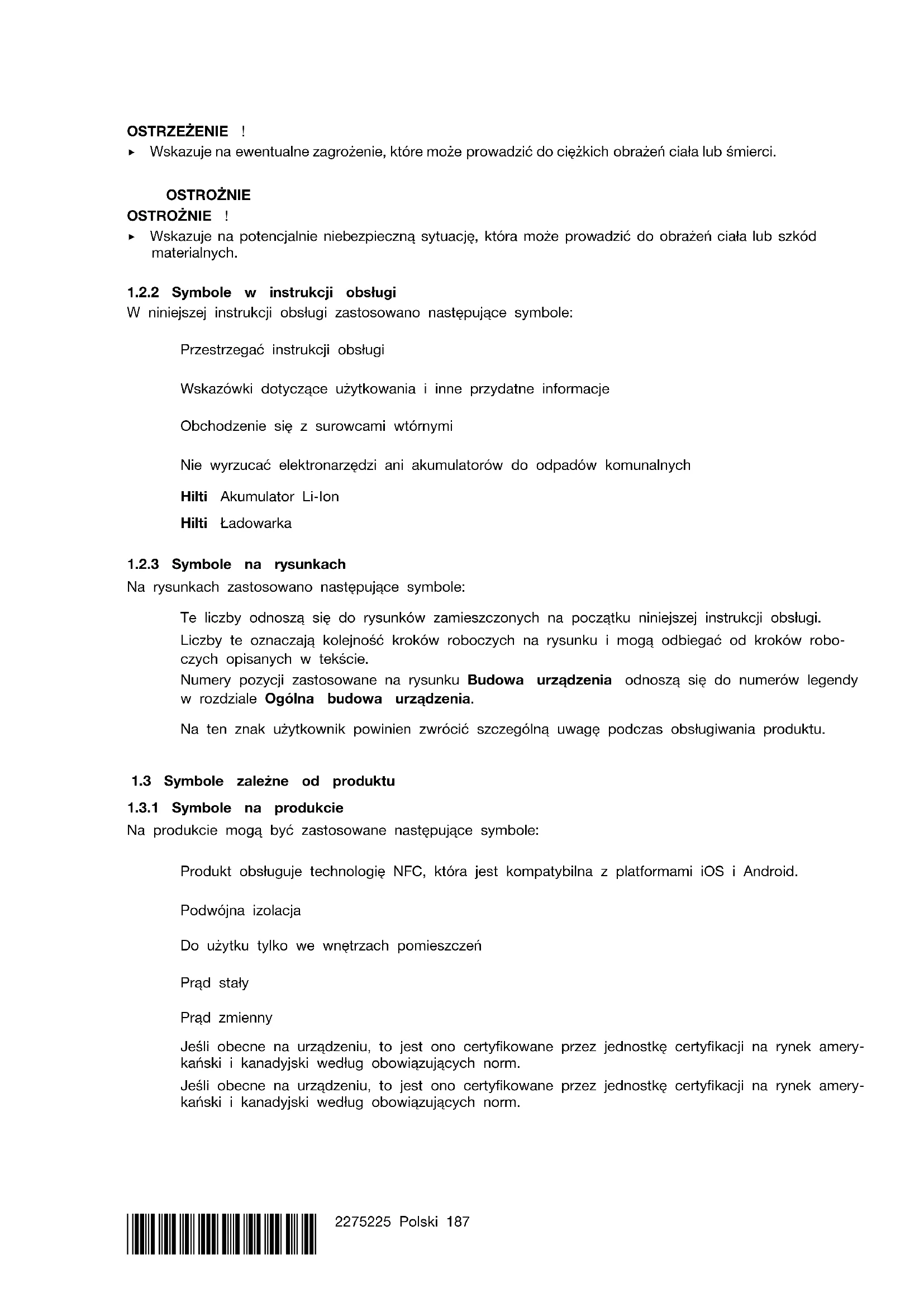 W niniejszej instrukcji obsługi zastosowano następujące symbole: Przestrzegać instrukcji obsługi Wskazówki dotyczące użytkowania i inne przydatne informacje Obchodzenie się z surowcami wtórnymi Nie wyrzucać elektronarzędzi ani akumulatorów do odpadów komunalnych Hilti Akumulator LiIon Hilti Ładowarka