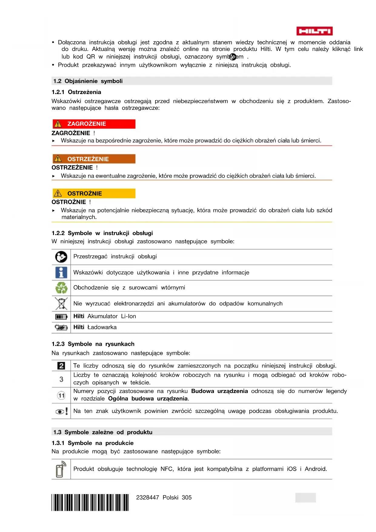 Na produkcie mogą być zastosowane następujące symbole: Produkt obsługuje technologię NFC, która jest kompatybilna z platformami iOS i Android.306 Polski 2328447 *2328447* Akumulator litowo-jonowy Nigdy nie używać akumulatora w charakterze młotka. Uważać, aby akumulator nie upadł. Nie używać akumulatora, który był narażony na uderzenie lub jest uszkodzony w inny sposób. Zastosowany akumulator Hilti litowo-jonowy. Należy przestrzegać informacji podanych w rozdzia- le Użytkowanie zgodne z przeznaczeniem. Jeśli obecne na urządzeniu, to jest ono certyfikowane przez jednostkę certyfikacji na rynek amery- kański i kanadyjski według obowiązujących norm.