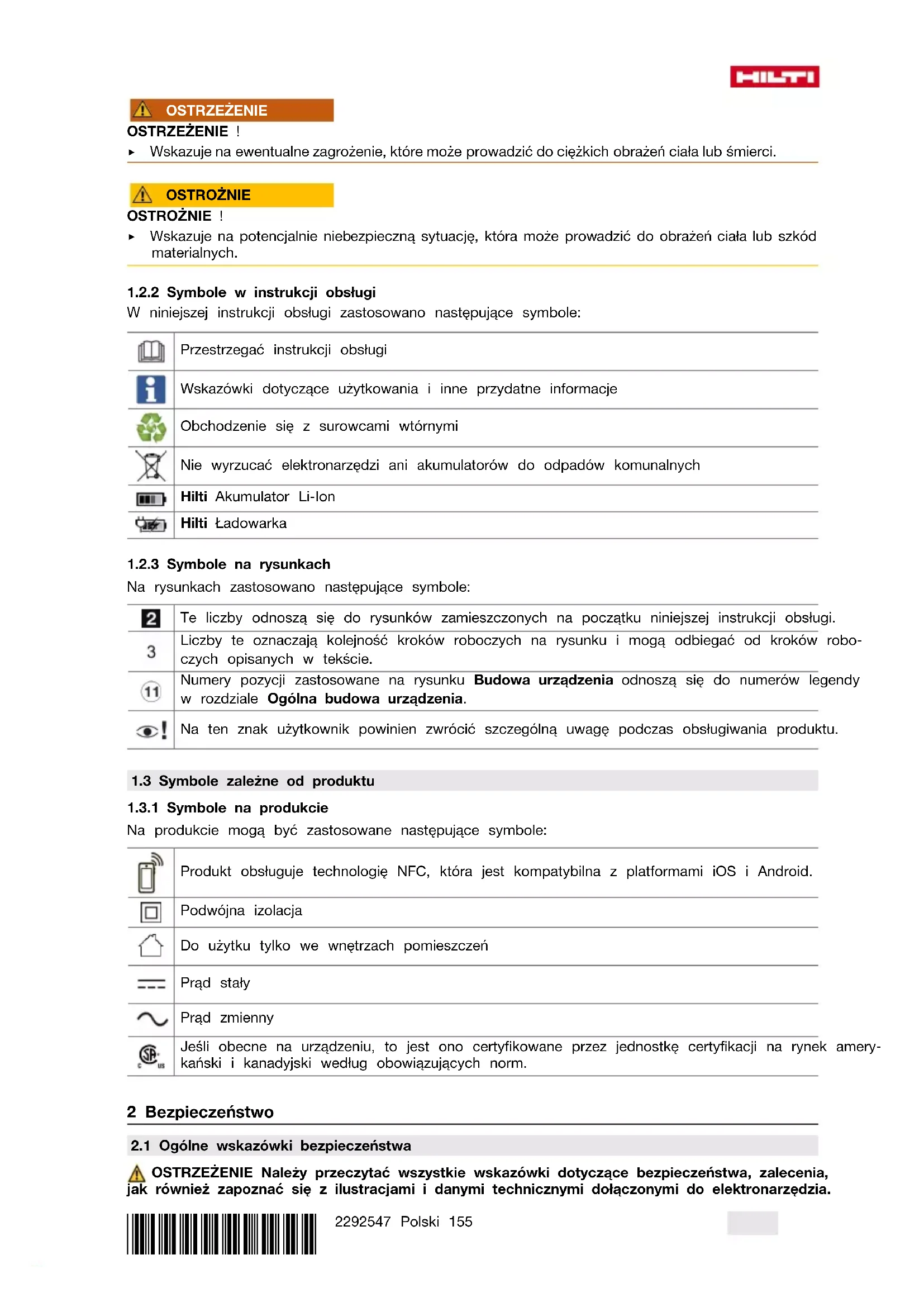 - W razie uszkodzeń i / lub zakłóceń w funkcjonowaniu, nie używać produktu. Natychmiast zlecić naprawę serwisowi Hilti.160 Polski 2292547 *2292547*