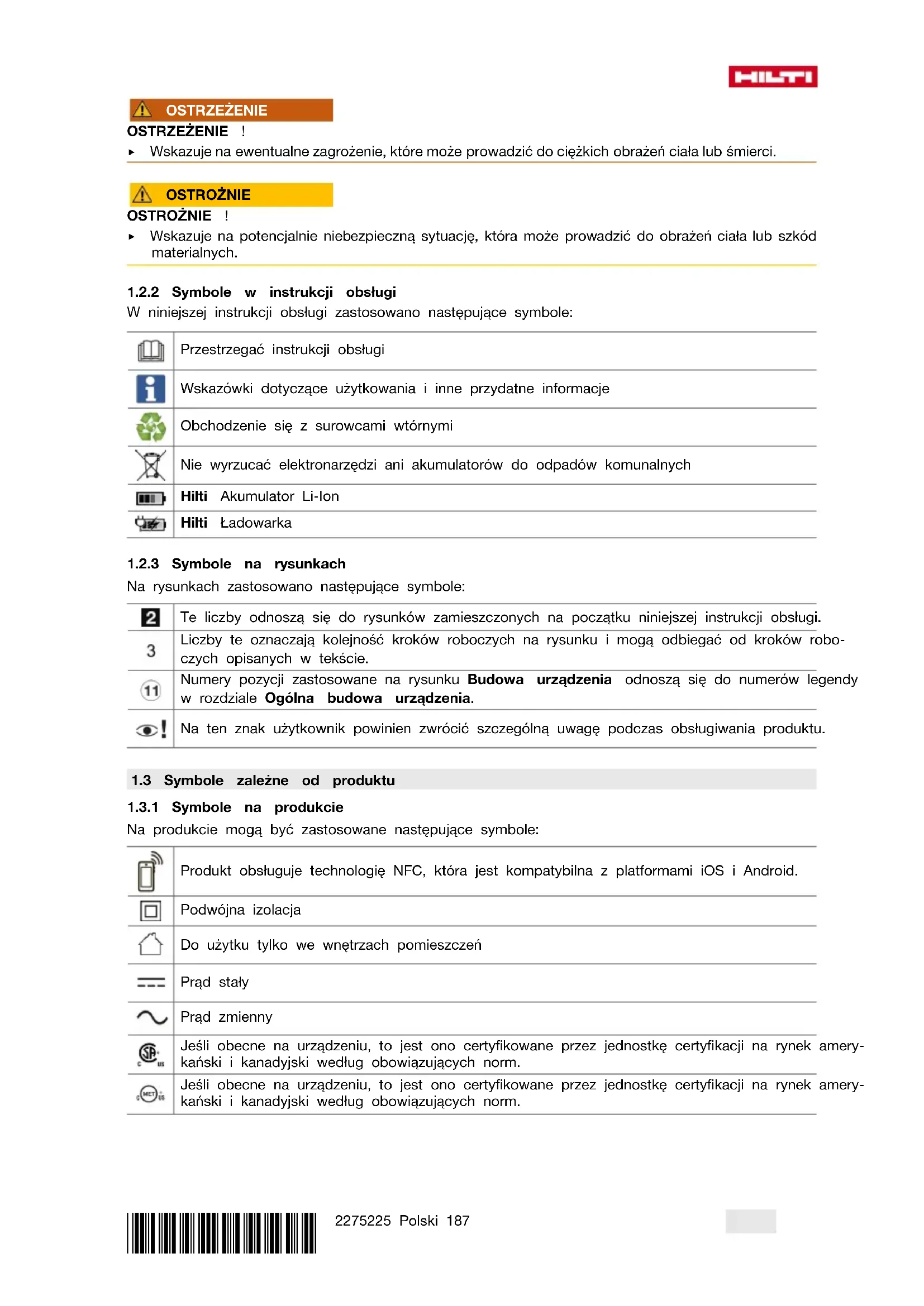 W niniejszej instrukcji obsługi zastosowano następujące symbole: Przestrzegać instrukcji obsługi Wskazówki dotyczące użytkowania i inne przydatne informacje Obchodzenie się z surowcami wtórnymi Nie wyrzucać elektronarzędzi ani akumulatorów do odpadów komunalnych Hilti Akumulator LiIon Hilti Ładowarka
