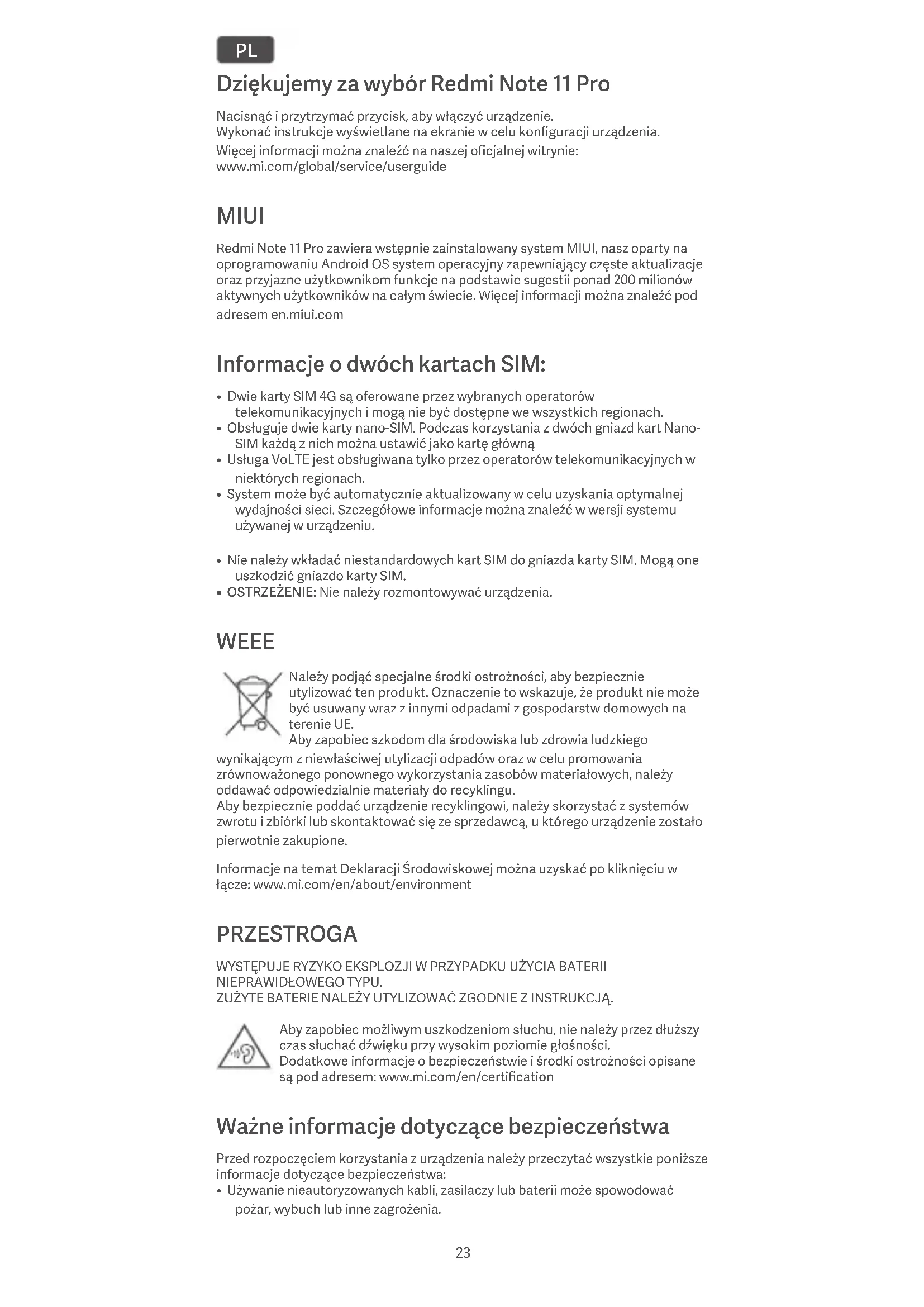 - OSTRZEŻENIE: Nie należy rozmontowywać urządzenia. WEEE Należy podjąć specjalne środki ostrożności, aby bezpiecznie utylizować ten produkt. Oznaczenie to wskazuje, że produkt nie może być usuwany wraz z innymi odpadami z gospodarstw domowych na terenie UE. Aby zapobiec szkodom dla środowiska lub zdrowia ludzkiego wynikającym z niewłaściwej utylizacji odpadów oraz w celu promowania zrównoważonego ponownego wykorzystania zasobów materiałowych, należy oddawać odpowiedzialnie materiały do recyklingu. Aby bezpiecznie poddać urządzenie recyklingowi, należy skorzystać z systemów zwrotu i zbiórki lub skontaktować się ze sprzedawcą, u którego urządzenie zostało pierwotnie zakupione. Informacje na temat Deklaracji Środowiskowej można uzyskać po kliknięciu w łącze: www.mi.com/en/about/environment PRZESTROGA WYSTĘPUJE RYZYKO EKSPLOZJI W PRZYPADKU UŻYCIA BATERII NIEPRAWIDŁOWEGO TYPU. ZUŻYTE BATERIE NALEŻY UTYLIZOWAĆ ZGODNIE Z INSTRUKCJĄ. Aby zapobiec możliwym uszkodzeniom słuchu, nie należy przez dłuższy czas słuchać dźwięku przy wysokim poziomie głośności. Dodatkowe informacje o bezpieczeństwie i środki ostrożności opisane są pod adresem: www.mi.com/en/certification Ważne informacje dotyczące bezpieczeństwa Przed rozpoczęciem korzystania z urządzenia należy przeczytać wszystkie poniższe informacje dotyczące bezpieczeństwa:
