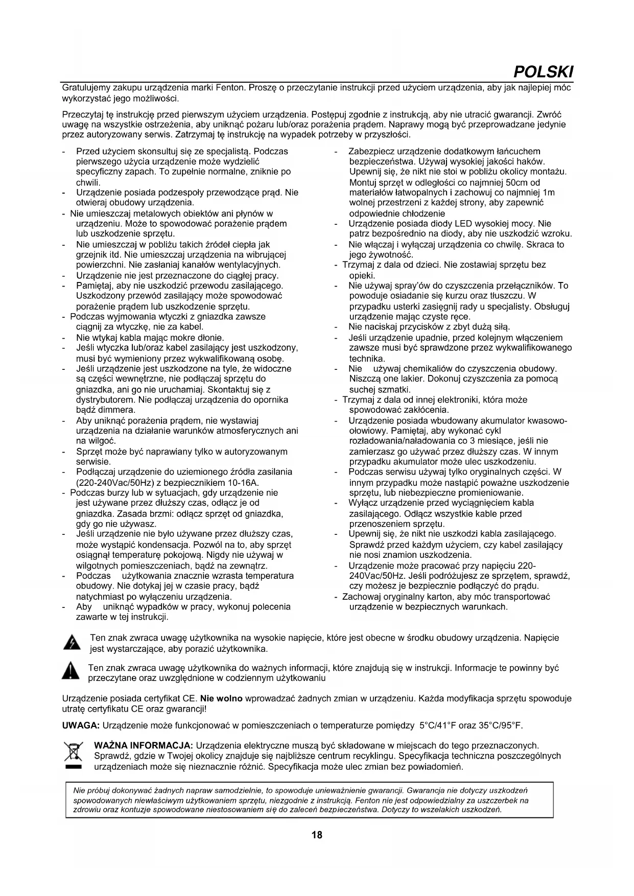 Ten znak zwraca uwagę użytkownika do ważnych informacji, które znajdują się w instrukcji. Informacje te powinny być przeczytane oraz uwzględnione w codziennym użytkowaniu Urządzenie posiada certyfikat CE. Nie wolno wprowadzać żadnych zmian w urządzeniu. Każda modyfikacja sprzętu spowoduje utratę certyfikatu CE oraz gwarancji! UWAGA: Urządzenie może funkcjonować w pomieszczeniach o temperaturze pomiędzy 5°C/41°F oraz 35°C/95°F. WAŻNA INFORMACJA: Urządzenia elektryczne muszą być składowane w miejscach do tego przeznaczonych. Sprawdź, gdzie w Twojej okolicy znajduje się najbliższe centrum recyklingu. Specyfikacja techniczna poszczególnych urządzeniach może się nieznacznie różnić. Specyfikacja może ulec zmian bez powiadomień. Nie próbuj dokonywać żadnych napraw samodzielnie, to spowoduje unieważnienie gwarancji. Gwarancja nie dotyczy uszkodzeń spowodowanych niewłaściwym użytkowaniem sprzętu, niezgodnie z instrukcją. Fenton nie jest odpowiedzialny za uszczerbek na zdrowiu oraz kontuz