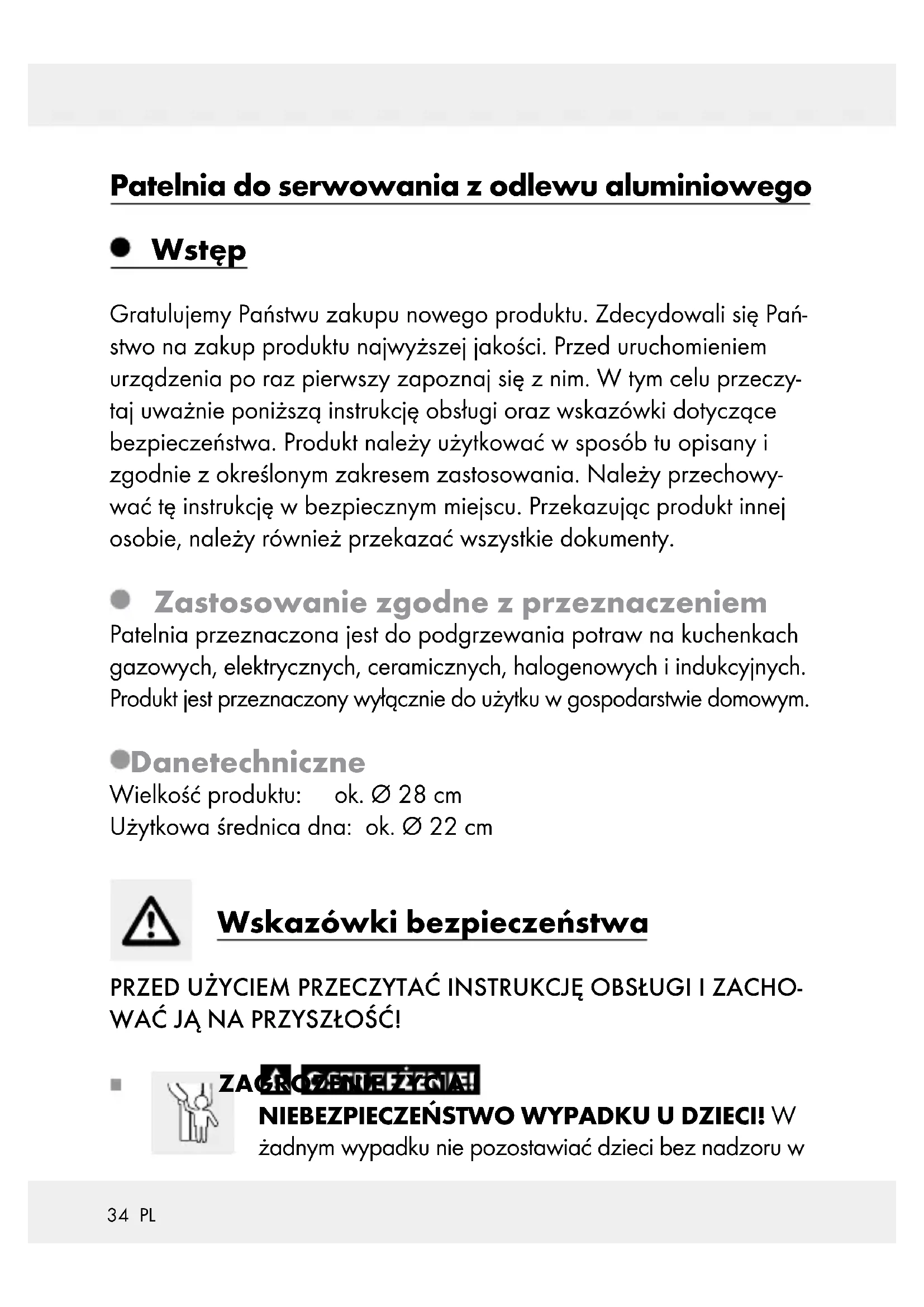 RZECZY! Podczas podgrzewania ważną rzeczą jest, aby nie spuszczać z oczu naczyń, w których rozgrzewa się tłuszcz. Tłuszcz może szybko się przegrzać i zapalić. W przypadku gdyby tłuszcz się zapalił, to nigdy nie należy gasić go wodą! Należy zdusić płomienie pokrywką patelni lub grubym wełnianym kocem. Aby nie uszkodzić powłoki antyadhezyjnej, należy stosować jedy- nie pomocy kuchennych z żaroodpornego tworzywa sztucznego lub drewna. Gotowanego produktu nie należy kroić bezpośrednio w patelni. Na gorący tłuszcz nie należy kłaść mokrego, ociekającego mięsa. Wskutek pryskającego tłuszczu na rozżarzoną płytę kuchenki ła- two można wzniecić pożar. Dobierać wielkość płyty grzejnej odpowiednio do średnicy patelni, aby uniknąć strat ciepła. Średnica produktu wynosi ok. Ø 22 cm. Artykuł nadaje się do podgrzewania potraw w piekarniku (maks. 160 °C przez godzinę). Po użyciu patelnię należy wymyć.36 PL Zalecamy ręczne czyszczenie ciepłą wodą i płynem do naczyń, ponieważ czyszczenie w zmywarce może prowadzić do przebar- wień aluminiowych części. UWAGA! Szklana pokrywka jest łamliwa / nieodporna na upadek! Podczas mycia ręcznego patelnię myć gorącą wodą i powszech- nie dostępnymi w handlu płynami do zmywania naczyń. Unikać przy tym używania ostrych lub szpiczastych przedmiotów, aby nie uszkodzić materiału. Nie wykorzystywać do mycia żadnych ostrych środków szorujących. UWAGA! ZAGROŻENIE ZARYSOWANIEM! Należy uni- kać przesuwania naczyń kuchenny na szklano-ceramicznych pły- tach kuchennych! Przed rozpoczęciem gotowania zalecamy przetarcie powierzchni płyty kuchennej i dna garnka czystą, nie- mechacącą się szmatką (na przykład z mikrowłókna). W ten spo- sób można zapobiec zarysowaniu. Nigdy nie trzymać gorącego produktu pod bieżącą gorącą wodą. Dolna strona produktu może zostać przez to uszkodzona lub odpaść od produktu. BEZ WPŁYWU NA ŻYWNOŚĆ! Produkt nie wpływa ujemnie na właściwości smakowe i zapachowe. Patelnia nadaje się do mycia w zmywarce. Wskazówka dla kuchenek indukcyjnych Wskazówka: W niektórych okolicznościach może powstać zapach, który wynika z elektromagnetycznych właściwości źródła ciepła i garnka/patelni.37 PL Jest to normalne i nie wskazuje na uszkodzenie kuchenki indukcyjnej lub naczynia do gotowania. Garnek /patelnię należy stawiać po środku pola kuchenki induk- cyjnej. UWAGA! Wysoka prędkość nagrzewania! Naczynia do goto- wania nie przegrzać podczas nagrzewania. W przypadku przegrzania pomieszczenie musi zostać dokładnie wywietrzone. Użytkowanie Przed pierwszym zastosowaniem należy usunąć z artykułu ewen- tualne naklejki oraz wypłukać go gorącą wodą. Przed pierwszym zastosowaniem garnka, należy wygotować go 2 do 3 razy wodą, aby całkowicie usunąć z niego ewentualne pozostałości poprodukcyjne. Proszę lekko natłuścić garnek. Nie przegrzewać pustego lub napełnionego potrawą garnka, po- nieważ może to spowodować obniżenie efektu zapobiegającemu przywieraniu lub uszkodzić powierzchnię. Potrawy należy podgrzać przy średniej / wysokiej temperaturze oraz pozostawić je następnie na słabym ogniu w celu dogotowania. Utylizacja Opakowanie wykonane jest z materiałów przyjaznych dla środowiska, które można przekazać do utylizacji w lokalnym punkcie przetwarza- nia surowców wtórnych. Informacji na temat możliwości utylizacji wyeksploatowanego produktu udziela urząd gminy lub miasta.38 PL Gwarancja Produkt wyprodukowano według wysokich standardów jakości i pod- dano skrupulatnej kontroli przed wysyłką. W przypadku wad produktu nabywcy przysługują ustawowe prawa. Gwarancja nie ogranicza ustawowych praw nabywcy produktu. Produkt objęte jest 3 gwarancją, licząc od daty zakupu. Gwarancja wygasa w razie zawinionego przez użytkownika uszkodzenia produktu, niewłaściwego użycia lub konserwacji. W przypadku wystąpienia w ciągu 3 lat od daty zakupu wad mate- riałowych lub fabrycznych, dokonujemy – według własnej oceny – bezpłatnej naprawy lub wymiany produktu. Świadczenie gwarancyjne obejmuje wady materiałowe i fabryczne. Gwarancja nie obejmuje części produktu ulegających normalnemu zu- życiu, uznawanych za części zużywalne (np. baterie) oraz uszkodzeń części łamliwych, np. przełączników, akumulatorów lub wykonanych ze szkła. Zgodnie z Kodeksem Cywilnym art. 581 §1 wraz z wymianą urzą- dzenia lub ważnej części czas gwarancji rozpoczyna się na nowo. Sposób postępowania w przypadku naprawy gwarancyjnej Aby zapewnić szybkie rozpatrzenie Państwa wniosku, prosimy stoso- wać się do następujących wskazówek: Przed skontaktowaniem się z działem serwisowym należy przygotować paragon i numer artykułu (np. IAN 123456_7890) jako dowód zakupu.39 PL Numery artykułów można znaleźć na tabliczce znamionowe, na gra- werunku, na stronie tytułowej jego instrukcji (na dole po lewej stronie) lub jako naklejkę na stronie odwrotnej lub spodniej. W razie wystąpienia błędów w działaniu lub innych wad, należy skon- taktować się najpierw z wymienionym poniżej działem serwisowym telefonicznie lub pocztą elektroniczną. Produkt uznany za uszkodzony można następnie z dołączeniem dowodu zakupu (paragonu) i podaniem, na czym polega wada i kiedy wystąpiła, przesłać bezpłatnie na podany Państwu adres serwisu. Serwis Serwis Polska Tel.: 008004911946 E-Mail: owim@lidl.pl40 CZ Úvod ..................................................................................... Strana 41 Použití ke stanovenému účelu.............................................. Strana 41 Technické údaje ................................................................... Strana 41 Bezpečnostní pokyny ............................................ Strana 41 Upozornění k použití na indukčních plotýnkách ...................................................................