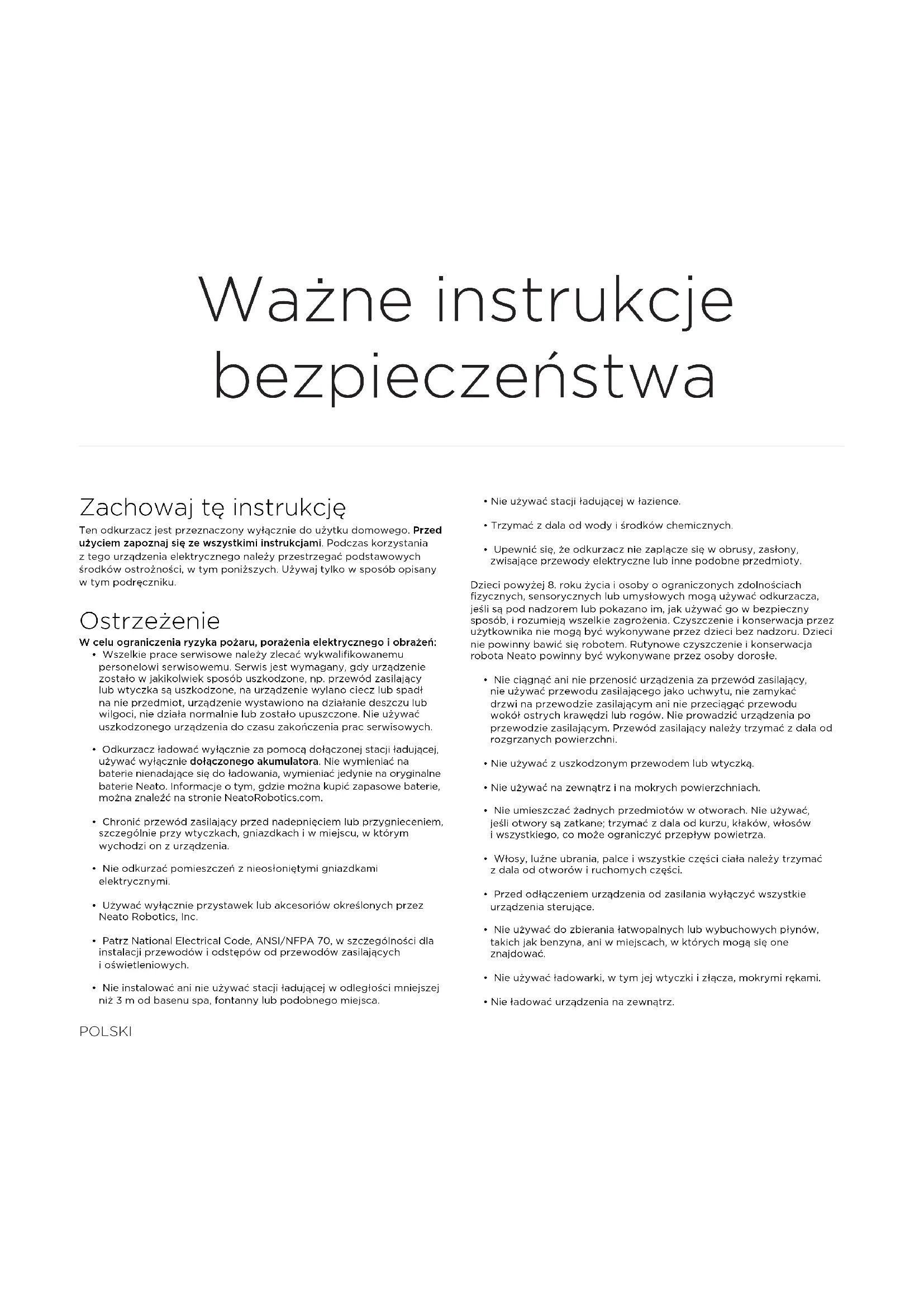 - Modyfikacje (zmiany) lub próby naprawy odkurzacza autonomicznego lub czujnika nawigacyjnego są surowo zabronione i mogą skutkować narażeniem na niebezpieczne promieniowanie. Umowa licencyjna użytkownika końcowego, znaki towarowe i prawa autorskie Umowa licencyjna użytkownika końcowego Neato Robotics, Inc. jest dostępna w sieci na stronie NeatoRobotics.com. NEATO ROBOTICS, NEATO, NEATO INTELLIGENT ROBOT VACUUM są zarejestrowanymi znakami towarowymi firmy Neato Robotics, Inc. Inne znaki towarowe, nazwy handlowe oraz znaki usługowe są zarejestrowanymi i niezarejestrowanymi znakami towarowymi, nazwami handlowymi i znakami usługowymi ich odpowiednich właścicieli. Utylizacja Utylizacja produktu Ten symbol na produkcie oznacza, że nie można go wyrzucać razem z innymi odpadami gospodarstwa domowego. Należy go utylizować i zbierać w ramach recyklingu i odzysku zużytego EEE. Aby uzyskać więcej informacji na temat tego, gdzie należy utylizować zużyty sprzęt w celu recyklingu i odzysku, należy skontaktować się ze sprzedawcą lub dystrybutorem, u którego zakupiono produkt. Utylizacja baterii Ten symbol na baterii oznacza, że nie można jej wyrzucać razem z innymi odpadami gospodarstwa domowego. Należy ją utylizować i zbierać za pośrednictwem lokalnego systemu bezpłatnej zbiórki baterii. Aby uzyskać więcej informacji na temat tego, gdzie należy utylizować zużyte baterie w celu recyklingu i odzysku, należy skontaktować się ze sprzedawcą lub dystrybutorem, u którego zakupiono produkt. Przed utylizacją należy wyjąć baterię z produktu i zutylizować ją osobno zgodnie z lokalnymi przepisami. Dane techniczne Odkurzacz automatyczny Zasilanie: 19,5 V==1,5 A; 29,25 W Stacja ładująca Zasilanie: 19,5 V==1,5 A; Wyjście: 19,5 V==1,5 A Zasilacz sieciowy (model: S030BBM1950150) Zasilanie: 100–240 V ~ 50–60 Hz, 1,0 A; Wyjście: 19,5 V DC, 1,5 A Podsumowanie ograniczonej gwarancji producenta Neato Robotics, Inc. gwarantuje pierwotnemu nabywcy (dalej „użytkownik”), że sprzęt Neato („Produkt”), z wyłączeniem baterii i innych materiałów eksploatacyjnych, będzie wolny od wad materiałowych iprodukcyjnych przez 1 rok od pierwotnej daty zakupu. W przypadku baterii okres gwarancji wynosi sześć (6) miesięcy; „okres gwarancji” należy rozumieć odpowiednio w całym niniejszym dokumencie. Gdy zakupiony produkt jest produktem odnowionym (Neato-Certified Refurbished), obowiązuje trzymiesięczny (3)okres gwarancji, a termin „okres gwarancji” należy rozumieć odpowiednio w całym niniejszym dokumencie. Wprzypadku braku dowodu zakupu Neato Robotics przyjmie za datę zakupu datę produkcji plus 90 dni na transport i sprzedaż. Niniejsza gwarancja staje się nieważna, jeśli użyto części zamiennych innych niż Oryginalne części Neato (Neato Genuine). Dotyczy to, między innymi, baterii, filtrów, szczotek i znaczników granicznych. Używanie nieautoryzowanych, pozornie kompatybilnych elementów dostępnych na rynku może spowodować uszkodzenie produktu lub stworzyć niebezpieczną sytuację. Użytkownik może również zapoznać się z pełną treścią niniejszej ograniczonej gwarancji, wybierając swój Produkt w sekcji Wsparcie na naszej stronie internetowej NeatoRobotics.com. Z wyjątkiem przypadków, gdy jest to zabronione przez obowiązujące prawo, niniejsza gwarancja nie podlega cesji i jest ograniczona do pierwotnego nabywcy oraz dotyczy wyłącznie produktów zakupionych i używanych w tym samym kraju. Niniejsza gwarancja daje użytkownikowi określone prawa; ponadto mogą mu przysługiwać inne prawa, które różnią się w zależności od lokalnych przepisów prawnych. Jeśli użytkownik jest konsumentem, niniejsza ograniczona gwarancja nie wpływa na jego prawa ustawowe. Wsparcie. Odwiedź stronę NeatoRobotics.com, aby zapoznać się ze szczegółową ograniczoną gwarancją producenta i dowiedzieć się, jak uzyskać pomoc techniczną oraz zakupić zamienne materiały eksploatacyjne. 1 listopada 2020 r.