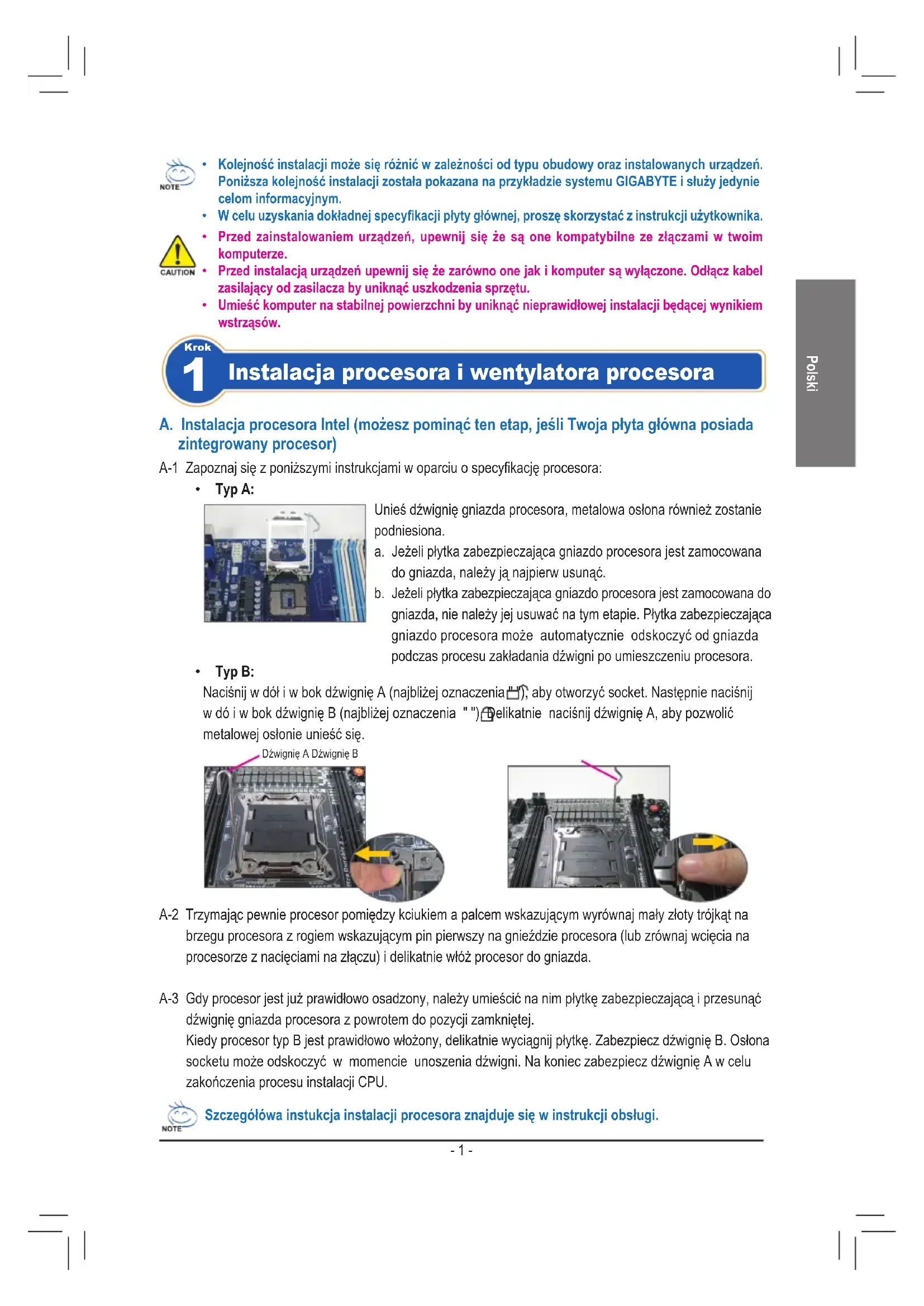 - Typ B: Naciśnij w dół i w bok dźwignię A (najbliżej oznaczenia " "), aby otworzyć socket. Następnie naciśnij w dó i w bok dźwignię B (najbliżej oznaczenia " "). Delikatnie naciśnij dźwignię A, aby pozwolić metalowej osłonie unieść się. A-1 Zapoznaj się z poniższymi instrukcjami w oparciu o specykację procesora: