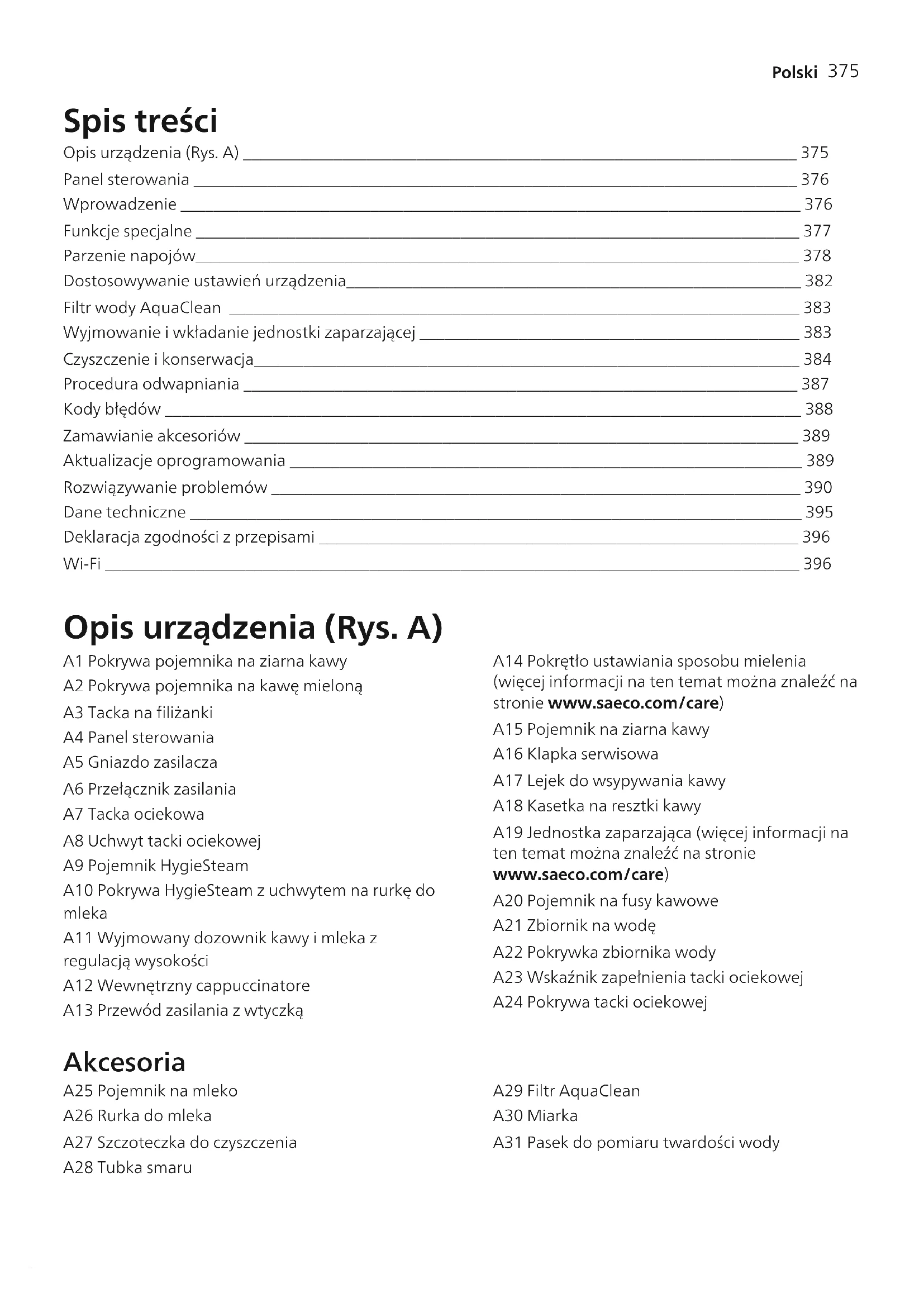 Polski Spis treści Opis urządzenia (Rys. A) ___________________________________________________________________ 375 Panel sterowania _________________________________________________________________________ 376 Wprowadzenie ___________________________________________________________________________ 376 Funkcje specjalne _________________________________________________________________________ 377 Parzenie napojów_________________________________________________________________________ 378 Dostosowywanie ustawień urządzenia_______________________________________________________ 382 Filtr wody AquaClean _____________________________________________________________________ 383 Wyjmowanie i wkładanie jednostki zaparzającej ______________________________________________ 383 Czyszczenie i konserwacja__________________________________________________________________ 384 Procedura odwapniania ___________________________________________________________________ 387 Kody błędów _____________________________________________________________________________ 388 Zamawianie akcesoriów ___________________________________________________________________ 389 Aktualizacje oprogramowania ______________________________________________________________ 389 Rozwiązywanie problemów ________________________________________________________________ 390 Dane techniczne __________________________________________________________________________ 395 Deklaracja zgodności z przepisami __________________________________________________________ 396 Wi-Fi ____________________________________________________________________________________ 396 Opis urządzenia (Rys. A) A1 Pokrywa pojemnika na ziarna kawy A2 Pokrywa pojemnika na kawę mieloną A3 Tacka na filiżanki A4 Panel sterowania A5 Gniazdo zasilacza A6 Przełącznik zasilania A7 Tacka ociekowa A8 Uchwyt tacki ociekowej A9 Pojemnik HygieSteam A10 Pokrywa HygieSteam z uchwytem na rurkę do mleka A11 Wyjmowany dozownik kawy i mleka z regulacją wysokości A12 Wewnętrzny cappuccinatore A13 Przewód zasilania z wtyczką A14 Pokrętło ustawiania sposobu mielenia (więcej informacji na ten temat można znaleźć na stronie www.saeco.com/care) A15 Pojemnik na ziarna kawy A16 Klapka serwisowa A17 Lejek do wsypywania kawy A18 Kasetka na resztki kawy A19 Jednostka zaparzająca (więcej informacji na ten temat można znaleźć na stronie www.saeco.com/care) A20 Pojemnik na fusy kawowe A21 Zbiornik na wodę A22 Pokrywka zbiornika wody A23 Wskaźnik zapełnienia tacki ociekowej A24 Pokrywa tacki ociekowej Akcesoria A25 Pojemnik na mleko A26 Rurka do mleka A27 Szczoteczka do czyszczenia A28 Tubka smaru A29 Filtr AquaClean A30 Miarka A31 Pasek do pomiaru twardości wody376 Polski Panel sterowania Istnieją dwie wersje tego urządzenia do kawy. Ich panele sterowania różnią się wyglądem, ale wszystkie ikony działają w ten sam sposób. Przegląd wszystkich ikon zamieszczono na rysunkach B i C. Poniżej można znaleźć ich opisy. B1 Off icon (B1 Ikona wyłącznika) C1 On/off icon (C1 Ikona wyłącznika) B2/C2 Drinks (B2/C2 Napoje) B3/C3 Drinks menuc (B3/C3 Menu Drinks (Napoje)) B4/C4 Personal profiles (B4/C4 Profile osobiste) B5/C5 Ziarna B6/C6 Machine settings (B6/C6 Ustawienia urządzenia) B7/C7 Status menu (B7/C7 Menu Status (Stan)) B8/C8 Sklep B9/C9 Start/stop icon (B9/C9 Ikona uruchomienia/zatrzymania ) Wprowadzenie Gratulujemy zakupu w pełni automatycznego ekspresu do kawy firmy Saeco! Aby w pełni skorzystać ze wsparcia online oferowanego przez Saeco, możesz użyć panelu sterowania, aby zarejestrować urządzenie za pośrednictwem wbudowanego modułu Wi-Fi lub przejść do strony www.saeco.com/MyCoffeeMachine i zarejestrować tam swój produkt. Przed skorzystaniem z urządzenia po raz pierwszy zapoznaj się dokładnie z osobną broszurą na temat bezpieczeństwa i zachowaj ją na przyszłość. W pełni automatyczny ekspres do kawy Saeco umożliwia połączenie z siecią Wi-Fi, aby zapewnić Ci większą przyjemność z parzenia i picia kawy. Dzięki podłączeniu ekspresu do sieci Wi-Fi, możesz: