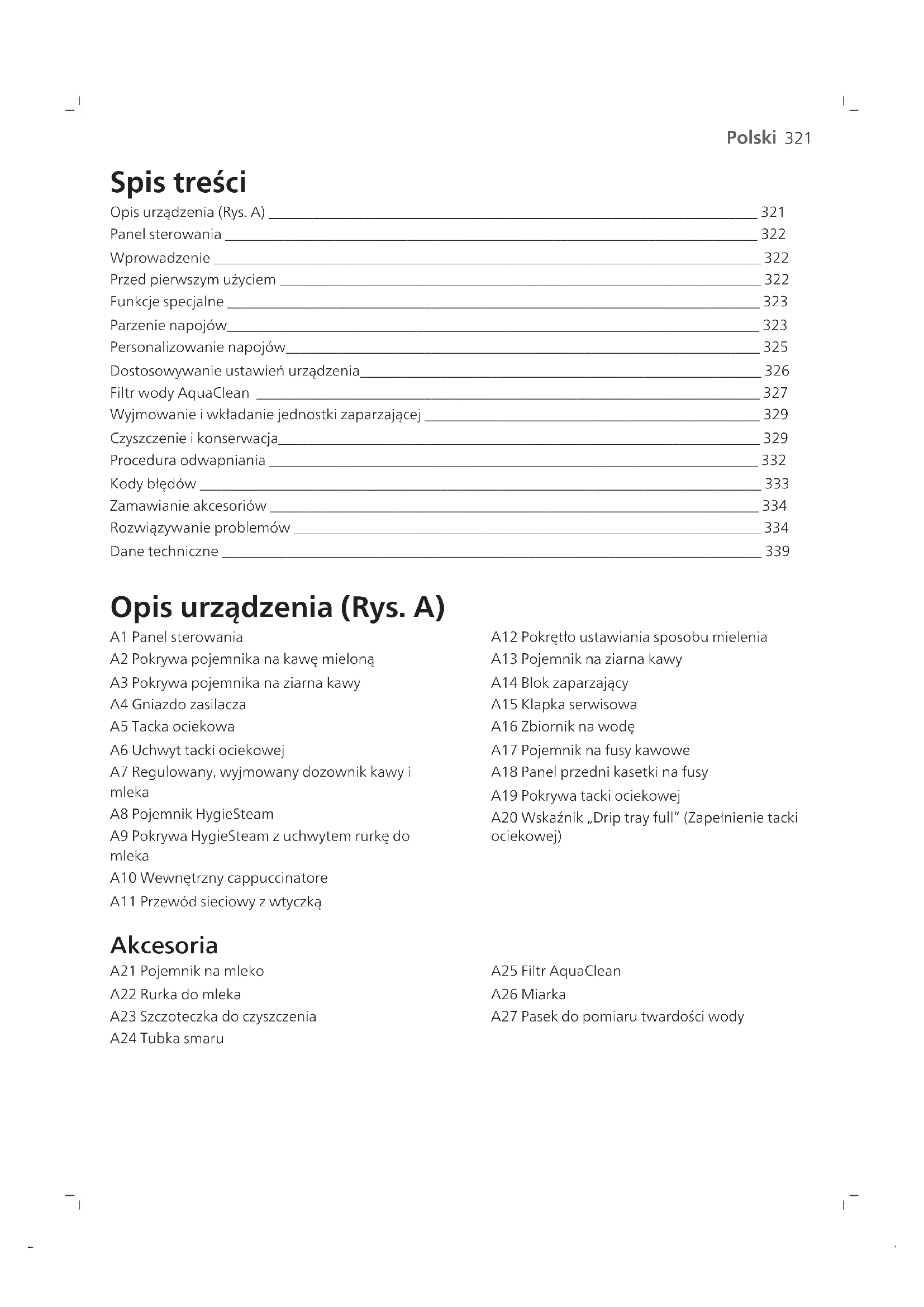 Polski Spis treści Opis urządzenia (Rys. A) ___________________________________________________________________ 321 Panel sterowania _________________________________________________________________________ 322 Wprowadzenie ___________________________________________________________________________ 322 Przed pierwszym użyciem __________________________________________________________________ 322 Funkcje specjalne _________________________________________________________________________ 323 Parzenie napojów_________________________________________________________________________ 323 Personalizowanie napojów_________________________________________________________________ 325 Dostosowywanie ustawień urządzenia_______________________________________________________ 326 Filtr wody AquaClean _____________________________________________________________________ 327 Wyjmowanie i wkładanie jednostki zaparzającej ______________________________________________ 329 Czyszczenie i konserwacja__________________________________________________________________ 329 Procedura odwapniania ___________________________________________________________________ 332 Kody błędów _____________________________________________________________________________ 333 Zamawianie akcesoriów ___________________________________________________________________ 334 Rozwiązywanie problemów ________________________________________________________________ 334 Dane techniczne __________________________________________________________________________ 339 Opis urządzenia (Rys. A) A1 Panel sterowania A2 Pokrywa pojemnika na kawę mieloną A3 Pokrywa pojemnika na ziarna kawy A4 Gniazdo zasilacza A5 Tacka ociekowa A6 Uchwyt tacki ociekowej A7 Regulowany, wyjmowany dozownik kawy i mleka A8 Pojemnik HygieSteam A9 Pokrywa HygieSteam z uchwytem rurkę do mleka A10 Wewnętrzny cappuccinatore A11 Przewód sieciowy z wtyczką A12 Pokrętło ustawiania sposobu mielenia A13 Pojemnik na ziarna kawy A14 Blok zaparzający A15 Klapka serwisowa A16 Zbiornik na wodę A17 Pojemnik na fusy kawowe A18 Panel przedni kasetki na fusy A19 Pokrywa tacki ociekowej A20 Wskaźnik „Drip tray full” (Zapełnienie tacki ociekowej) Akcesoria A21 Pojemnik na mleko A22 Rurka do mleka A23 Szczoteczka do czyszczenia A24 Tubka smaru A25 Filtr AquaClean A26 Miarka A27 Pasek do pomiaru twardości wody322 Polski Panel sterowania Istnieją dwie wersje tego urządzenia do kawy. Ich panele sterowania różnią się wyglądem, ale ich przyciski i ikony działają w ten sam sposób. Przegląd wszystkich przycisków i ikon zamieszczono na rysunku B. Poniżej można znaleźć ich opis. Strzałki w górę i w dół służą do przewijania na wyświetlaczu. Dotykając ikony OK, można dokonać wyboru lub potwierdzić wybraną opcję. B1 Wyłącznik B2 Ikony napojów B3 Ikona CoffeeMaestro B4 Menu dodatkowych napojów B5 Przycisk uruchomienia/zatrzymania B6 Ikony nawigacyjne (w górę, w dół, wstecz, OK) B7 Wyświetlacz B8 Ustawienia urządzenia B9 Menu Cleaning (Czyszczenie) B10 Profile osobiste Wprowadzenie Gratulujemy zakupu w pełni automatycznego ekspresu do kawy firmy Saeco! Aby w pełni skorzystać z oferowanej przez firmę Saeco pomocy online, zarejestruj swój produkt, przechodząc na stronę www.saeco.com/MyCoffeeMachine. Uwaga: To urządzenie zostało przetestowane przy użyciu kawy. Wprawdzie zostało gruntowanie oczyszczone, ale w środku mogły pozostać resztki kawy. Gwarantujemy jednak, że urządzenie jest całkowicie nowe. Przed pierwszym użyciem