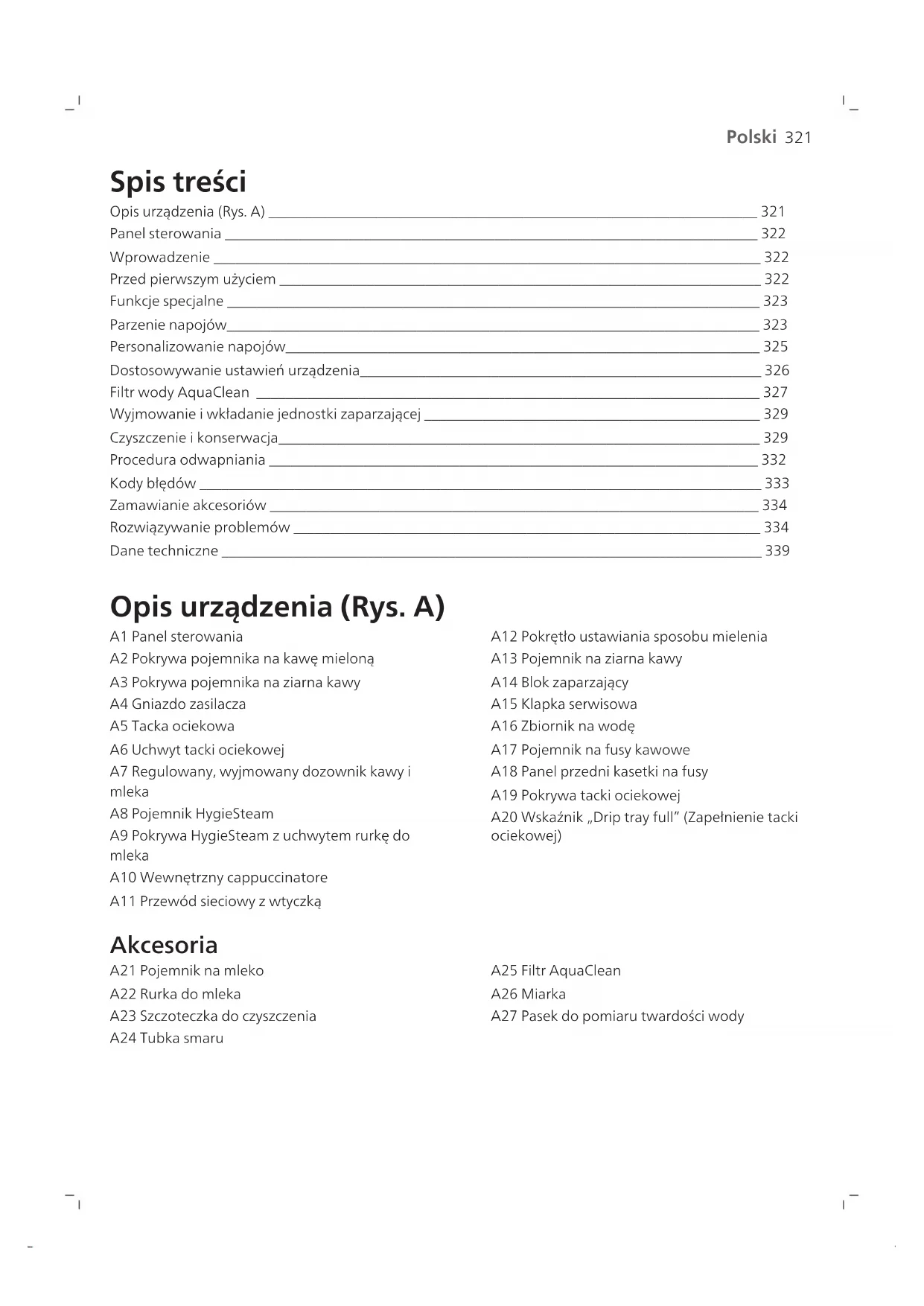 Polski Spis treści Opis urządzenia (Rys. A) ___________________________________________________________________ 321 Panel sterowania _________________________________________________________________________ 322 Wprowadzenie ___________________________________________________________________________ 322 Przed pierwszym użyciem __________________________________________________________________ 322 Funkcje specjalne _________________________________________________________________________ 323 Parzenie napojów_________________________________________________________________________ 323 Personalizowanie napojów_________________________________________________________________ 325 Dostosowywanie ustawień urządzenia_______________________________________________________ 326 Filtr wody AquaClean _____________________________________________________________________ 327 Wyjmowanie i wkładanie jednostki zaparzającej ______________________________________________ 329 Czyszczenie i konserwacja__________________________________________________________________ 329 Procedura odwapniania ___________________________________________________________________ 332 Kody błędów _____________________________________________________________________________ 333 Zamawianie akcesoriów ___________________________________________________________________ 334 Rozwiązywanie problemów ________________________________________________________________ 334 Dane techniczne __________________________________________________________________________ 339 Opis urządzenia (Rys. A) A1 Panel sterowania A2 Pokrywa pojemnika na kawę mieloną A3 Pokrywa pojemnika na ziarna kawy A4 Gniazdo zasilacza A5 Tacka ociekowa A6 Uchwyt tacki ociekowej A7 Regulowany, wyjmowany dozownik kawy i mleka A8 Pojemnik HygieSteam A9 Pokrywa HygieSteam z uchwytem rurkę do mleka A10 Wewnętrzny cappuccinatore A11 Przewód sieciowy z wtyczką A12 Pokrętło ustawiania sposobu mielenia A13 Pojemnik na ziarna kawy A14 Blok zaparzający A15 Klapka serwisowa A16 Zbiornik na wodę A17 Pojemnik na fusy kawowe A18 Panel przedni kasetki na fusy A19 Pokrywa tacki ociekowej A20 Wskaźnik „Drip tray full” (Zapełnienie tacki ociekowej) Akcesoria A21 Pojemnik na mleko A22 Rurka do mleka A23 Szczoteczka do czyszczenia A24 Tubka smaru A25 Filtr AquaClean A26 Miarka A27 Pasek do pomiaru twardości wody322 Polski Panel sterowania Istnieją dwie wersje tego urządzenia do kawy. Ich panele sterowania różnią się wyglądem, ale ich przyciski i ikony działają w ten sam sposób. Przegląd wszystkich przycisków i ikon zamieszczono na rysunku B. Poniżej można znaleźć ich opis. Strzałki w górę i w dół służą do przewijania na wyświetlaczu. Dotykając ikony OK, można dokonać wyboru lub potwierdzić wybraną opcję. B1 Wyłącznik B2 Ikony napojów B3 Ikona CoffeeMaestro B4 Menu dodatkowych napojów B5 Przycisk uruchomienia/zatrzymania B6 Ikony nawigacyjne (w górę, w dół, wstecz, OK) B7 Wyświetlacz B8 Ustawienia urządzenia B9 Menu Cleaning (Czyszczenie) B10 Profile osobiste Wprowadzenie Gratulujemy zakupu w pełni automatycznego ekspresu do kawy firmy Saeco! Aby w pełni skorzystać z oferowanej przez firmę Saeco pomocy online, zarejestruj swój produkt, przechodząc na stronę www.saeco.com/MyCoffeeMachine. Uwaga: To urządzenie zostało przetestowane przy użyciu kawy. Wprawdzie zostało gruntowanie oczyszczone, ale w środku mogły pozostać resztki kawy. Gwarantujemy jednak, że urządzenie jest całkowicie nowe. Przed pierwszym użyciem