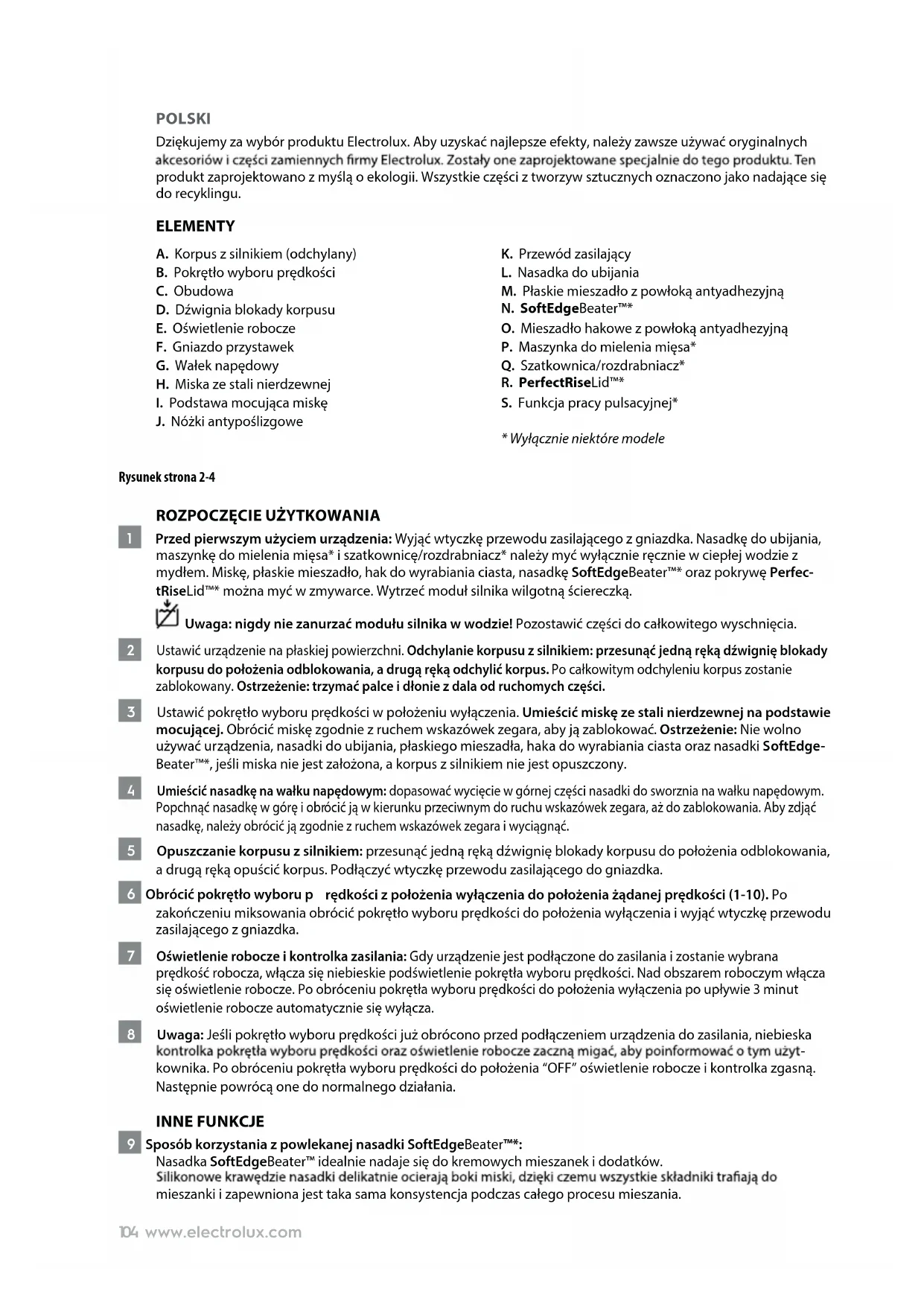 BG104 www.electrolux.com POLSKI Dziękujemy za wybór produktu Electrolux. Aby uzyskać najlepsze efekty, należy zawsze używać oryginalnych produkt zaprojektowano z myślą o ekologii. Wszystkie części z tworzyw sztucznych oznaczono jako nadające się do recyklingu. ELEMENTY A. Korpus z silnikiem (odchylany) B. Pokrętło wyboru prędkości C. Obudowa D. Dźwignia blokady korpusu E. Oświetlenie robocze F. Gniazdo przystawek G. Wałek napędowy H. Miska ze stali nierdzewnej