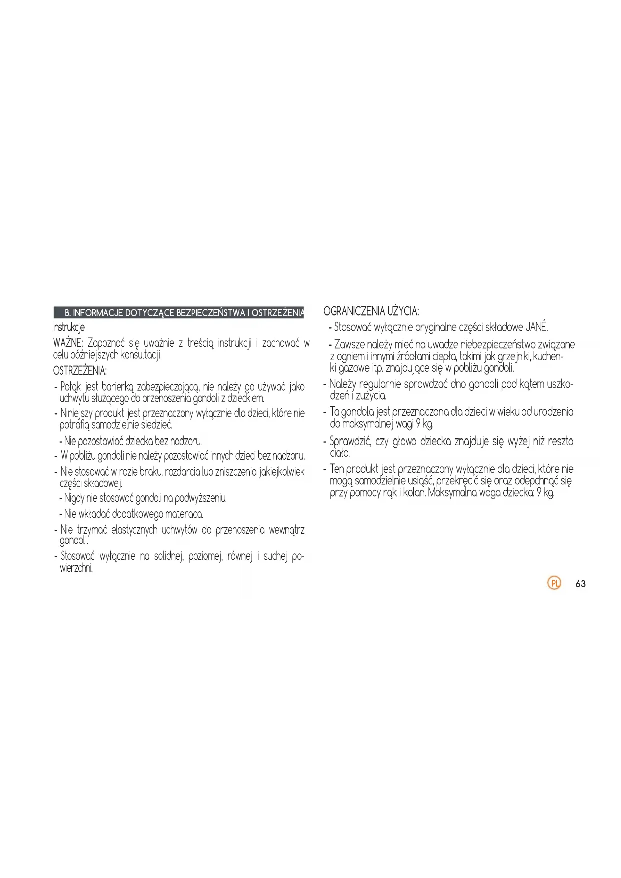 B. INFORMACJE DOTYCZĄCE BEZPIECZEŃSTWA I OSTRZEŻENIA Instrukcje WAŻNE: Zapoznać się uważnie z treścią instrukcji i zachować w celu późniejszych konsultacji. OSTRZEŻENIA: - Pałąk jest barierką zabezpieczającą, nie należy go używać jako uchwytu służącego do przenoszenia gondoli z dzieckiem. - Niniejszy produkt jest przeznaczony wyłącznie dla dzieci, które nie potraą samodzielnie siedzieć. - Nie pozostawiać dziecka bez nadzoru. - W pobliżu gondoli nie należy pozostawiać innych dzieci bez nadzoru. - Nie stosować w razie braku, rozdarcia lub zniszczenia jakiejkolwiek części składowej. - Nigdy nie stosować gondoli na podwyższeniu. - Nie wkładać dodatkowego materaca. - Nie trzymać elastycznych uchwytów do przenoszenia wewnątrz gondoli. - Stosować wyłącznie na solidnej, poziomej, równej i suchej po- wierzchni. OGRANICZENIA UŻYCIA: - Stosować wyłącznie oryginalne części składowe JANÉ. - Zawsze należy mieć na uwadze niebezpieczeństwo związane z ogniem i innymi źródłami ciepła, takimi jak grzejniki, kuchen- ki gazowe itp. znajdujące się w pobliżu gondoli. - Należy regularnie sprawdzać dno gondoli pod kątem uszko- dzeń i zużycia. - Ta gondola jest przeznaczona dla dzieci w wieku od urodzenia do maksymalnej wagi 9 kg. - Sprawdzić, czy głowa dziecka znajduje się wyżej niż reszta ciała. - Ten produkt jest przeznaczony wyłącznie dla dzieci, które nie mogą samodzielnie usiąść, przekręcić się oraz odepchnąć się przy pomocy rąk i kolan. Maksymalna waga dziecka: 9 kg. IM 1987,04 MICRO BB ins janeworld.indd 63 12/7/21 10:56PL