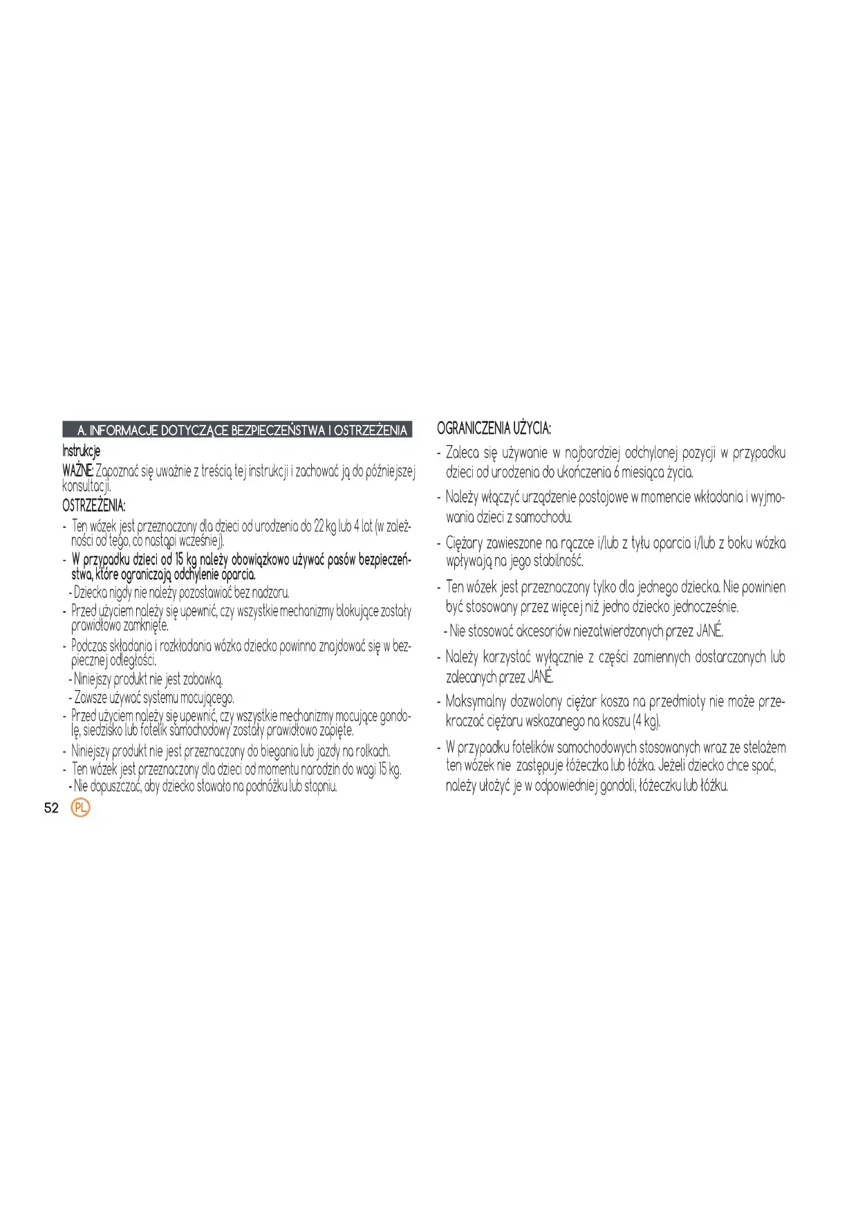 A. INFORMACJE DOTYCZĄCE BEZPIECZEŃSTWA I OSTRZEŻENIA Instrukcje WAŻNE: Zapoznać się uważnie z treścią tej instrukcji i zachować ją do późniejszej konsultacji. OSTRZEŻENIA: - Ten wózek jest przeznaczony dla dzieci od urodzenia do 22 kg lub 4 lat (w zależ- ności od tego, co nastąpi wcześniej). - W przypadku dzieci od 15 kg należy obowiązkowo używać pasów bezpieczeń- stwa, które ograniczają odchylenie oparcia. - Dziecka nigdy nie należy pozostawiać bez nadzoru. - Przed użyciem należy się upewnić, czy wszystkie mechanizmy blokujące zostały prawidłowo zamknięte. - Podczas składania i rozkładania wózka dziecko powinno znajdować się w bez- piecznej odległości. - Niniejszy produkt nie jest zabawką. - Zawsze używać systemu mocującego. - Przed użyciem należy się upewnić, czy wszystkie mechanizmy mocujące gondo- lę, siedzisko lub fotelik samochodowy zostały prawidłowo zapięte. - Niniejszy produkt nie jest przeznaczony do biegania lub jazdy na rolkach. - Ten wózek jest przeznaczony dla dzieci od momentu narodzin do wagi 15 kg. - Nie dopuszczać, aby dziecko stawało na podnóżku lub stopniu. OGRANICZENIA UŻYCIA: - Zaleca się używanie w najbardziej odchylonej pozycji w przypadku dzieci od urodzenia do ukończenia 6 miesiąca życia. - Należy włączyć urządzenie postojowe w momencie wkładania i wyjmo- wania dzieci z samochodu. - Ciężary zawieszone na rączce i/lub z tyłu oparcia i/lub z boku wózka wpływają na jego stabilność. - Ten wózek jest przeznaczony tylko dla jednego dziecka. Nie powinien być stosowany przez więcej niż jedno dziecko jednocześnie. - Nie stosować akcesoriów niezatwierdzonych przez JANÉ. - Należy korzystać wyłącznie z części zamiennych dostarczonych lub zalecanych przez JANÉ. - Maksymalny dozwolony ciężar kosza na przedmioty nie może prze- kraczać ciężaru wskazanego na koszu (4 kg). - W przypadku fotelików samochodowych stosowanych wraz ze stelażem ten wózek nie zastępuje łóżeczka lub łóżka. Jeżeli dziecko chce spać, należy ułożyć je w odpowiedniej gondoli, łóżeczku lub łóżku.53