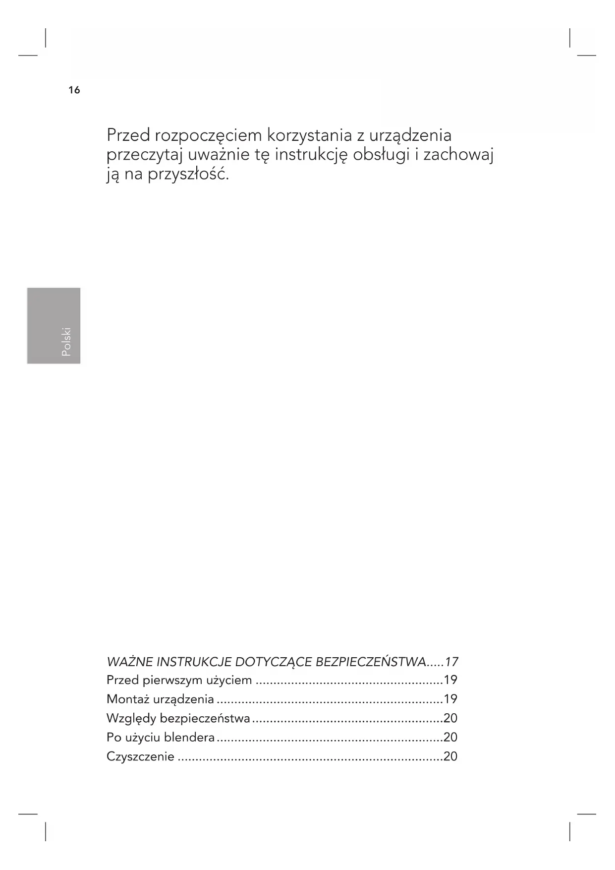 - Nigdy nie pozostawiaj bez nadzoru blendera podłączonego do sieci elektrycznej! Zawsze wyciągaj wtyczkę z gniazdka, kiedy nie używasz urządzenia, nawet przez krótką chwilę.18 Polski