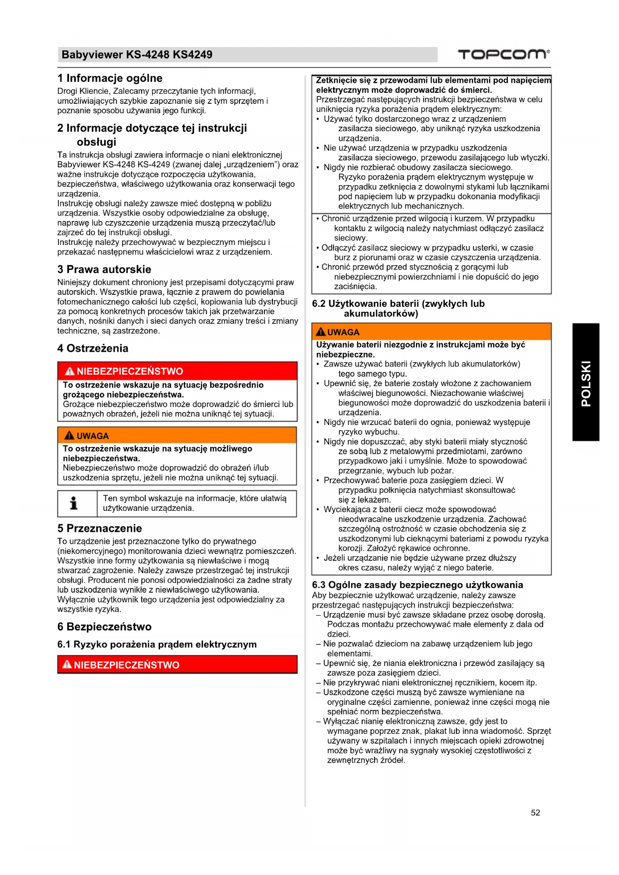 POLSKI 1 Informacje ogólne Drogi Kliencie, Zalecamy przeczytanie tych informacji, umożliwiających szybkie zapoznanie się z tym sprzętem i poznanie sposobu używania jego funkcji. 2 Informacje dotyczące tej instrukcji obsługi Ta instrukcja obsługi zawiera informacje o niani elektronicznej Babyviewer KS-4248 KS-4249 (zwanej dalej „urządzeniem”) oraz ważne instrukcje dotyczące rozpoczęcia użytkowania, bezpieczeństwa, właściwego użytkowania oraz konserwacji tego urządzenia. Instrukcję obsługi należy zawsze mieć dostępną w pobliżu urządzenia. Wszystkie osoby odpowiedzialne za obsługę, naprawę lub czyszczenie urządzenia muszą przeczytać/lub zajrzeć do tej instrukcji obsługi. Instrukcję należy przechowywać w bezpiecznym miejscu i przekazać następnemu właścicielowi wraz z urządzeniem. 3 Prawa autorskie Niniejszy dokument chroniony jest przepisami dotyczącymi praw autorskich. Wszystkie prawa, łącznie z prawem do powielania fotomechanicznego całości lub części, kopiowania lub dystrybucji za pomocą konkretnych procesów takich jak przetwarzanie danych, nośniki danych i sieci danych oraz zmiany treści i zmiany techniczne, są zastrzeżone. 4 Ostrzeżenia 5 Przeznaczenie To urządzenie jest przeznaczone tylko do prywatnego (niekomercyjnego) monitorowania dzieci wewnątrz pomieszczeń. Wszystkie inne formy użytkowania są niewłaściwe i mogą stwarzać zagrożenie. Należy zawsze przestrzegać tej instrukcji obsługi. Producent nie ponosi odpowiedzialności za żadne straty lub uszkodzenia wynikłe z niewłaściwego użytkowania. Wyłącznie użytkownik tego urządzenia jest odpowiedzialny za wszystkie ryzyka. 6 Bezpieczeństwo