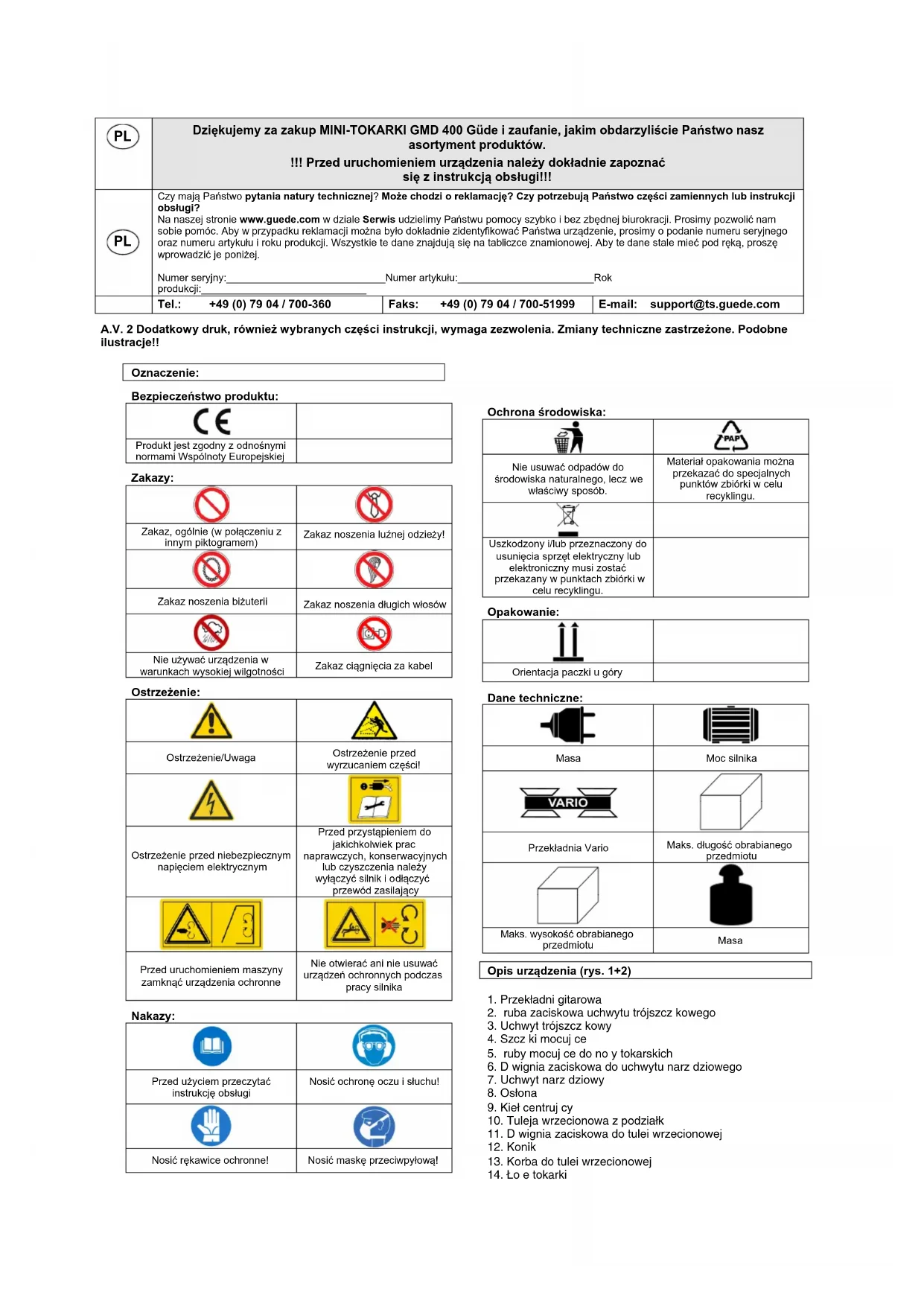 Czy mają Państwo pytania natury technicznej? Może chodzi o reklamację? Czy potrzebują Państwo części zamiennych lub instrukcji obsługi? Na naszej stronie www.guede.com w dziale Serwis udzielimy Państwu pomocy szybko i bez zbędnej biurokracji. Prosimy pozwolić nam sobie pomóc. Aby w przypadku reklamacji można było dokładnie zidentyfikować Państwa urządzenie, prosimy o podanie numeru seryjnego oraz numeru artykułu i roku produkcji. Wszystkie te dane znajdują się na tabliczce znamionowej. Aby te dane stale mieć pod ręką, proszę wprowadzić je poniżej. Numer seryjny:____________________________Numer artykułu:________________________Rok produkcji:_____________________________ Tel.: +49 (0) 79 04 / 700-360 Faks: +49 (0) 79 04 / 700-51999 E-mail: support@ts.guede.com A.V. 2 Dodatkowy druk, również wybranych części instrukcji, wymaga zezwolenia. Zmiany techniczne zastrzeżone. Podobne ilustracje!! Oznaczenie: Bezpieczeństwo produktu: