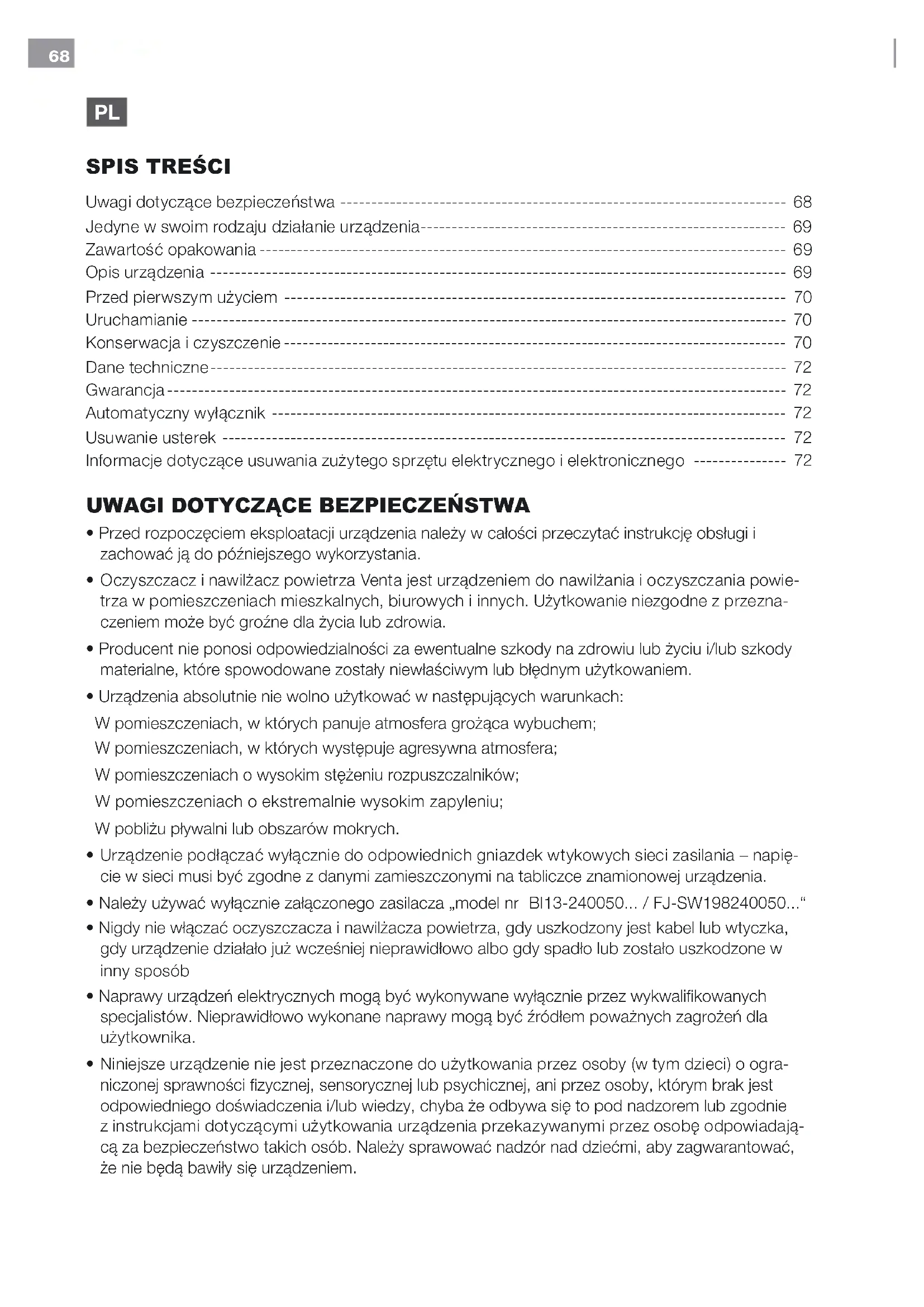 - Oczyszczacz i nawilżacz powietrza Venta jest urządzeniem do nawilżania i oczyszczania powie- trza w pomieszczeniach mieszkalnych, biurowych i innych. Użytkowanie niezgodne z przezna- czeniem może być groźne dla życia lub zdrowia.