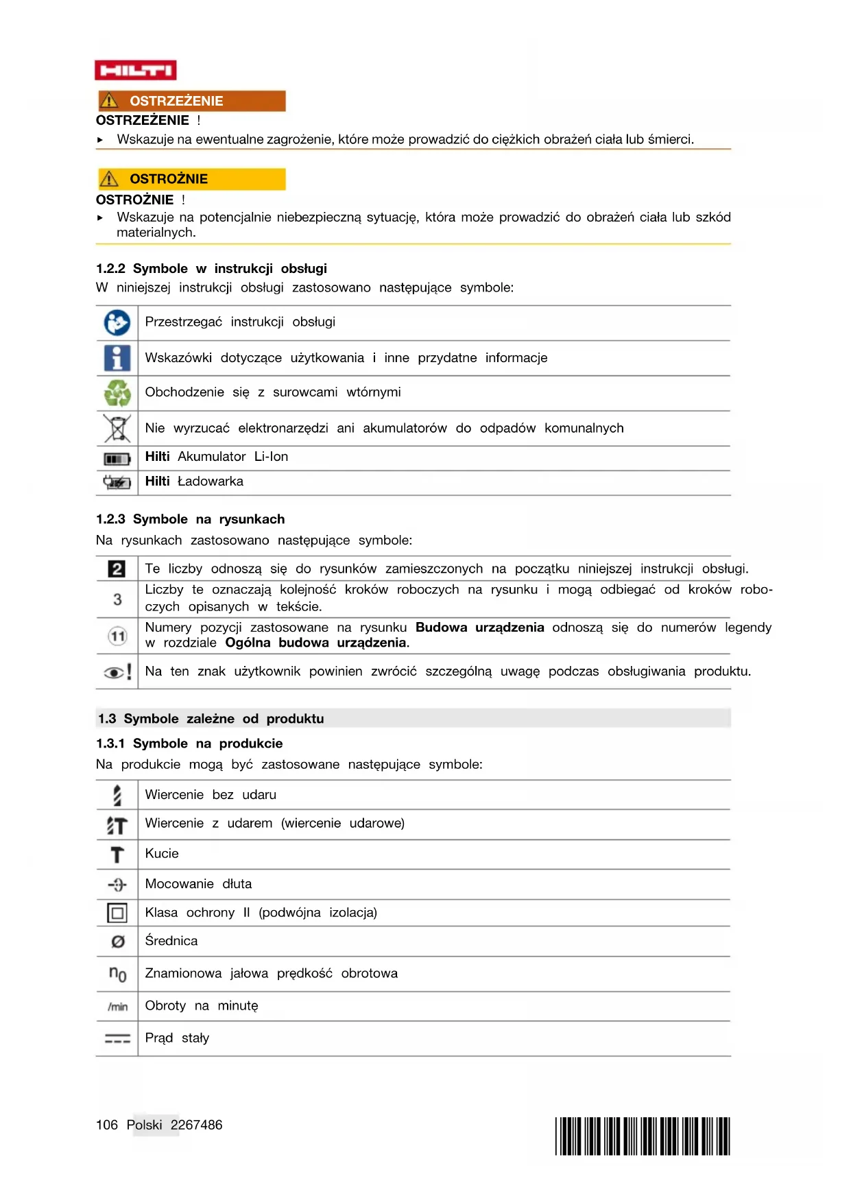 W niniejszej instrukcji obsługi zastosowano następujące symbole: Przestrzegać instrukcji obsługi Wskazówki dotyczące użytkowania i inne przydatne informacje Obchodzenie się z surowcami wtórnymi Nie wyrzucać elektronarzędzi ani akumulatorów do odpadów komunalnych Hilti Akumulator LiIon Hilti Ładowarka