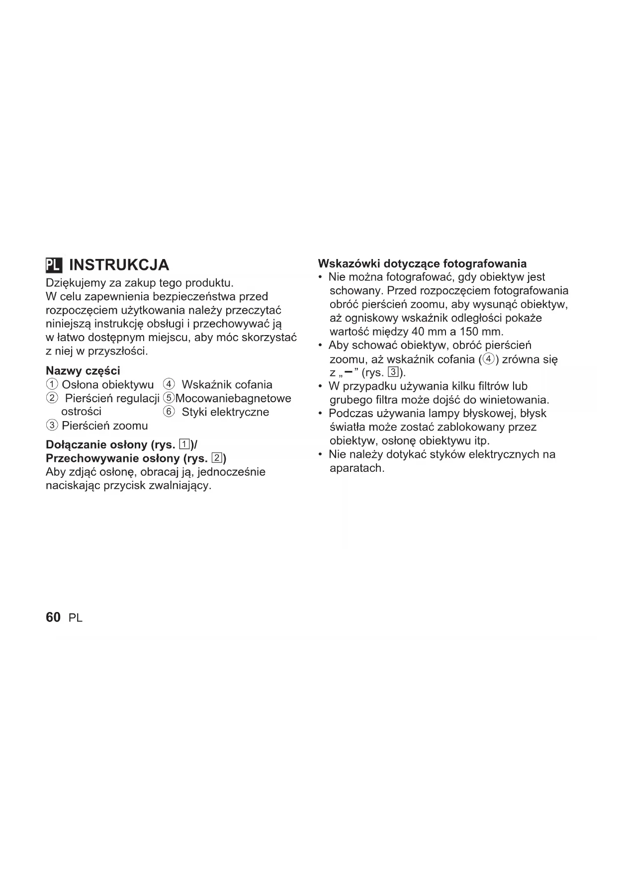 - Ikke rett kameralinsen mot solen. Sollys vil samles i linsen og fokuseres i kameraet, noe som kan føre til defekter eller brann. Micro Four Thirds og Micro Four Thirds-logoen er varemerker eller registrerte varemerker for OM Digital Solutions Corporation.NO 59 Produsenten er ikke ansvarlig for brudd på lokale regler når dette produktet blir tatt i bruk utenfor landet eller regionen det ble solgt i. Programvaren i dette objektivet kan inneholde tredjeparts programvare. Eventuell tredjeparts programvare er underlagt vilkårene og betingelsene, pålagt av eierne eller lisensgivere av den programvaren, der programvare er gitt til deg. Disse vilkårene og andre tredjeparts programvare meldinger, om noen, kan finnes i programvarens varsel PDF-fil oppbevares ved https://cs.olympus-imaging.jp/en/support/imsg/ digicamera/download/notice/notice.cfm For kunder i Europa Dette symbolet [avfallskontainer med kryss over WEEE vedlegg IV] viser til separat avfallsbehandling for brukt elektrisk og elektronisk utstyr i EU-land.Ikke kast utstyret i vanlig husholdningsavfall. Levér det i stedet til gjenvinnings-systemet for denne type produkter i ditt land.60 PL INSTRUKCJA Dziękujemy za zakup tego produktu. W celu zapewnienia bezpieczeństwa przed rozpoczęciem użytkowania należy przeczytać niniejszą instrukcję obsługi i przechowywać ją w łatwo dostępnym miejscu, aby móc skorzystać z niej w przyszłości. Nazwyczęści 1 Osłona obiektywu 2 Pierścień regulacji ostrości 3 Pierścień zoomu 4 Wskaźnik cofania 5 Mocowanie bagnetowe 6 Styki elektryczne Dołączanieosłony(rys.1)/ Przechowywanieosłony(rys.2) Aby zdjąć osłonę, obracaj ją, jednocześnie naciskając przycisk zwalniający. Wskazówkidotyczącefotografowania