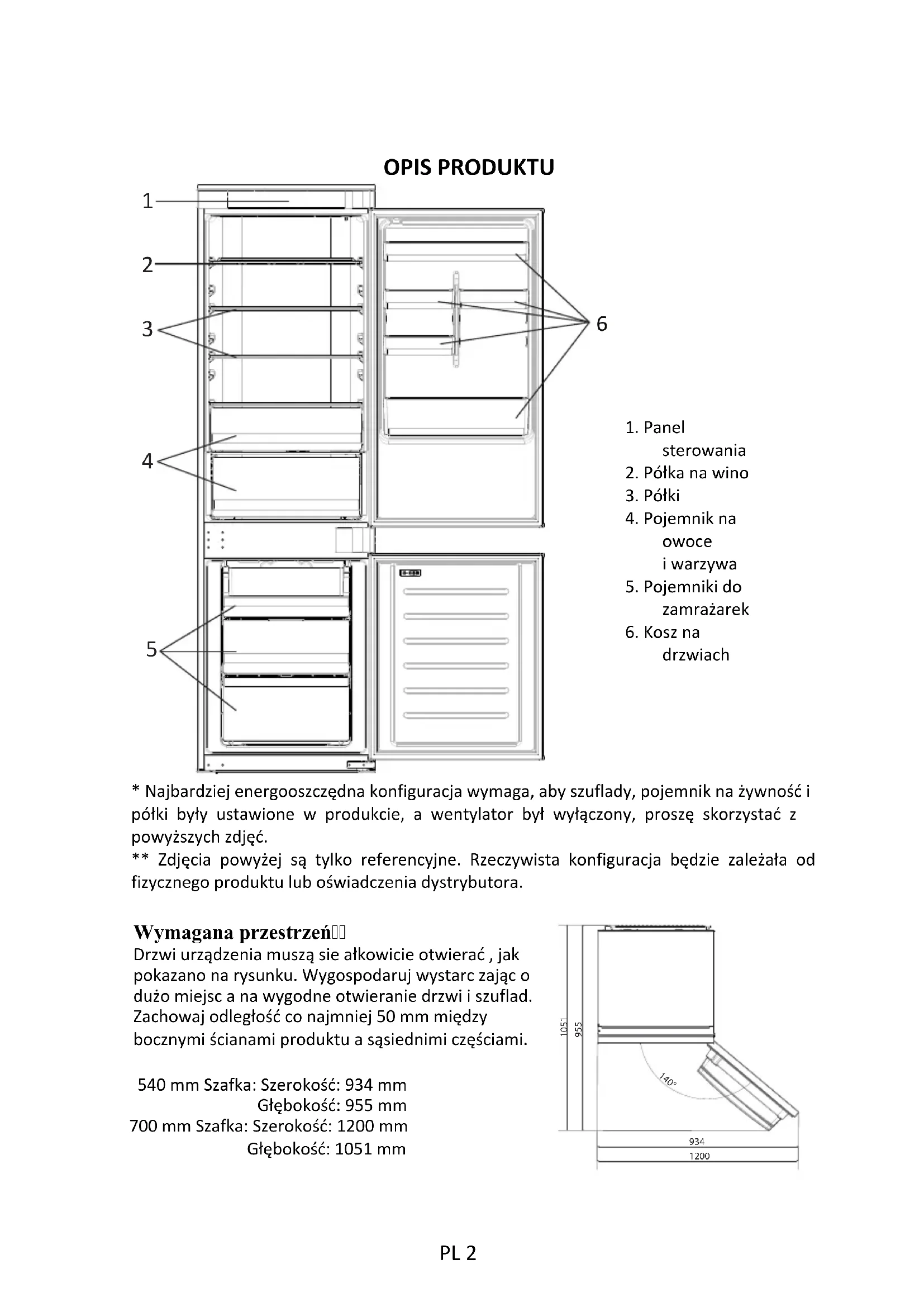 7OPIS PRODUKTU 1. Panelsterowania2. Półka na wino3. Półki4. Pojemnik naowocei warzywa5. Pojemniki dozamrażarek6. Kosz nadrzwiach* Najbardziej energooszczędna konfiguracja wymaga, aby szuflady, pojemnik na żywność ipółki były ustawione w produkcie, a wentylator był wyłączony, proszę skorzystać zpowyższych zdjęć.** Zdjęcia powyżej są tylko referencyjne. Rzeczywista konfiguracja będzie zależała odfizycznego produktu lub oświadczenia dystrybutora.Wymagana przestrzeńDrzwi urządzenia muszą sie ałkowicie otwierać , jak pokazano na rysunku. Wygospodaruj wystarc zając o dużo miejsc a na wygodne otwieranie drzwi i szuflad. Zachowaj odległość co najmniej 50 mm między bocznymi ścianami produktu a sąsiednimi częściami.540 mm Szafka: Szerokość: 934 mmGłębokość: 955 mm700 mm Szafka: Szerokość: 1200 mmGłębokość: 1051 mm