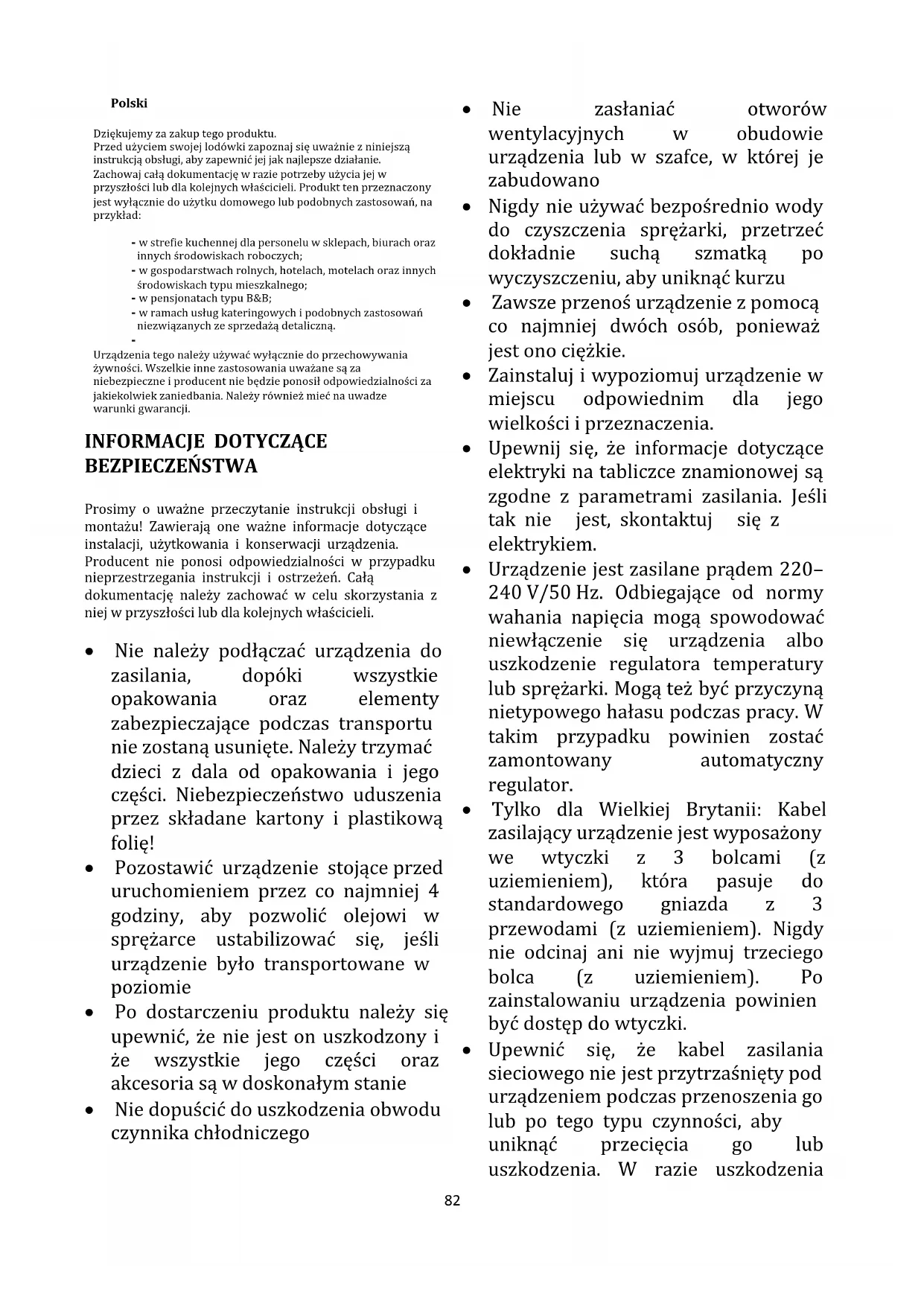 - Urządzenie jest zasilane prądem 220– 240 V/50 Hz. Odbiegające od normy wahania napięcia mogą spowodować niewłączenie się urządzenia albo uszkodzenie regulatora temperatury lub sprężarki. Mogą też być przyczyną nietypowego hałasu podczas pracy. W takim przypadku powinien zostać zamontowany automatyczny regulator.