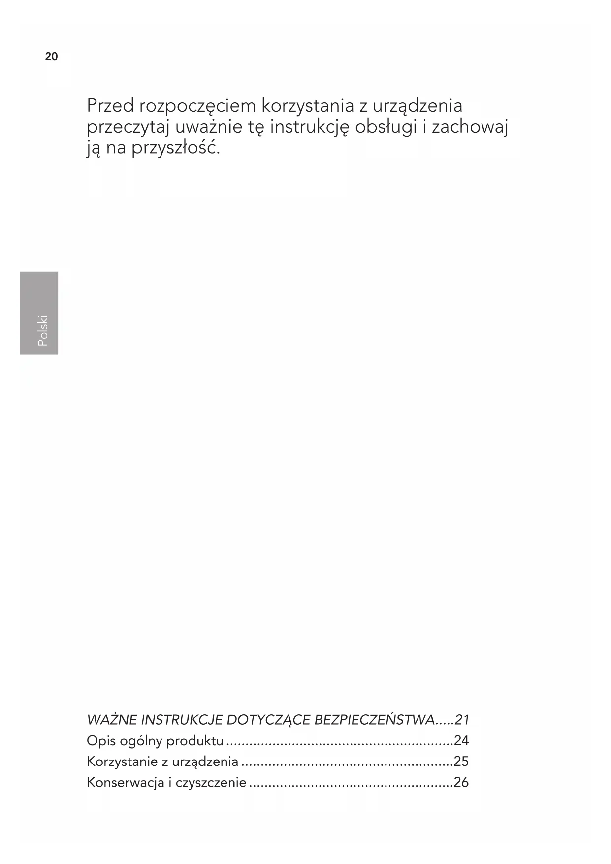 - To urządzenie może być używane przez dzieci od lat 8, pod warunkiem zapewnienia nadzoru lub udzielenia instrukcji dotyczących korzystania z urządzenia w bezpieczny sposób i o ile dziecko zdaje sobie sprawę z ewentualnych zagrożeń. Czynności związane z czyszczeniem oraz konserwacją w zakresie użytkownika nie powinny być wykonywane przez dzieci, chyba, że ukończyły 8 lat i pozostają pod nadzorem. Przechowuj urządzenie wraz z przewodem poza zasięgiem dzieci młodszych niż 8 lat.