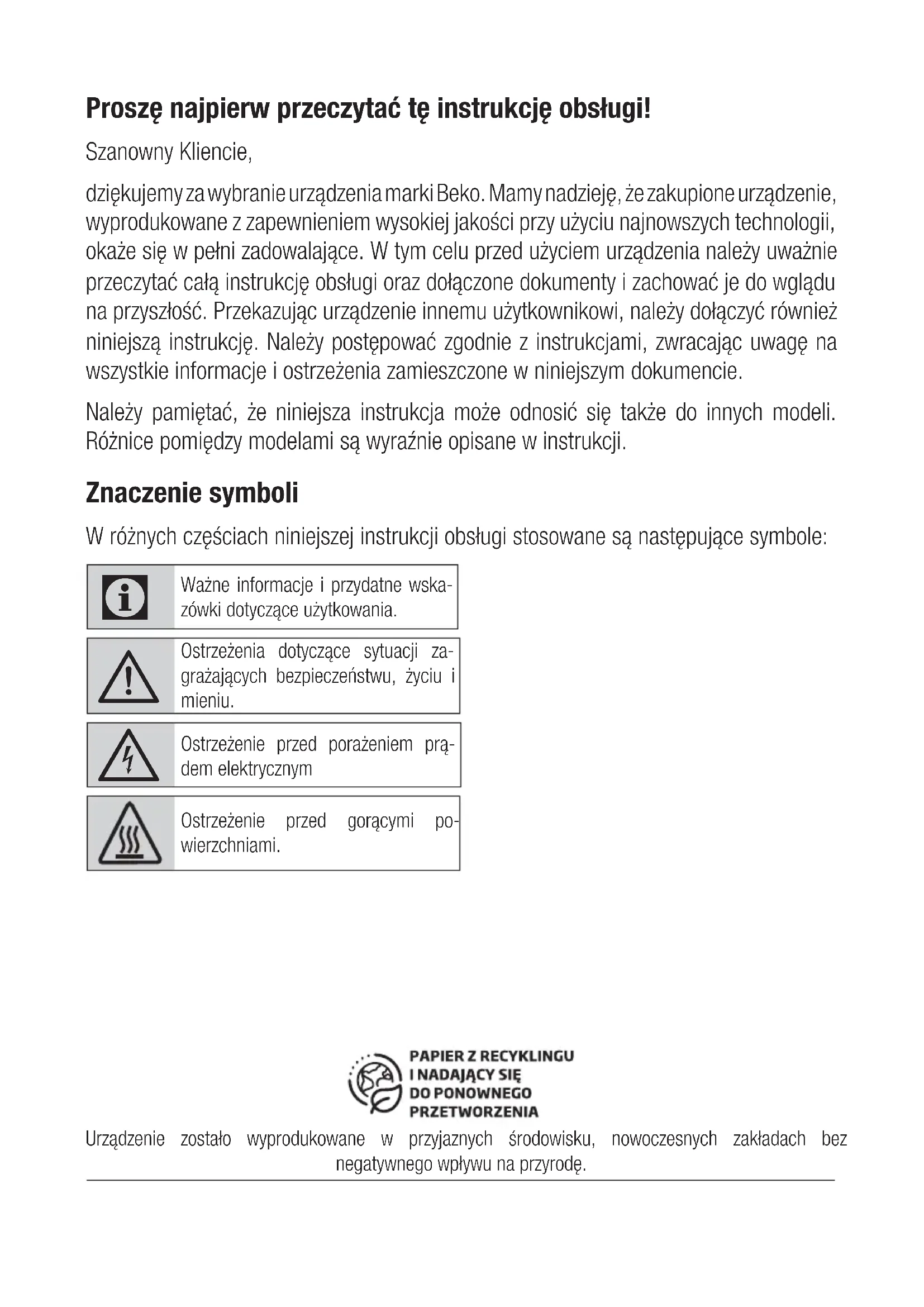 - záruka se nevztahuje na návštěvu technika za účelem poradenství, preventivní kontrolu stavu spotřebiče, výměnu náhradního dílu, který nevyžaduje odborný zásah, záměna směru otvírání dveří chladničekProszę najpierw przeczytać tę instrukcję obsługi! Szanowny Kliencie, dziękujemy za wybranie urządzenia marki Beko. Mamy nadzieję, że zakupione urządzenie, wyprodukowane z zapewnieniem wysokiej jakości przy użyciu najnowszych technologii, okaże się w pełni zadowalające. W tym celu przed użyciem urządzenia należy uważnie przeczytać całą instrukcję obsługi oraz dołączone dokumenty i zachować je do wglądu na przyszłość. Przekazując urządzenie innemu użytkownikowi, należy dołączyć również niniejszą instrukcję. Należy postępować zgodnie z instrukcjami, zwracając uwagę na wszystkie informacje i ostrzeżenia zamieszczone w niniejszym dokumencie. Należy pamiętać, że niniejsza instrukcja może odnosić się także do innych modeli. Różnice pomiędzy modelami są wyraźnie opisane w instrukcji. Znaczenie symboli W różnych częściach niniejszej instrukcji obsługi stosowane są następujące symbole: