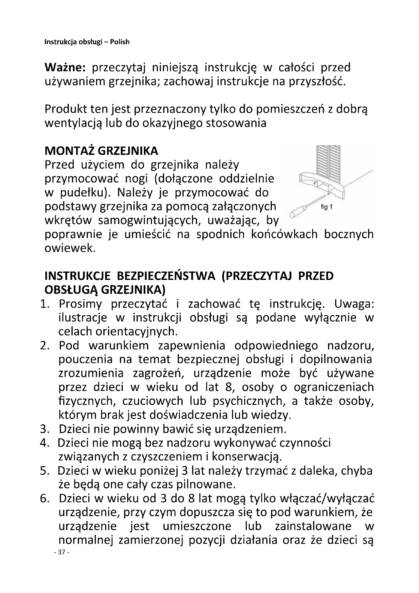 Voldoet aan de eisen van de Richtlijnen van de raad: VERORDENING (EU) Nr. 2015/1188 VAN DE COMMISSIE van 28 april 2015 en VERORDENING TOT WIJZIGING (EU) 2016/2282 VAN DE COMMISSIE ter uitvoering van Richtlijn 2009/125/EU van het Europees Parlement en de Raad betreffende de eisen inzake het ecologisch ontwerp voor toestellen voor lokale ruimteverwarming Voor informatie voor de consument over de installatie, de werking en het onderhoud van het product en de AEEA-informatie, raadpleeg de gebruiksaanwijzing die zich in de verpakking bevindt.- 37 - Instrukcja obsługi – Polish Ważne: przeczytaj niniejszą instrukcję w całości przed używaniem grzejnika; zachowaj instrukcje na przyszłość. Produkt ten jest przeznaczony tylko do pomieszczeń z dobrą wentylacją lub do okazyjnego stosowania MONTAŻ GRZEJNIKA Przed użyciem do grzejnika należy przymocować nogi (dołączone oddzielnie w pudełku). Należy je przymocować do podstawy grzejnika za pomocą załączonych wkrętów samogwintujących, uważając, by poprawnie je umieścić na spodnich końcówkach bocznych owiewek.
